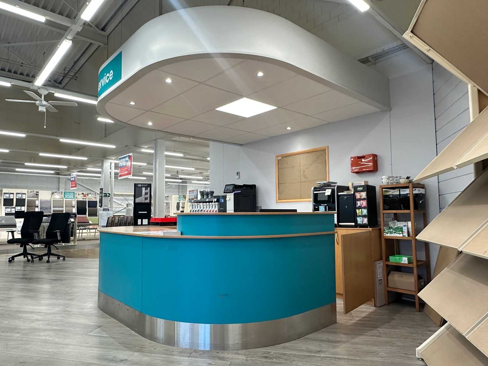Deze houten winkelbalie met achterwand wordt verkocht met bovenbouw aan het plafond. De inhoud hoort bij dit kavel met uitzondering van de computer, de printer en de koffiemachine. De afmeting van de achterwand is 300x58x88 cm (BxDxH). Afmeting van de bovenbouw is 300x300x48 cm (BxDxH) Totale afmeting L: 3000mm Totale afmeting Breedte: 1500mm Totale afmeting Hoogte: 1080mm