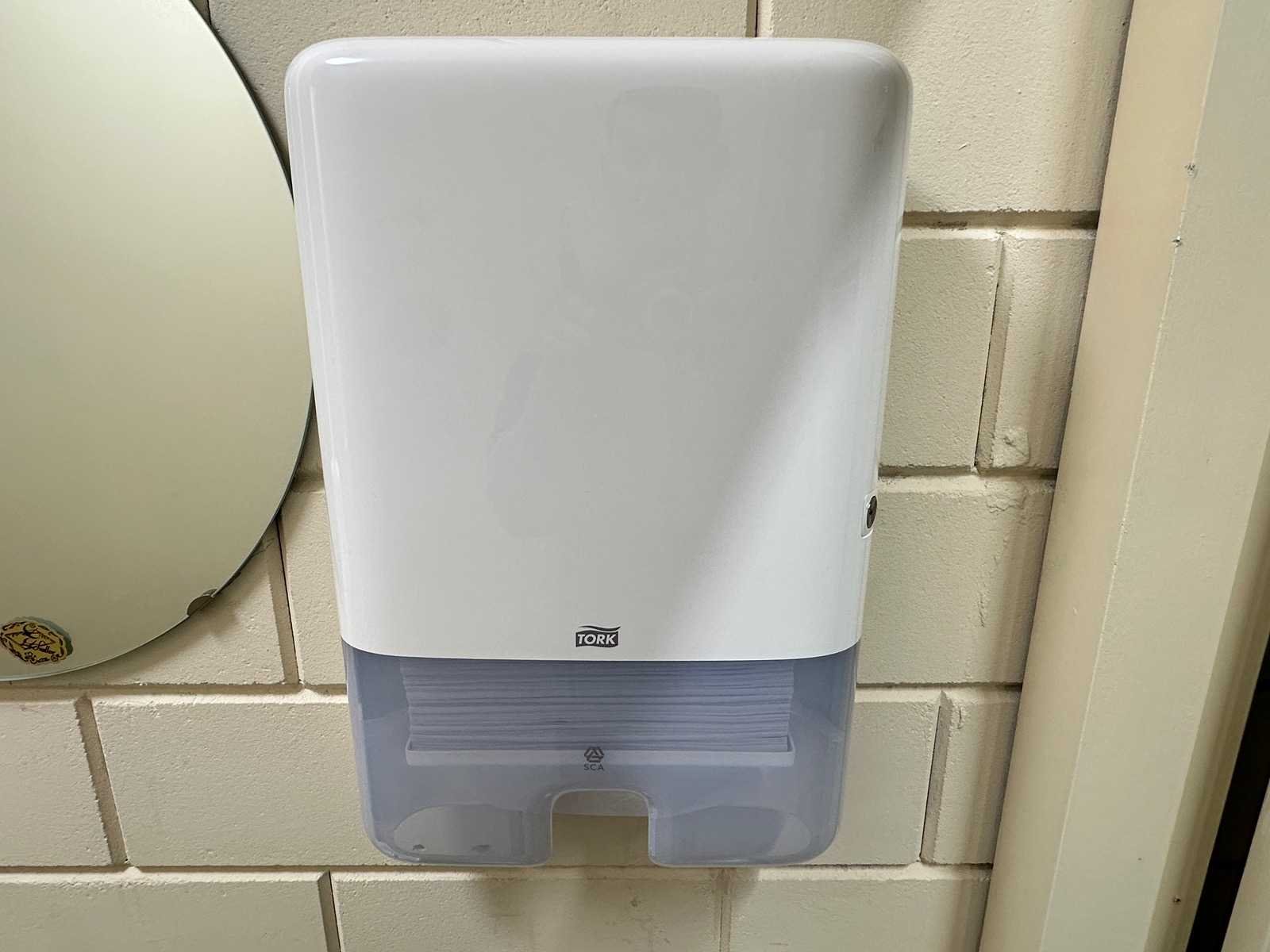 Deze set bestaat uit handdoekdispenser, papierdispenser en zeepdispenser. De sleutels ontbreken. Merk: Tork
