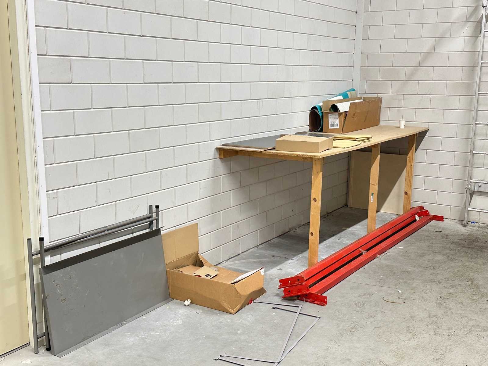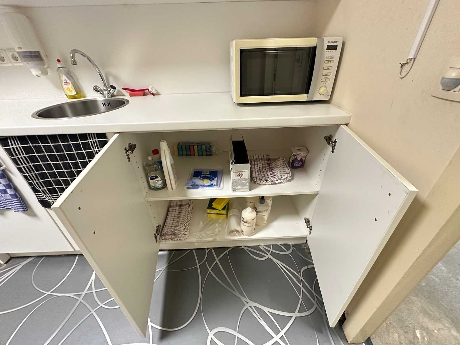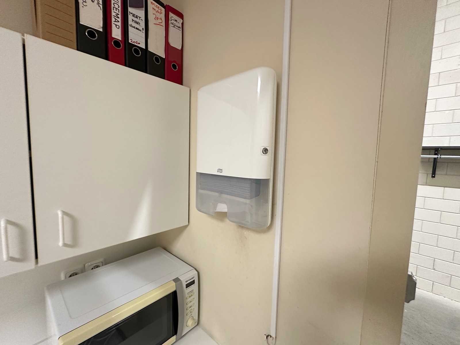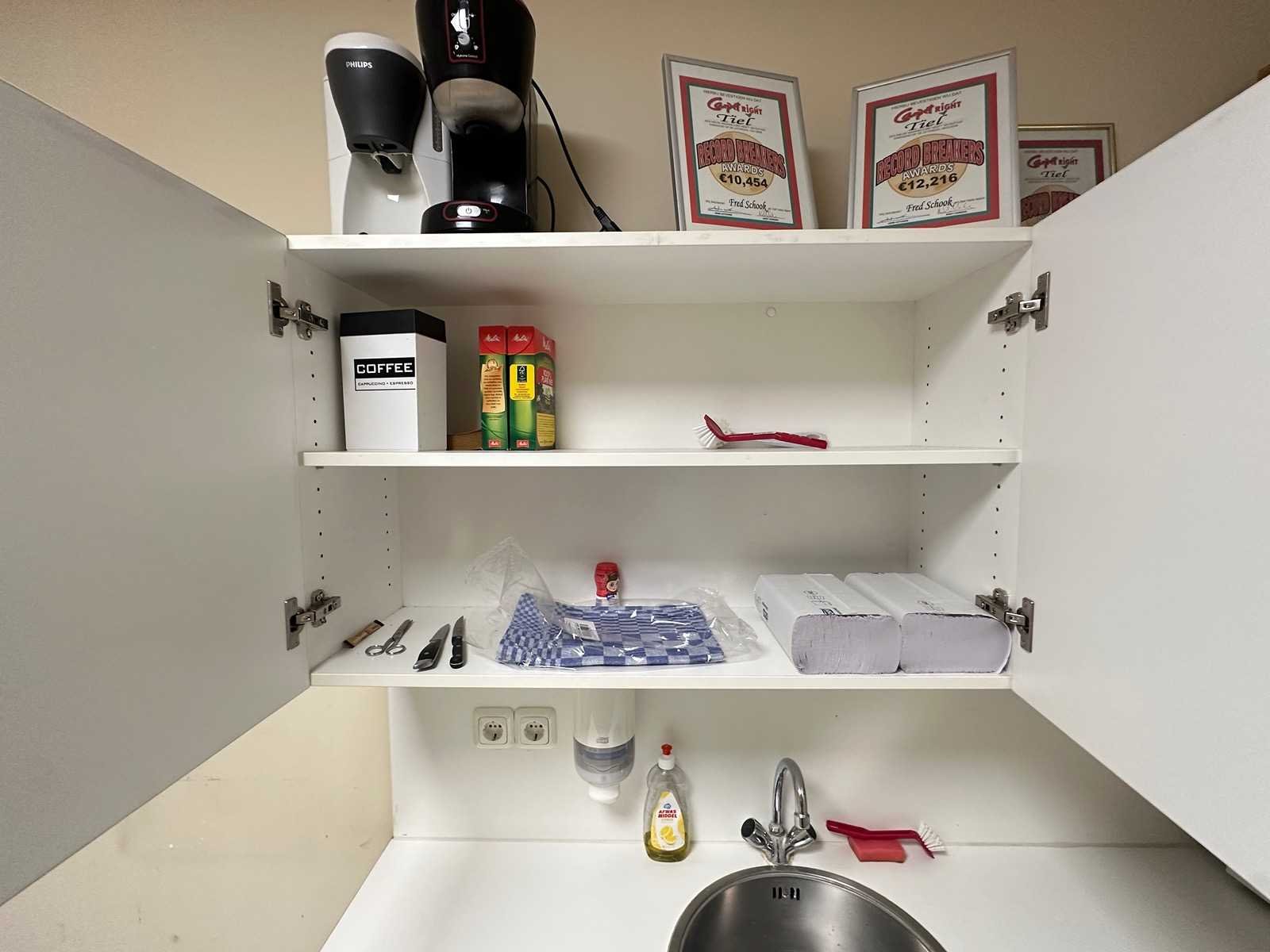 Deze inhoud bestaat onder andere uit rolcontainers, stelling materiaal, schoonmaakartikelen, tafel en stoelen, koffiezetapparaat, magnetron en serviesgoed.