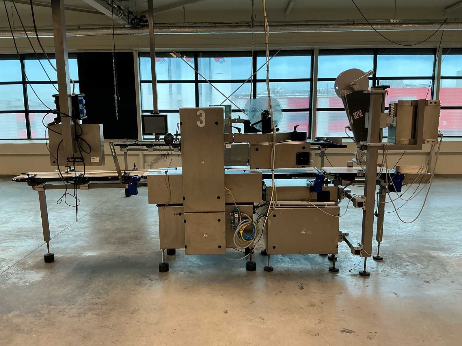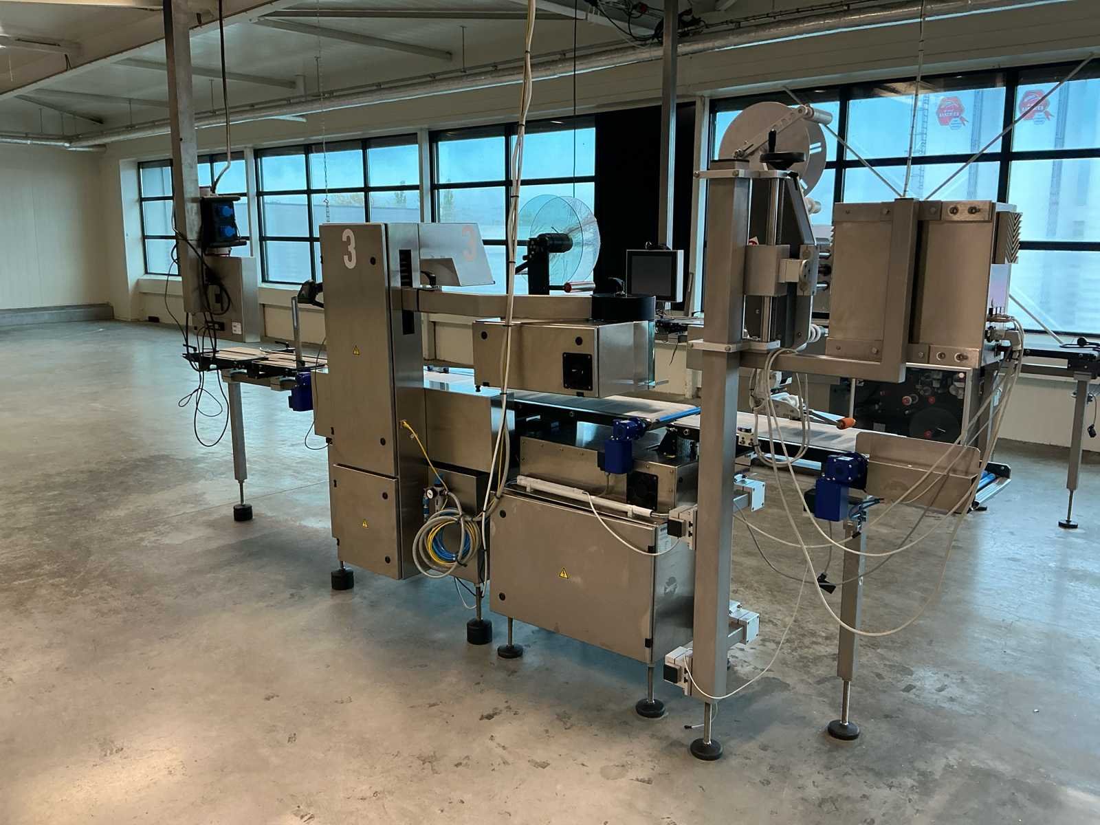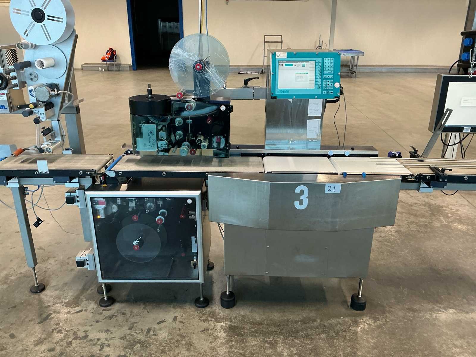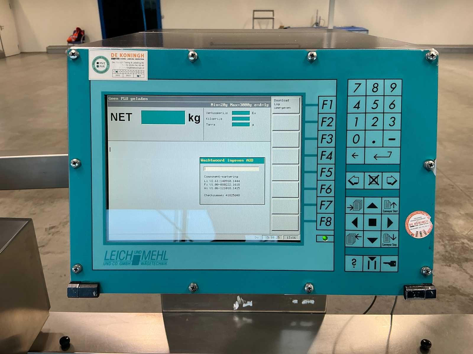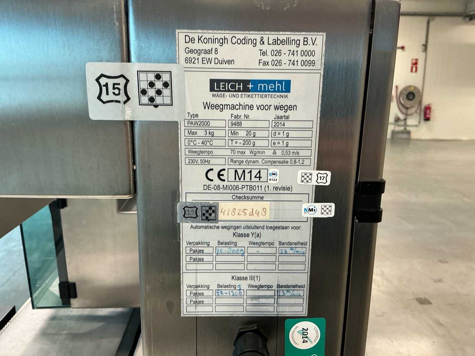 Leich + Mehl controle-weegmachine / labelmachine Max. Productcapaciteit: 70 p/min Transportbandbreedte: 300 mm Max. Gewicht: 3000g Min. Gewichtscapaciteit: 20g Maximale transportbandsnelheid: 0,53 m/s Afmetingen (LxWxH): 4200x1000x2000mm Inclusief ALtech ALritma S labelmachine en touchscreenpaneel. Leich + Mehl check weigher / labelling machine Max. Product capacity: 70 p/min Conveyor width: 300mm Max. Weight capacity: 3000g Min. Weight capacity: 20g Max. Conveyor speed: 0,53m/s Dimensions (LxWxH): 4200x1000x2000mm Including ALtech ALritma S labelling machine and touchscreen panel. Merk: Leich + Mehl Type: PAW 2000-S