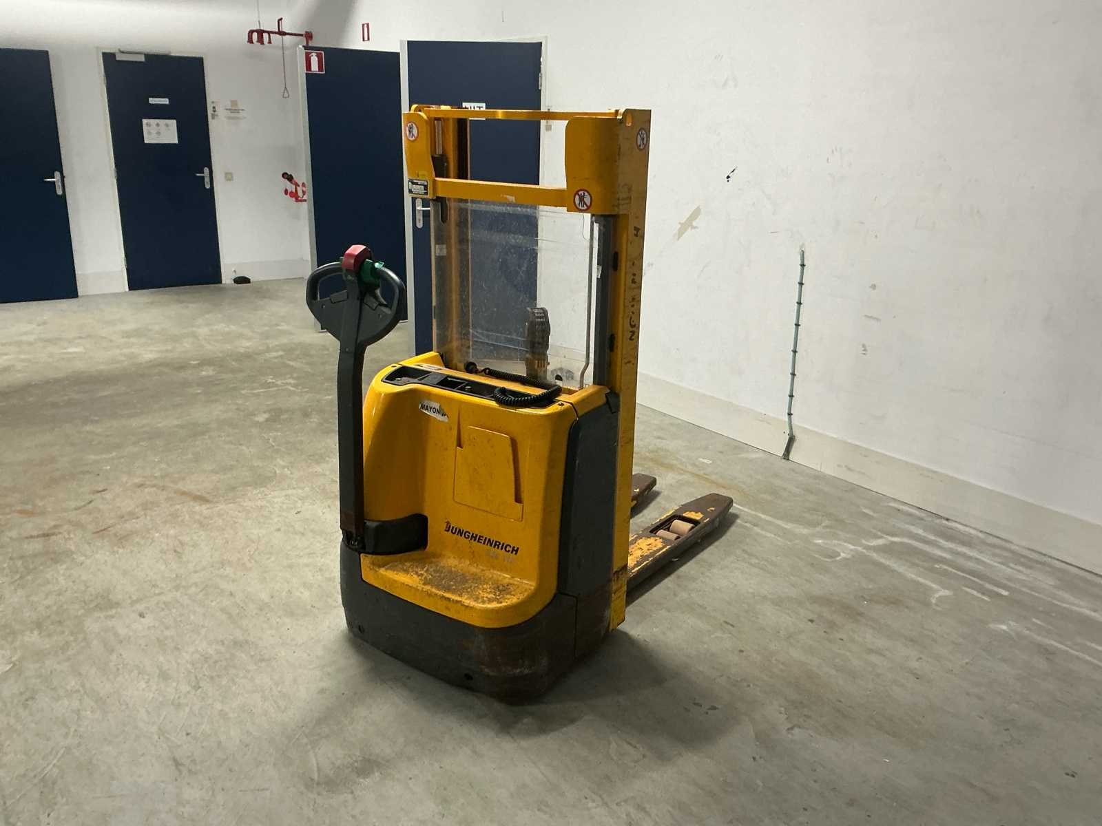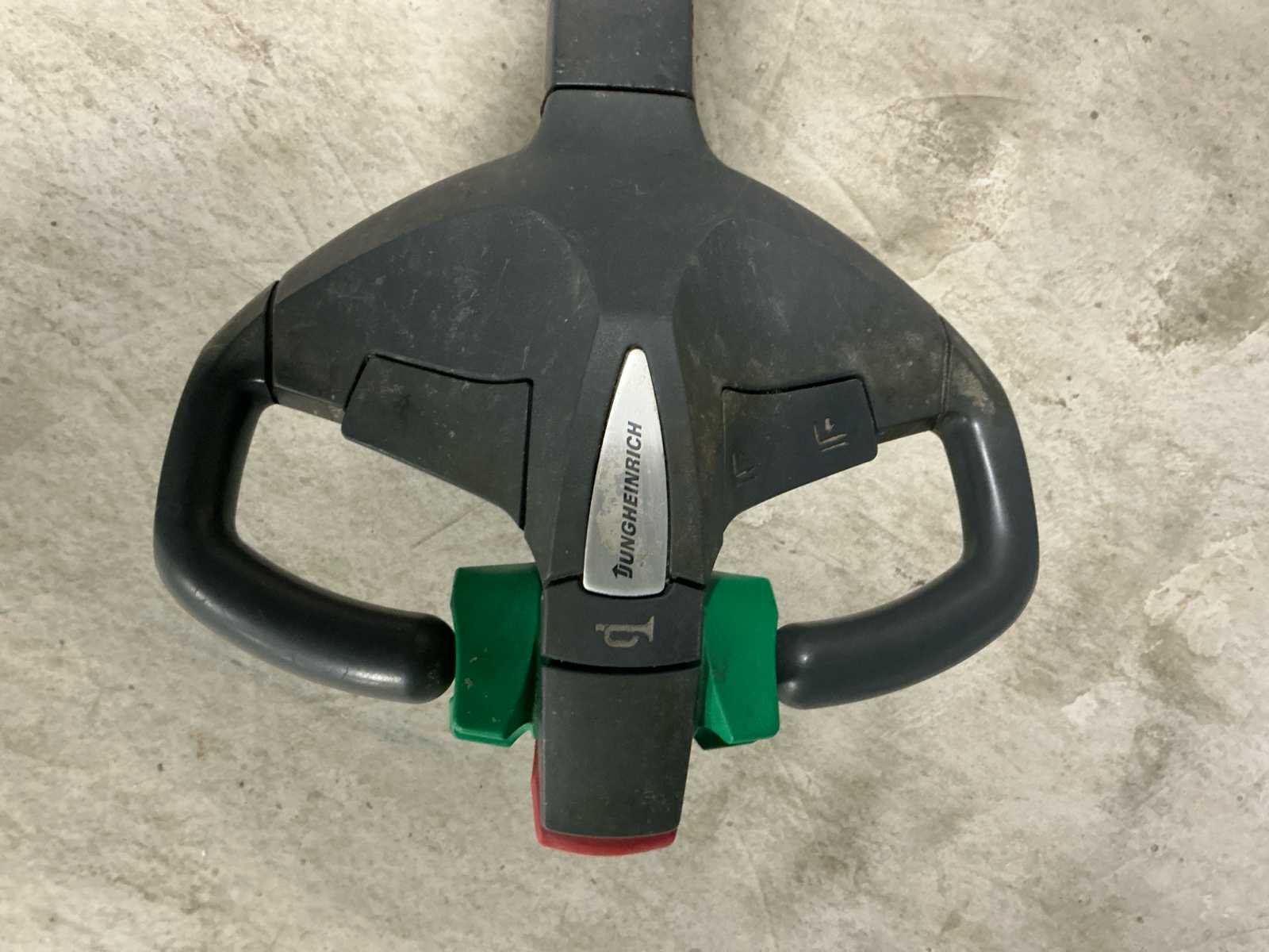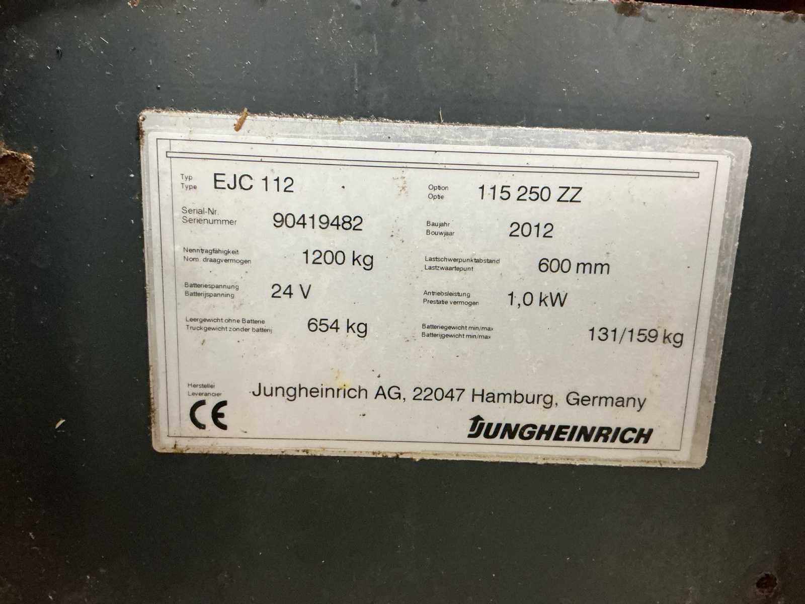 Nominale capaciteit: 1200 kg Maximale hoogte: 2500 mm Hoogte: 1700 mm Vorklengte: 1150 mm Gewicht zonder accu: 654 kg Batterijgewicht: 159 kg Rated capacity: 1200kg Max height: 2500mm Height: 1700mm Fork length: 1150mm Weight without battery: 654kg Battery weight: 159kg Merk: Jungheinrich Type: EJC 112