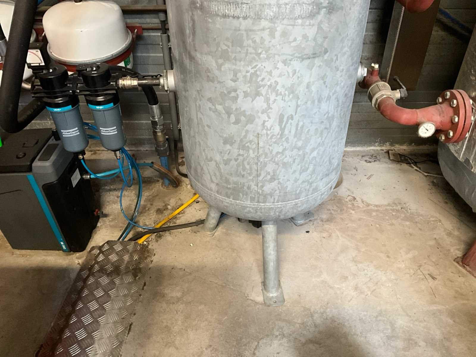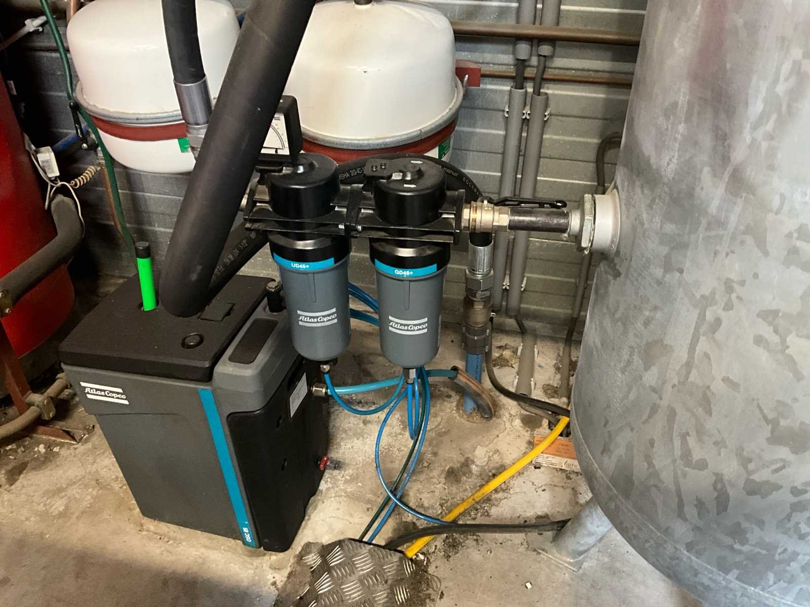Hoogte: 2200 mm Met 2 filters eraan gekoppeld en een oliecondensaatscheider Height : 2200mm With 2 filters attached and oil condensate separator Merk: ATLAS COPCO
