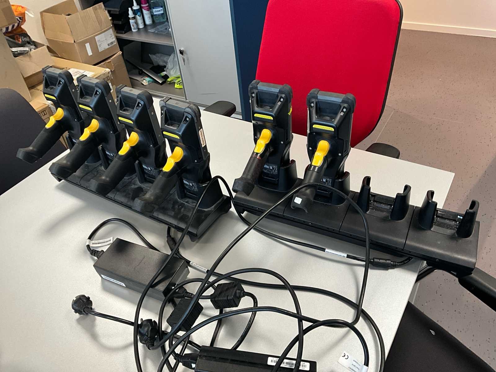 6 handscanners van het merk ZEBRA in verschillende types, waaronder de WT6300 met RS 5000 vingerafdrukscanner, MC 9300 en DS 3678 met opladers en diverse Zebra-accessoires in de doos+ 2 laadstations Including various scanners , 2 x loading station and various zebra accessories in box Merk: Zebra Type: CP-RAC-01