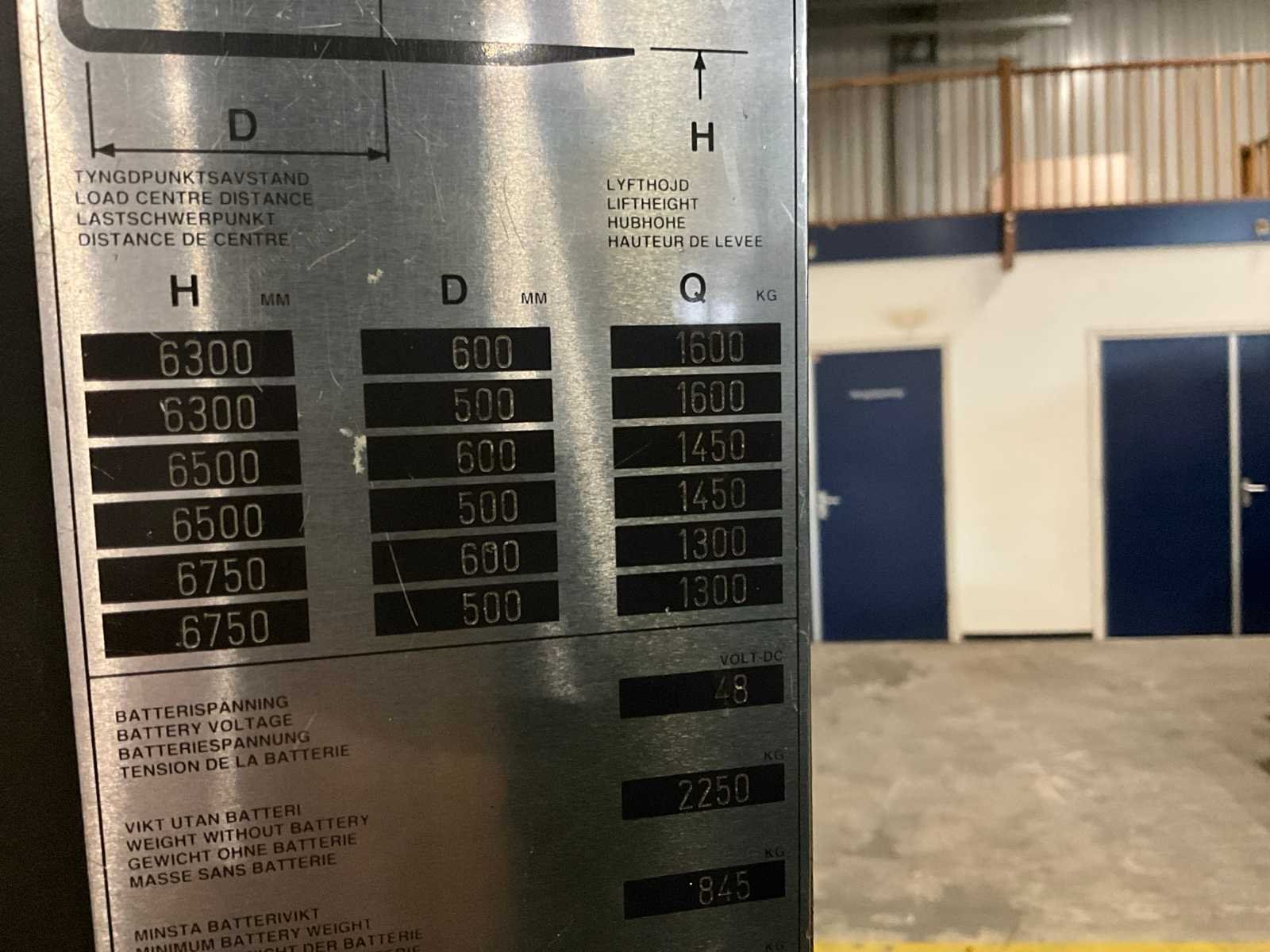 Let op zonder lader, reachtruck werkt alleen display defect Merk: Atlet Type: UNS/160DTFVRE675 Bouwjaar: 2001 Serienummer: UNS04552 Brandstof: Elektrisch Mast: 3 deling Soort band: Volrubber Aantal wielen: 3 Free-lift: true Side-shift: true Triple mast: true Eigen gewicht: 3100kg Hefvermogen: 1600kg Lepellengte: 1150mm Max. hefhoogte: 6700mm Minimale doorrijhoogte: 2800mm Totale afmeting L: 2400mm Totale afmeting Breedte: 1300mm Totale afmeting Hoogte: 2800mm Elektrisch: true Vol rubber banden: true