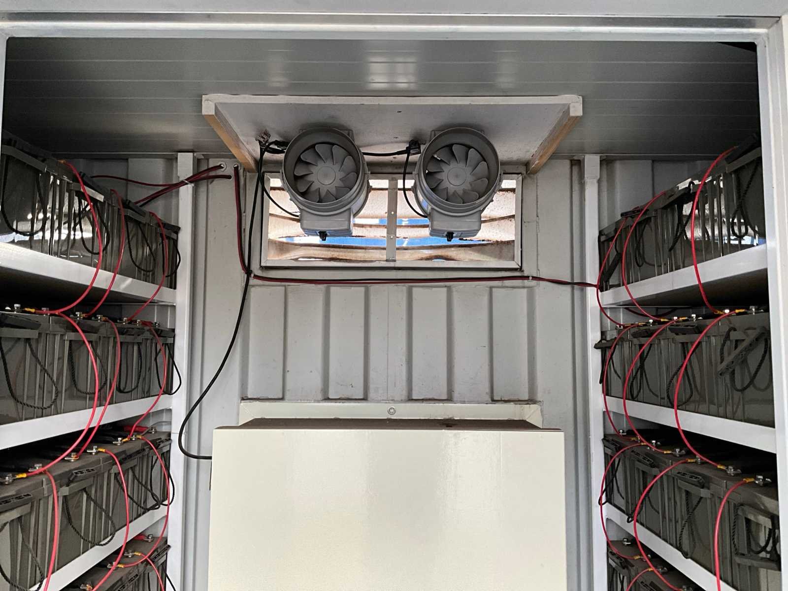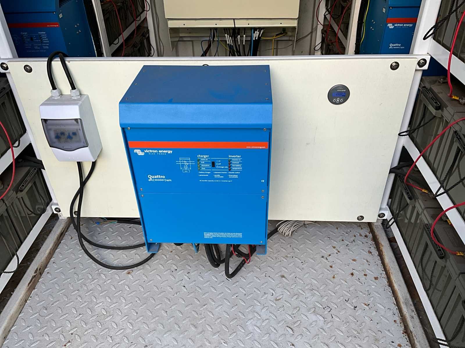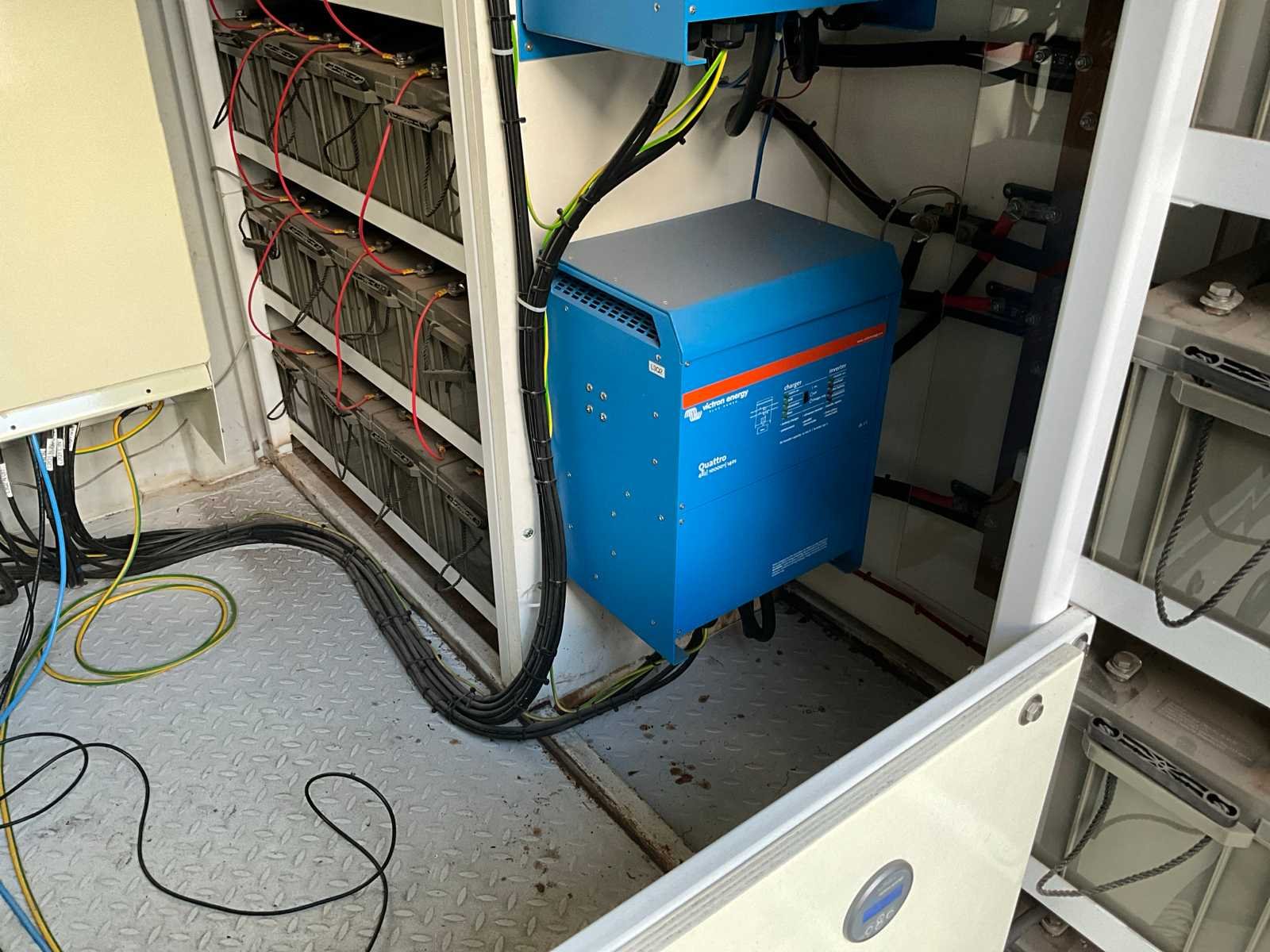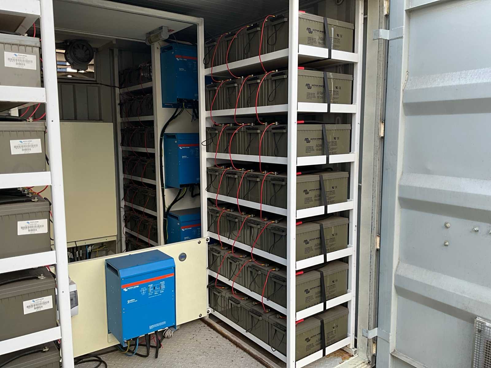 Voorzien van 112 stuks AGM accu’s á12V-220ah, 7 stuks victron Quattro omvormers type 48volt/10000va/140amp, ventilatie, 2 stuks mabo automatische brandblusunits, vermogen 50 KVA, capaciteit 300 KWH, spanning 220V & 400V, geschikt voor zonnepanelen maximaal 20000W, container wordt op auto klant geladen. Merk: Victron-energie Type: 10 ft Serienummer: 4 Machinegewicht: 10000kg Totale afmeting L: 3000mm Totale afmeting Breedte: 2400mm Totale afmeting Hoogte: 2600mm