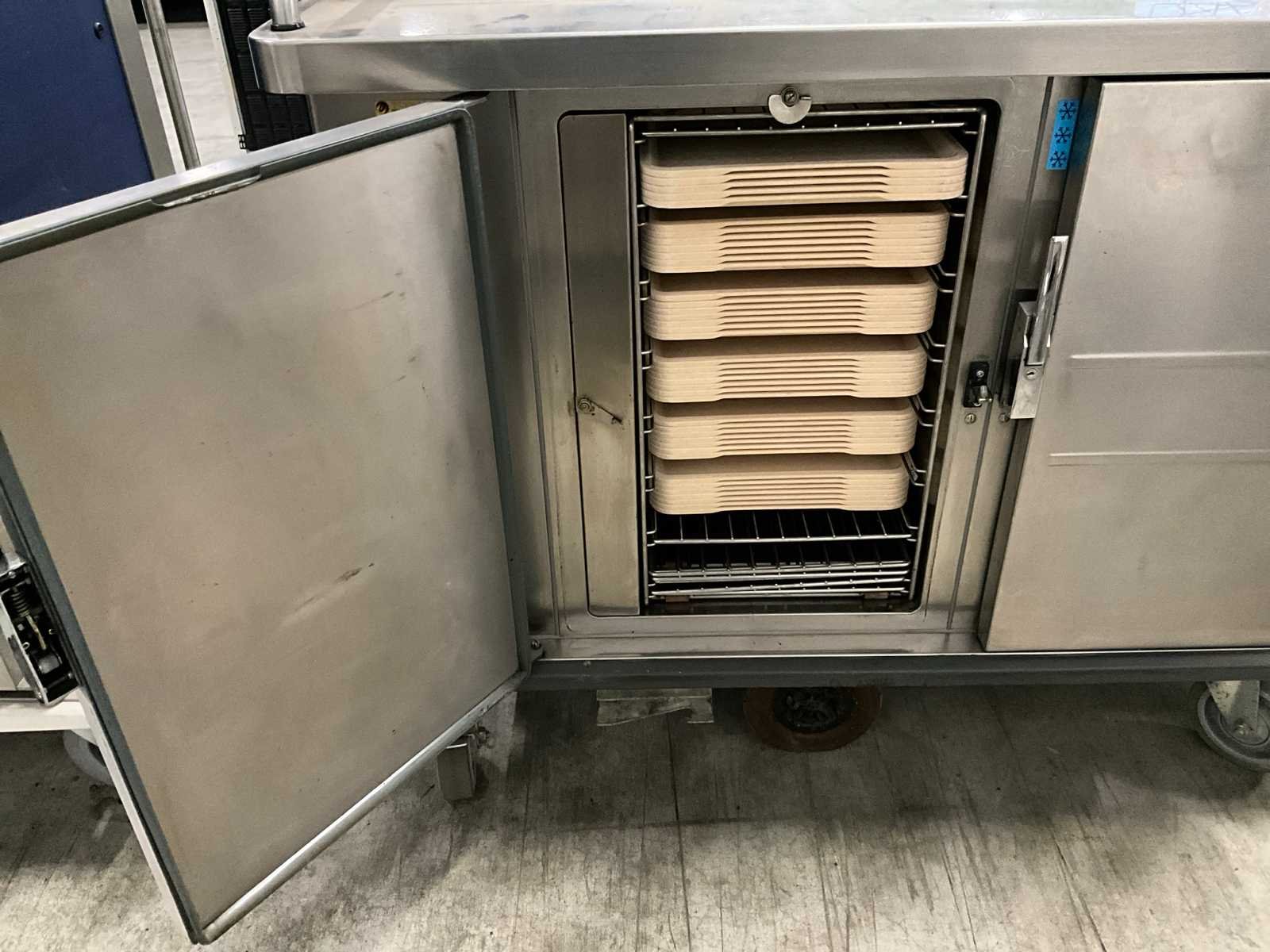 Voorzien van elektrische aandrijving, warmhoudlamp, gekoelde onderkast, 4 zwenkwielen, glazen beschermkap, digitale besturing, partij dienbladen Merk: Burlodge Type: Multigen 2 Totale afmeting L: 1240mm Totale afmeting Breedte: 720mm Totale afmeting Hoogte: 1450mm