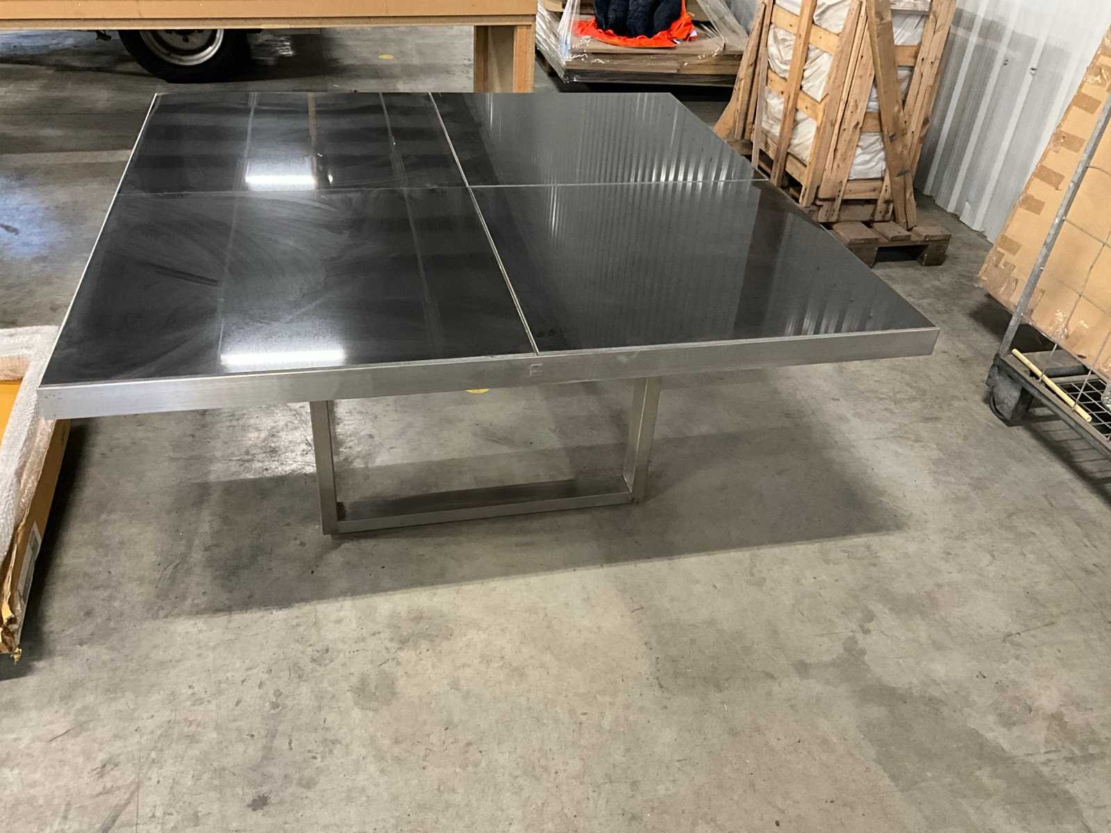 Voorzien van roestvrijstalen ombouw en roestvrijstalen poten met stelshroeven, 4 stuks natuurstenen bladen ( Shanxi Black)dikte 13 mm, ongebruikt Merk: Valeur Model: RVS Product type: RetroLux Vorm: Vierkant Lengte: 165cm Breedte: 165cm Hoogte: 76cm Materiaal: Staal/Natuursteen