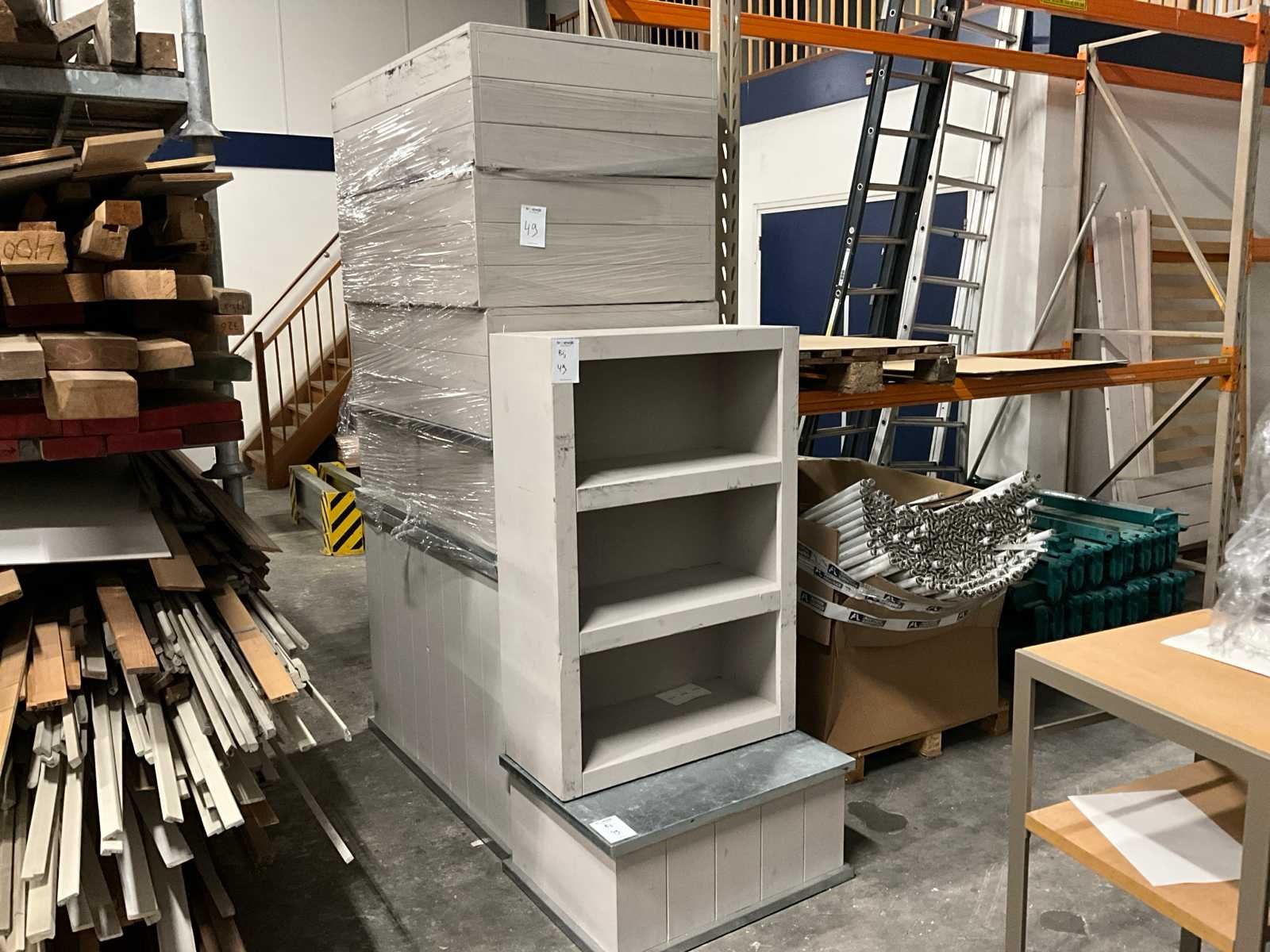 Bestaande uit 1 houten toonmeubel met gegalvaniseerd stalen topblad afmeting 120x80x90 cm, 2 houten kasten met 3 vakken afmeting 78x35x119 cm, 2 houten tooneiland met gegalvaniseerd stalen topblad afmeting 60x80x35 cm, 1 houten tooneiland met gegalvaniseerd stalen topblad afmeting 80x120x35 cm in de kleur licht rosé