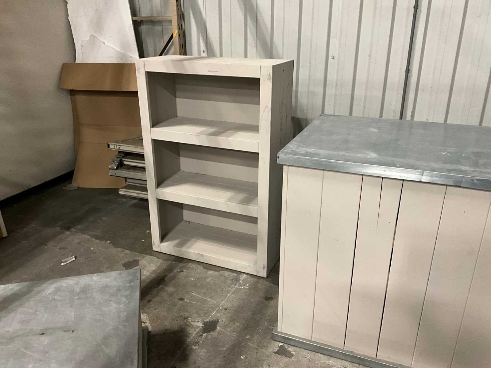 Bestaande uit 1 houten toonmeubel met gegalvaniseerd stalen topblad afmeting 120x80x90 cm, 2 houten kasten met 3 vakken afmeting 78x35x119 cm, 2 houten tooneiland met gegalvaniseerd stalen topblad afmeting 60x80x35 cm, 1 houten tooneiland met gegalvaniseerd stalen topblad afmeting 80x120x35 cm, op 1 pallet, LET OP ZELFDE OPSTELLING ALS OP GETOONDE FOTOS ALLEEN IN DE KLEUR ANTRACIET