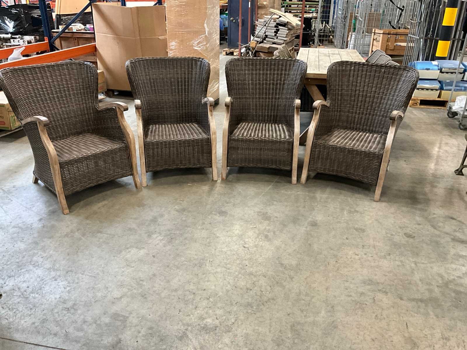 Voorzien van houten leuning, stoelen in wicker uitvoering, Let op het betreft gebruikt tuinmeubilair met verschillende gebruikerssporen, foto is van een voorbeeld opstelling er kan dus minimaal verschil zijn tussen verschillende stoelen. Model: Lounge Product type: Wicker Lengte: 80cm Breedte: 75cm Hoogte: 94cm Zithoogte: 39