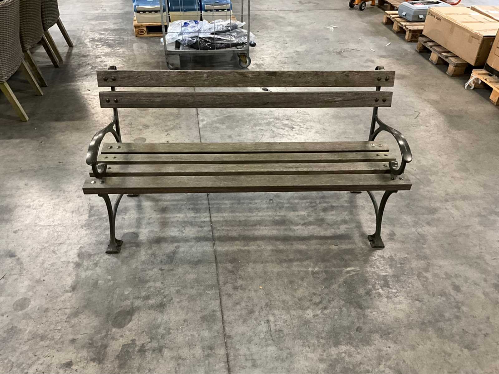 Voorzien van gietijzeren frame en teakhouten zit en rug gedeelte, Let op het betreft gebruikt tuinmeubilair met verschillende gebruikerssporen, foto is van een voorbeeldbank er kan dus minimaal verschil zijn tussen verschillende banken. Lengte: 150cm Hoogte: 78cm Zithoogte: 43 Diepte: 60 Materiaal: Staal/Hout