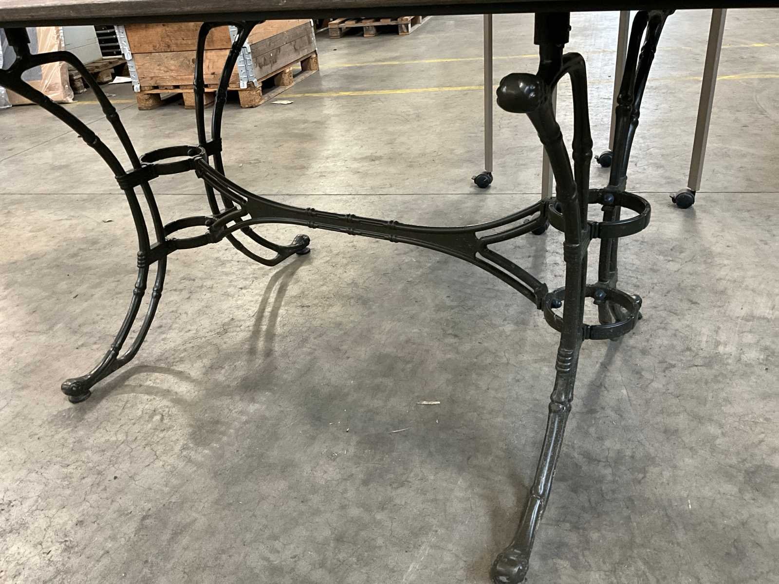Voorzien van gietijzeren frame en teakhouten bovenblad, Let op het betreft gebruikt tuinmeubilair met verschillende gebruikerssporen, foto is van een voorbeeldtafel er kan dus minimaal verschil zijn tussen verschillende tafels Lengte: 160cm Breedte: 78cm Hoogte: 77cm