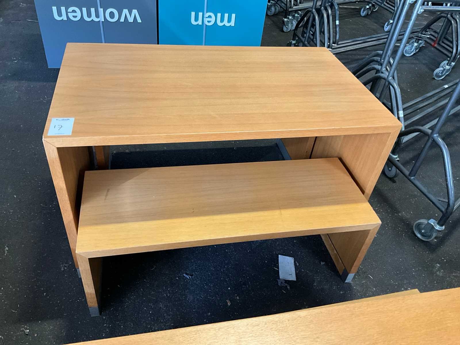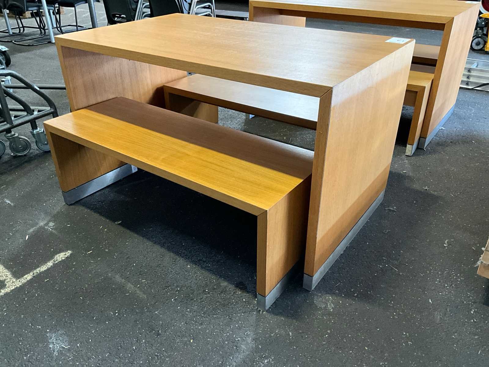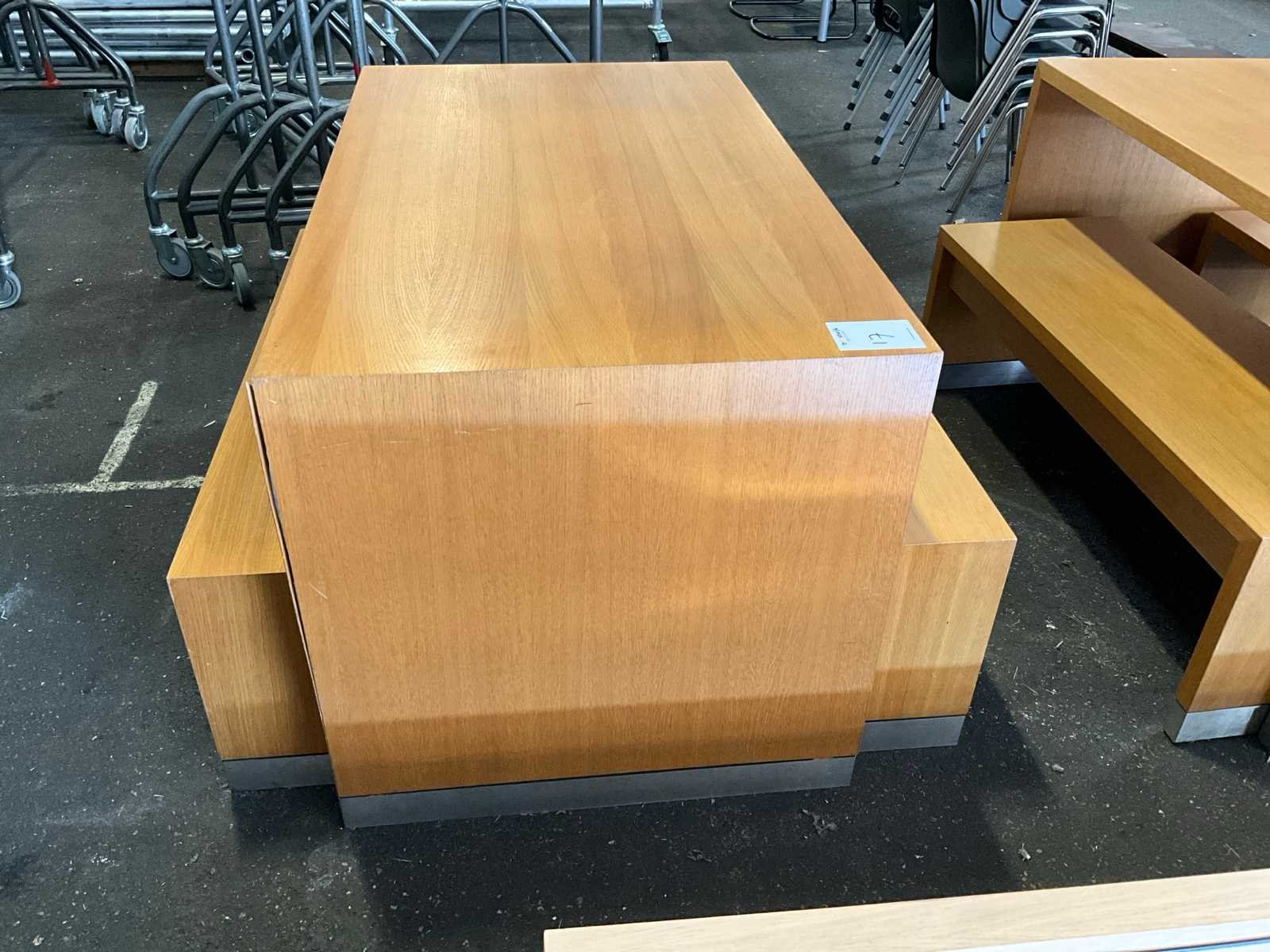 Bestaande uit 1 hoge tafel afmeting 137x80x80 cm, en 2 stuks lage tafel afmeting 123x45x44 cm Materiaal: Hout