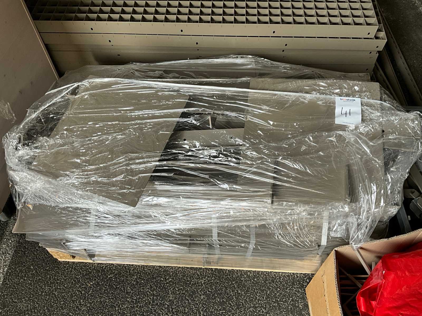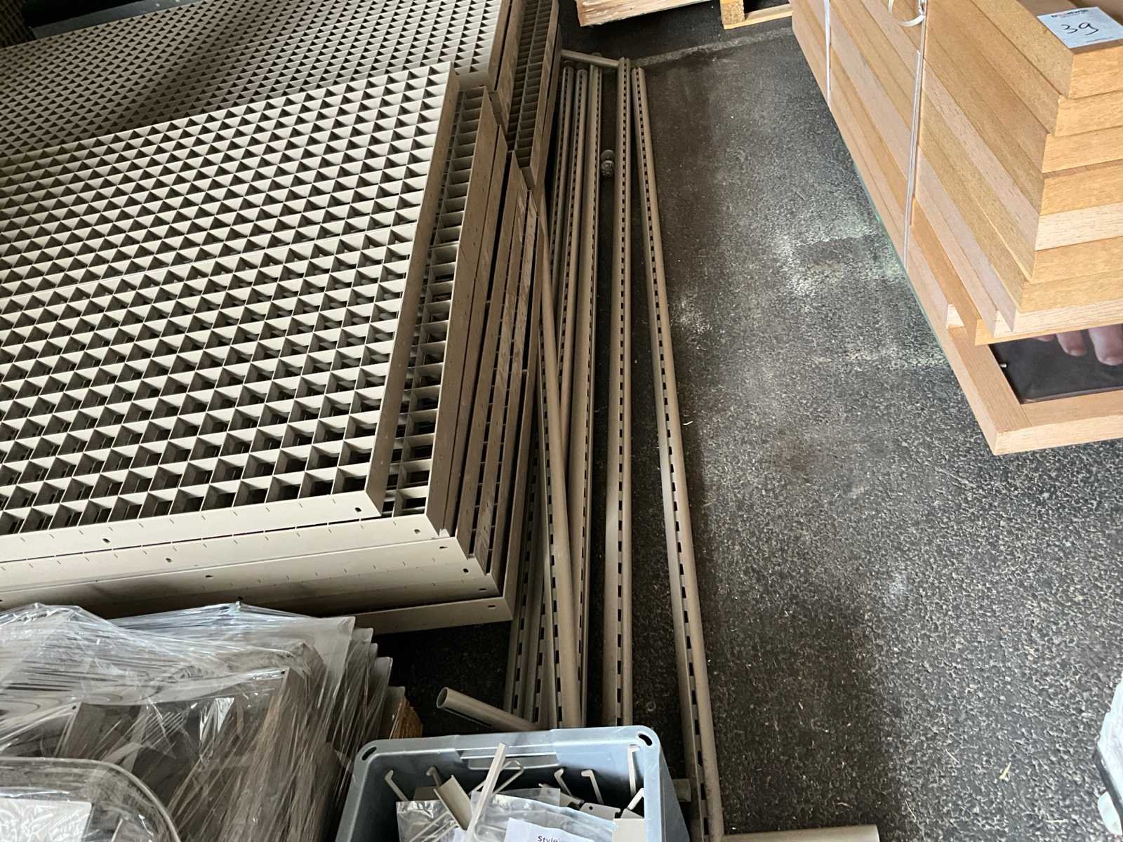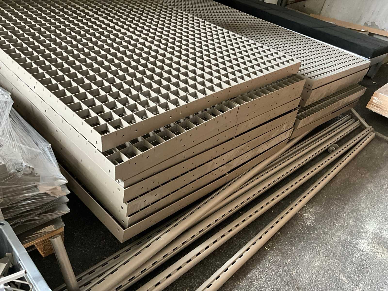 Waaronder 15 stuks gekoppelde stalen wandroosters kleur taupe afmeting 245x121 cm, koppelbeugels en partij toebehoren Merk: Style’n’store