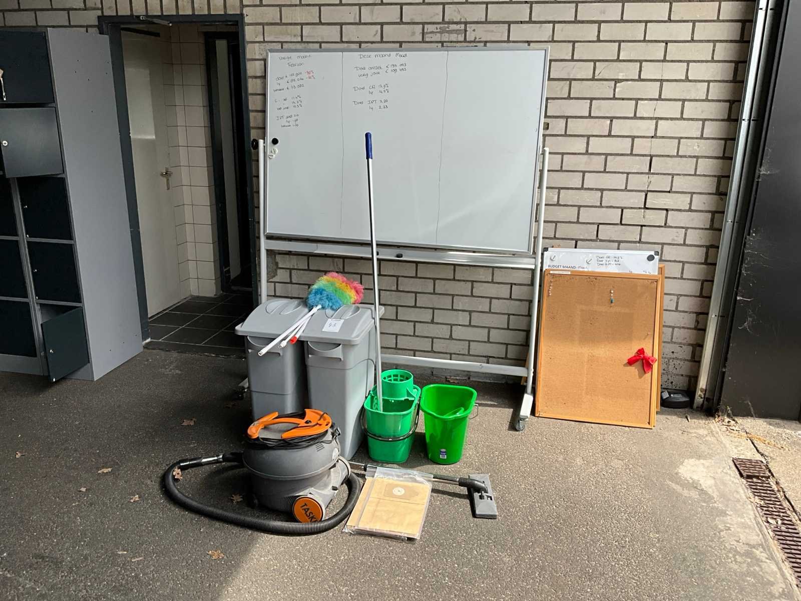 Waaronder stofzuiger, verrijdbaar whiteboard, vuilnisbakken en divers