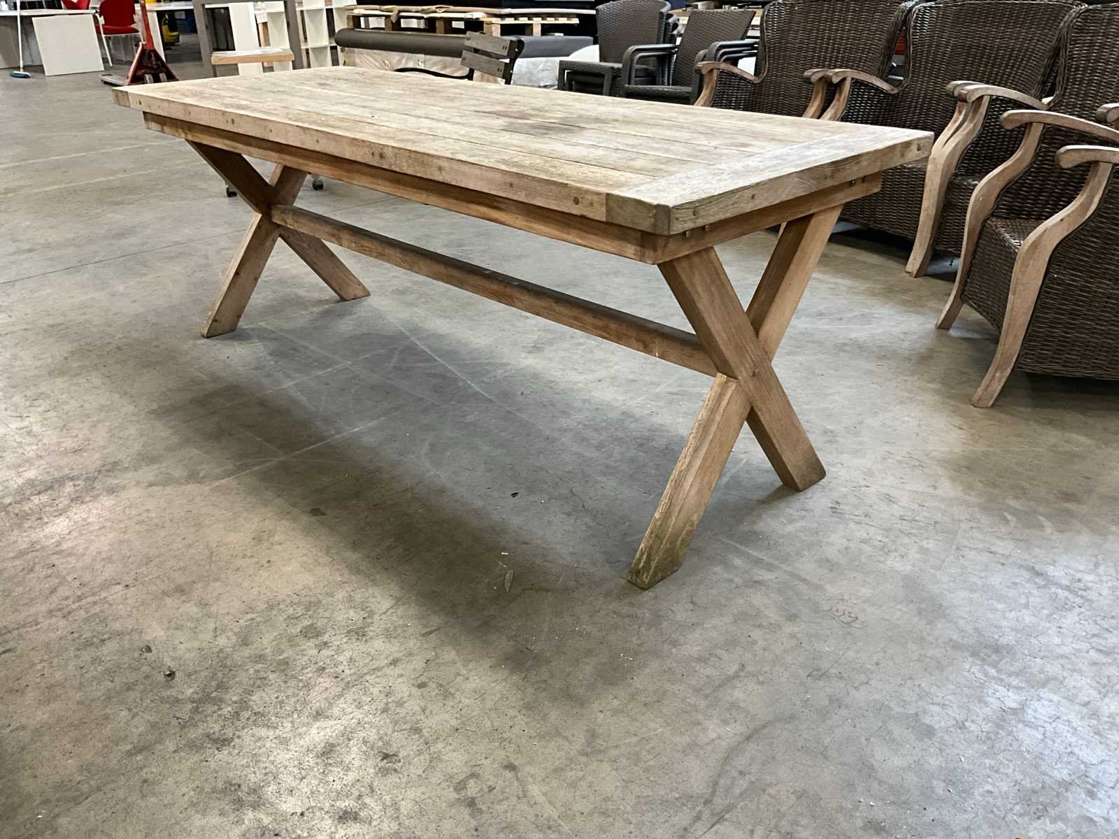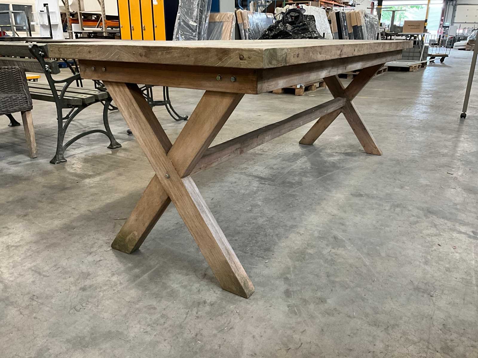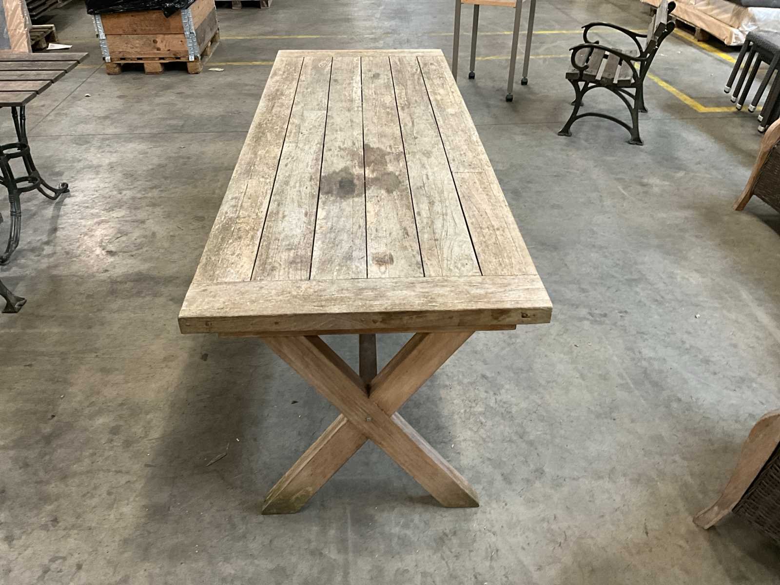 Let op het betreft gebruikt tuinmeubilair met verschillende gebruikerssporen, foto is van een voorbeeld opstelling er kan dus minimaal verschil zijn tussen verschillende tafels Model: Teak Product type: Hout large Lengte: 300cm Breedte: 80cm Hoogte: 79cm