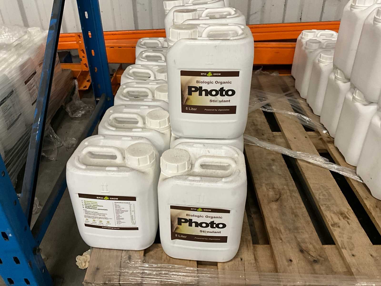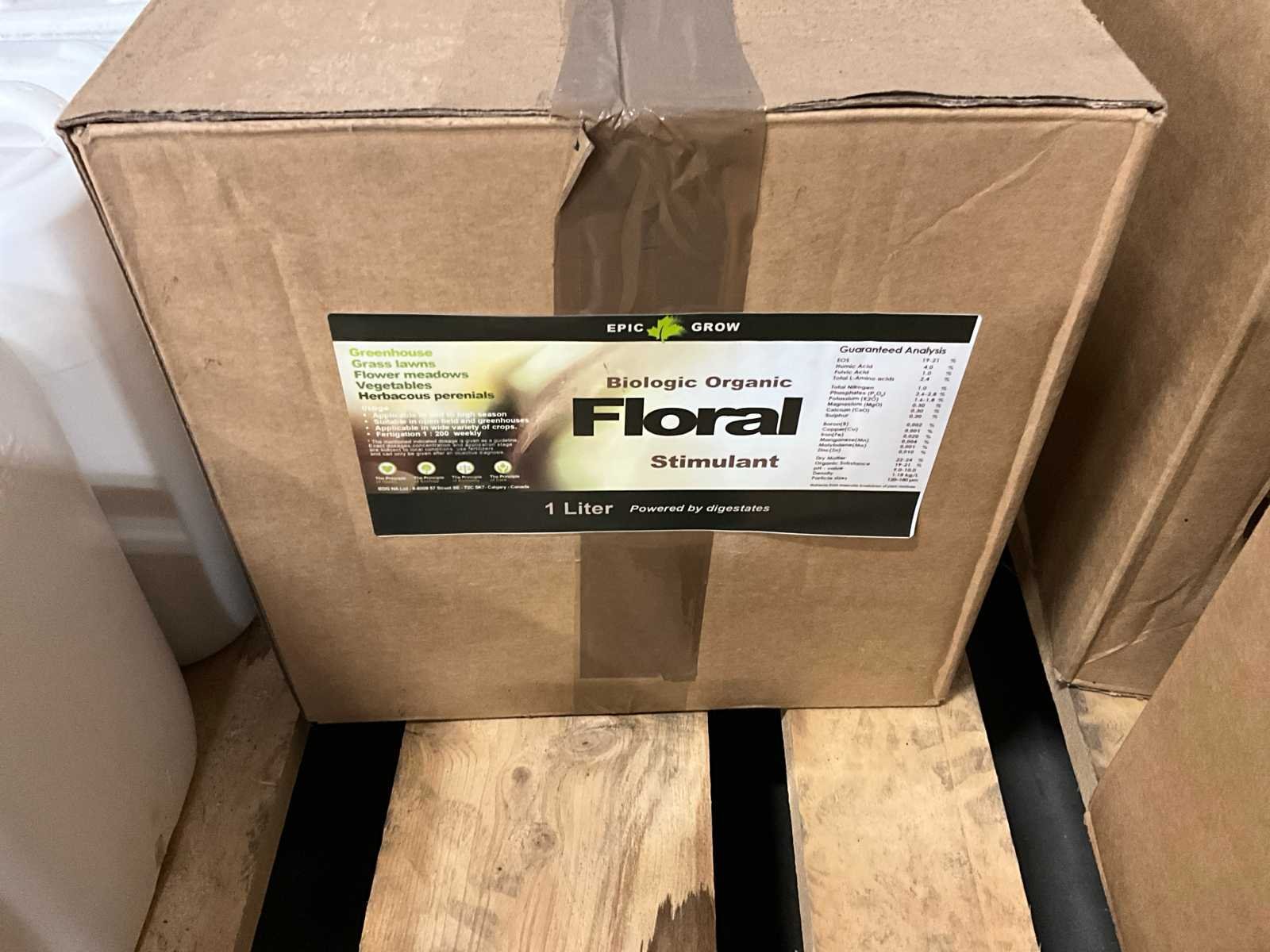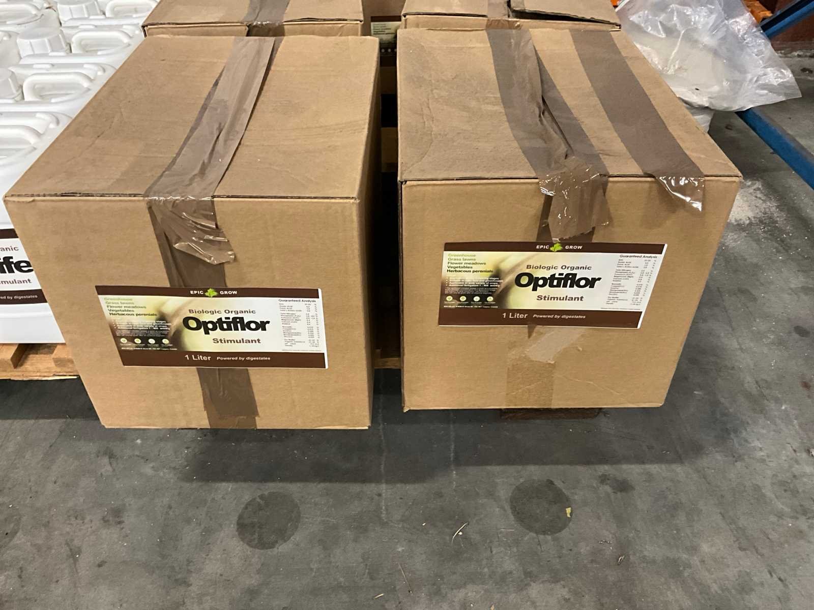 Waaronder 3 dozen Photo stimulant, 2 dozen Optiflor stimulant, 1 doos Floral stimulant, 1 doos st ohm 700, 11x5 ltr Prolife stimulant, 11x5Ltr Seamax bio stimulant, 16x 5 ltr Photo stimulant op 2 pallets Merk: Epic Grow Product type: Vloeibaar