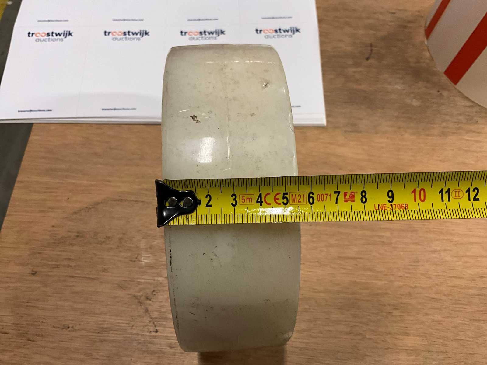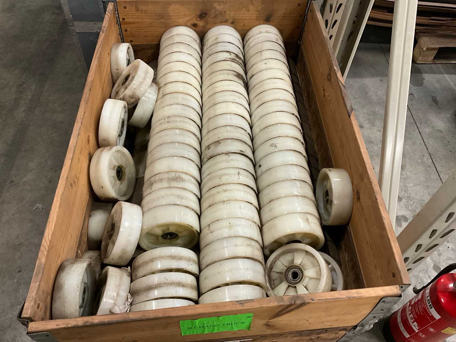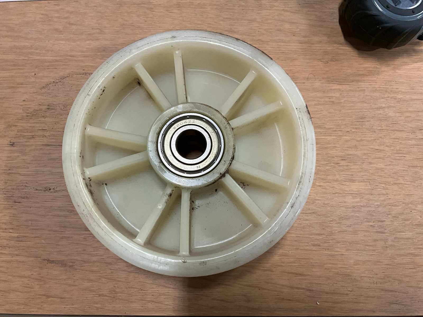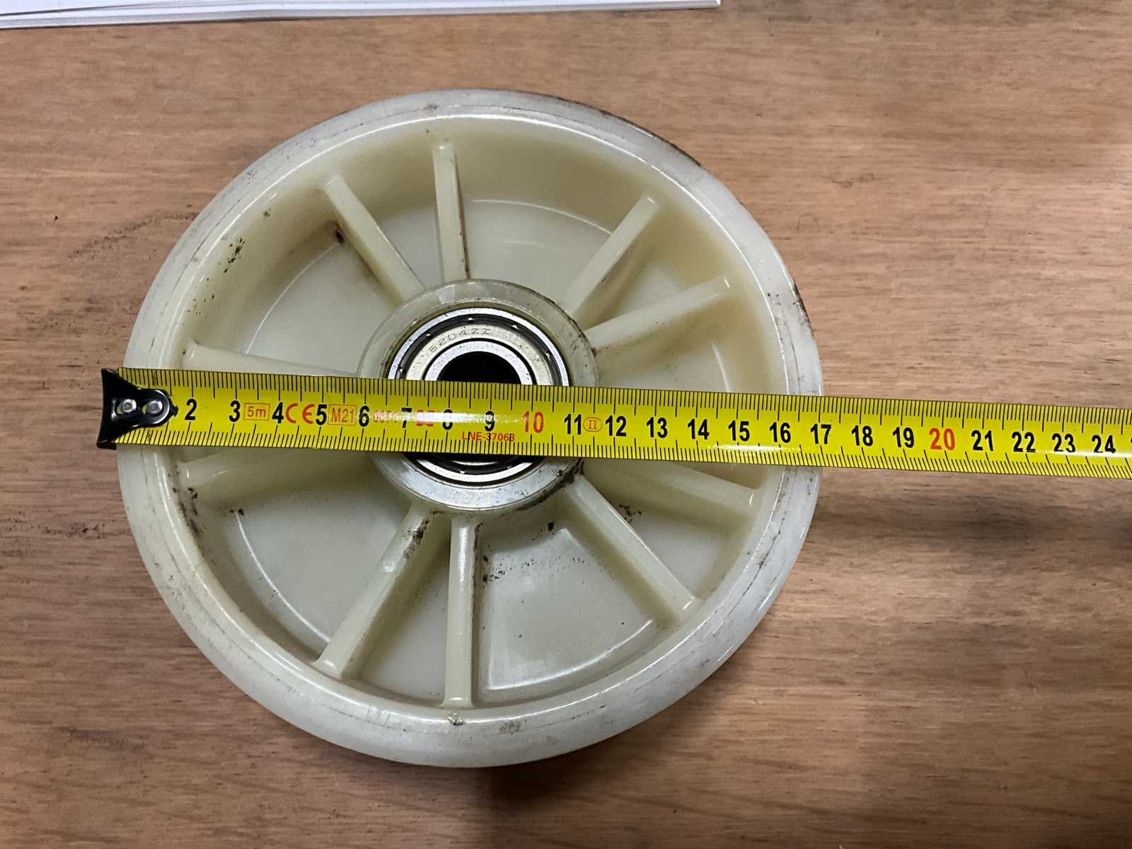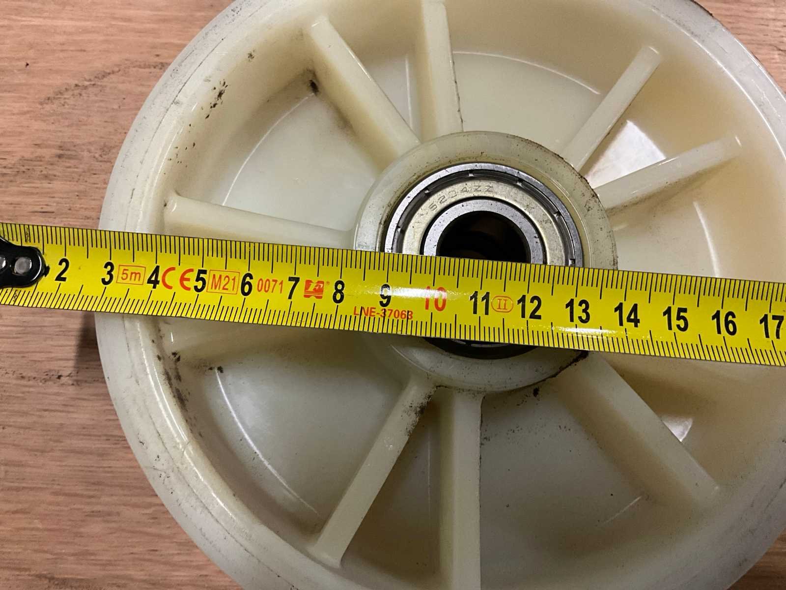 Kunstof wielen voorzien van lager maat 6204zz, asdikte 20 mm, wieldiameter 170 mm, loopvlakbreedte 55 mm, totaal circa 200 stuks in en met palletbak. Type: Gelagerd