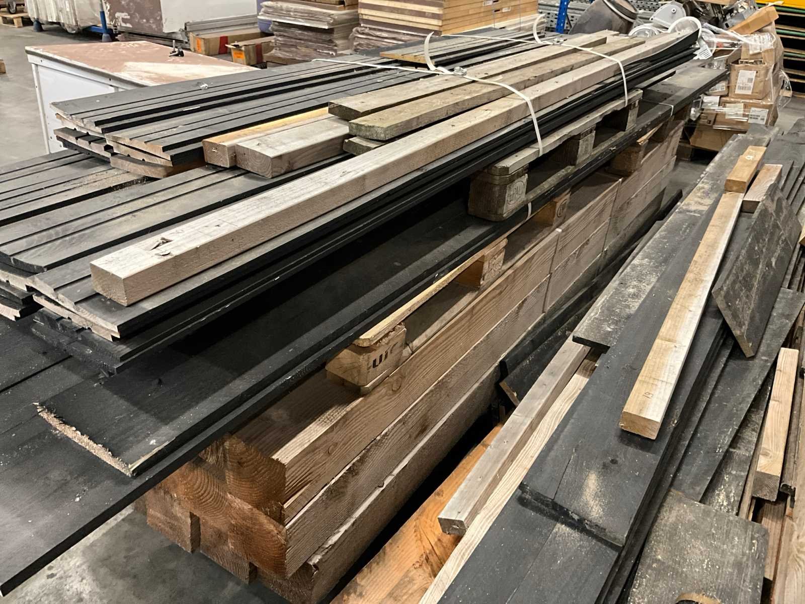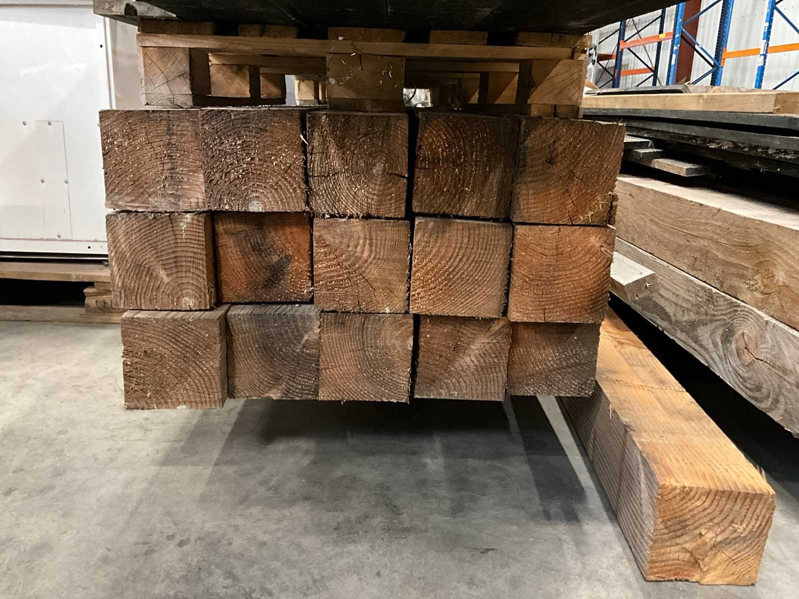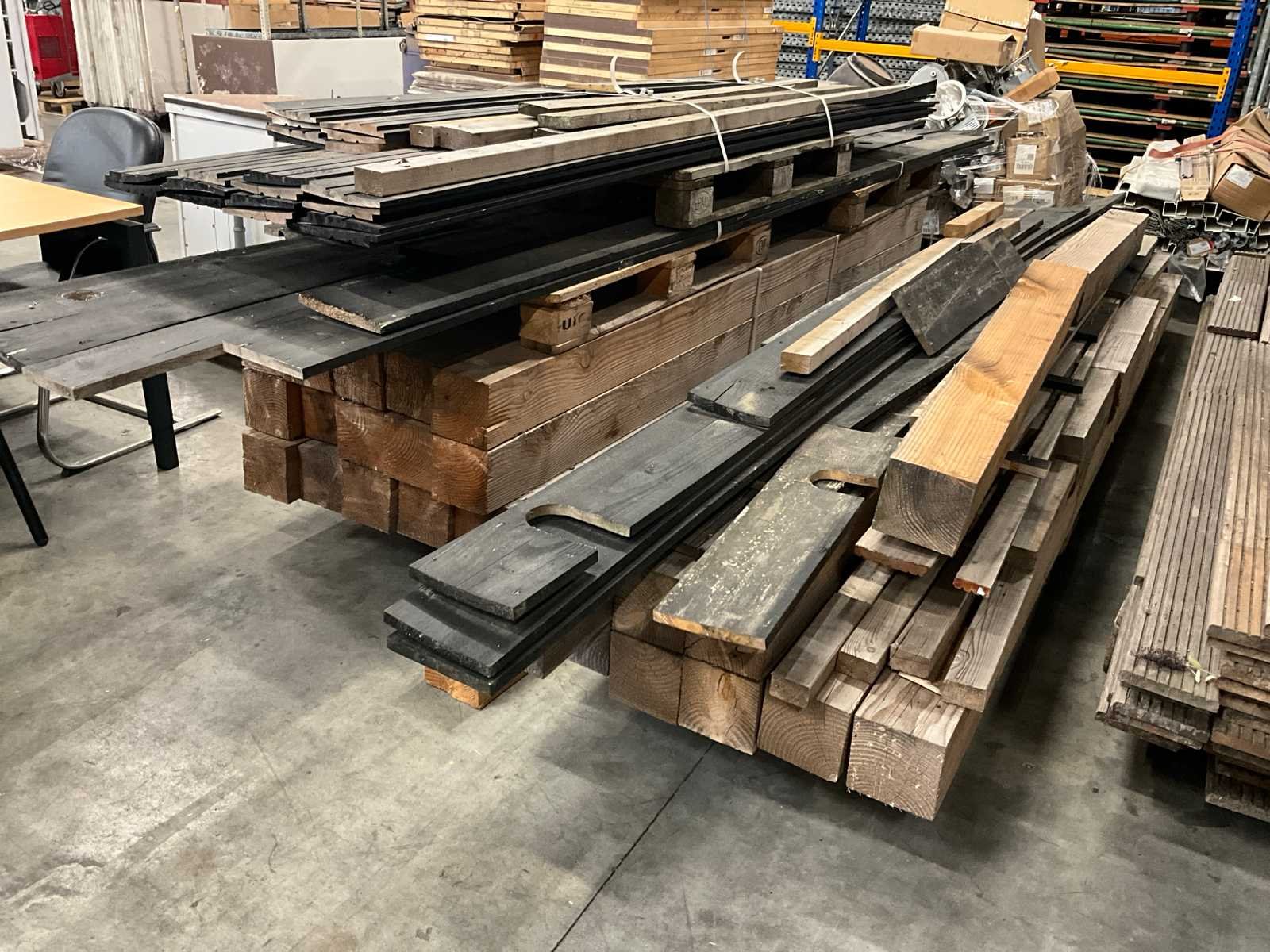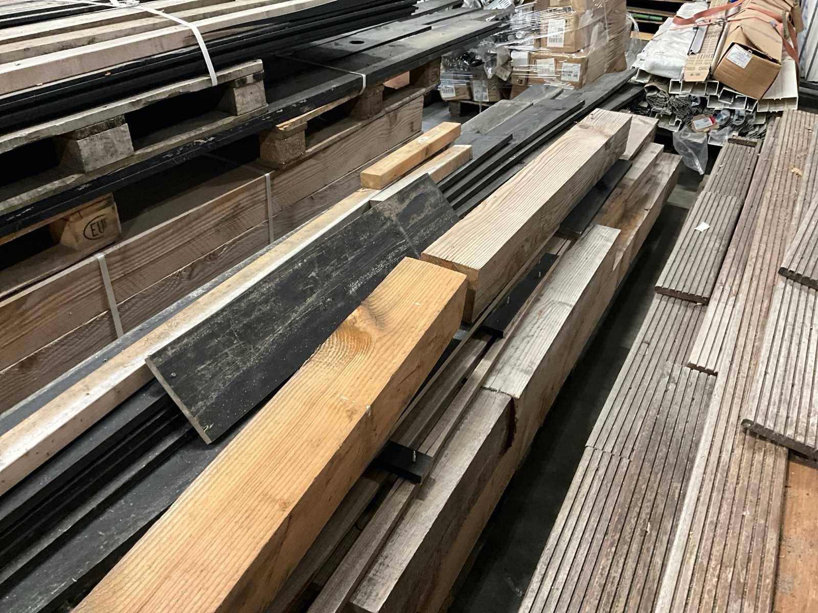 Waaronder 15 stuks balk Kopmaat 150x150 mm lengte 3000 mm, 8 stuks Kopmaat 150x150 mm lengte 4000 mm, 3 stuks Kopmaat 150x150 mm lengte 1500 mm, partij zwarte rabatdelen Kopmaat 195x20 mm in verschillende lengtes in totaal 3 pakketten.