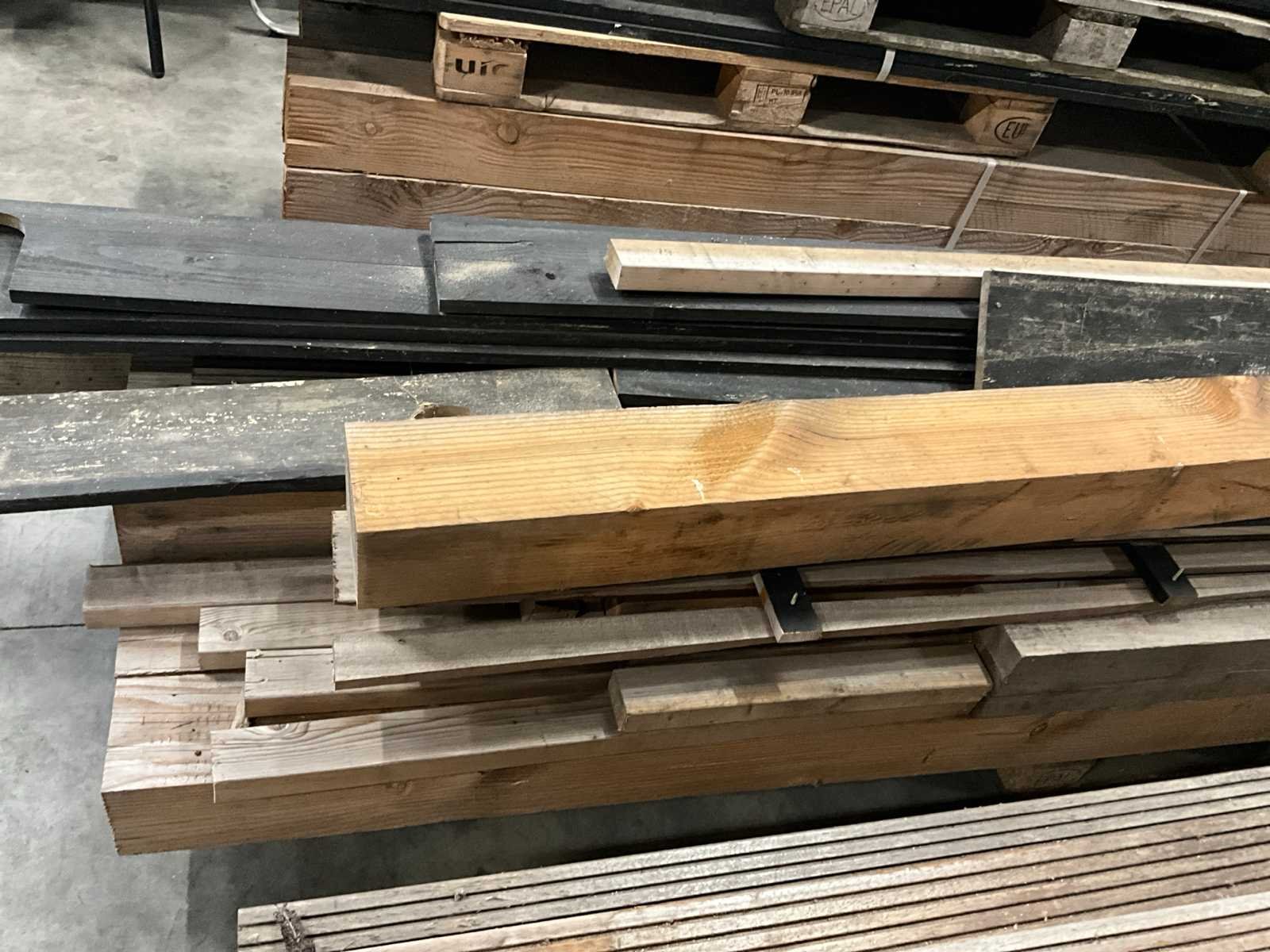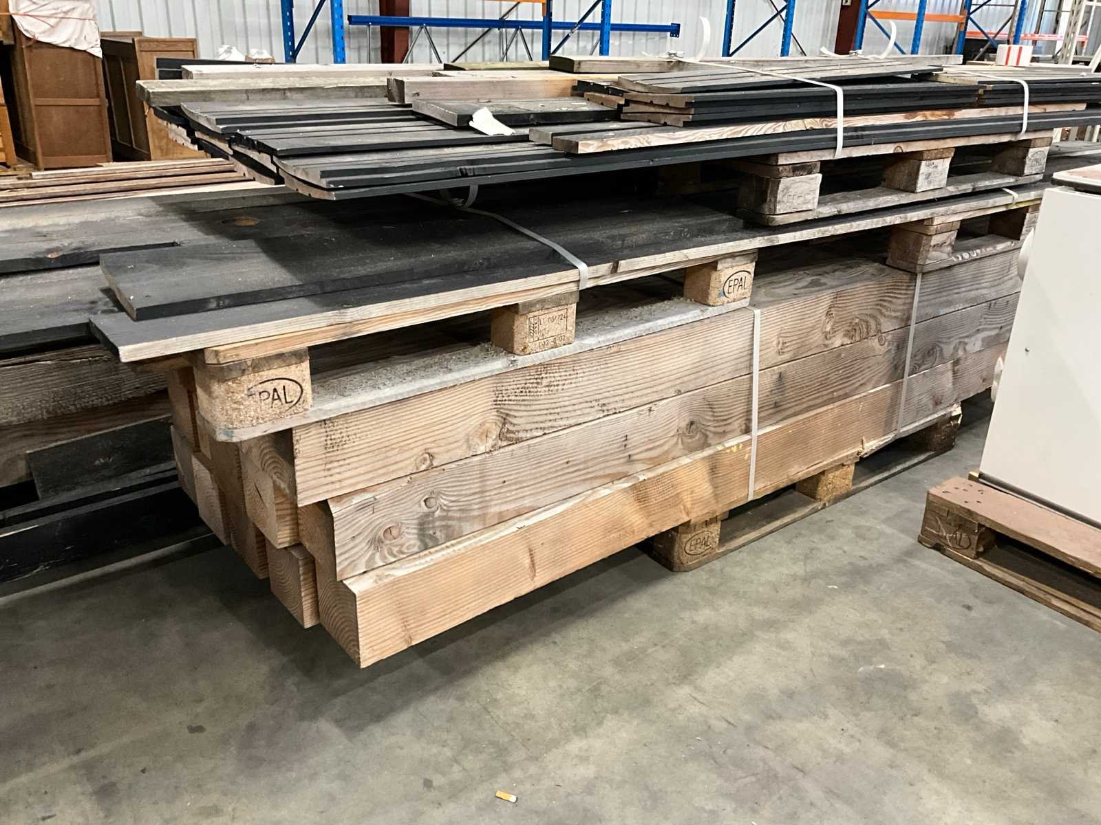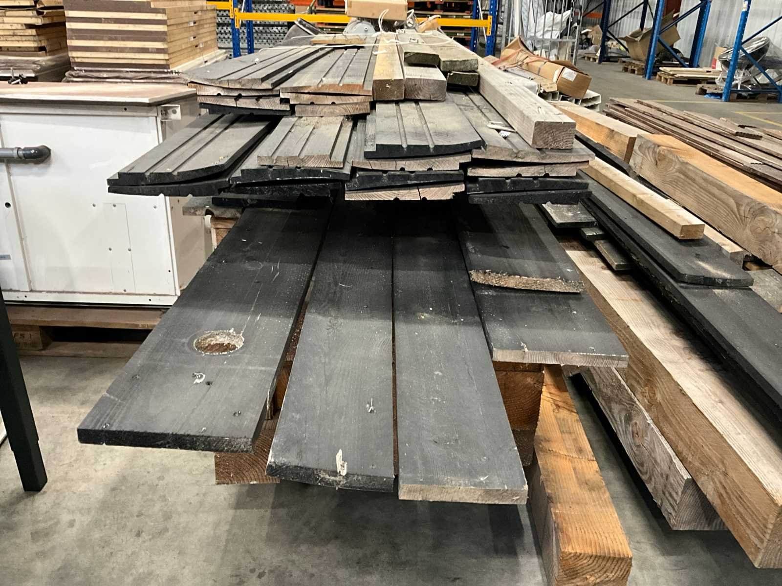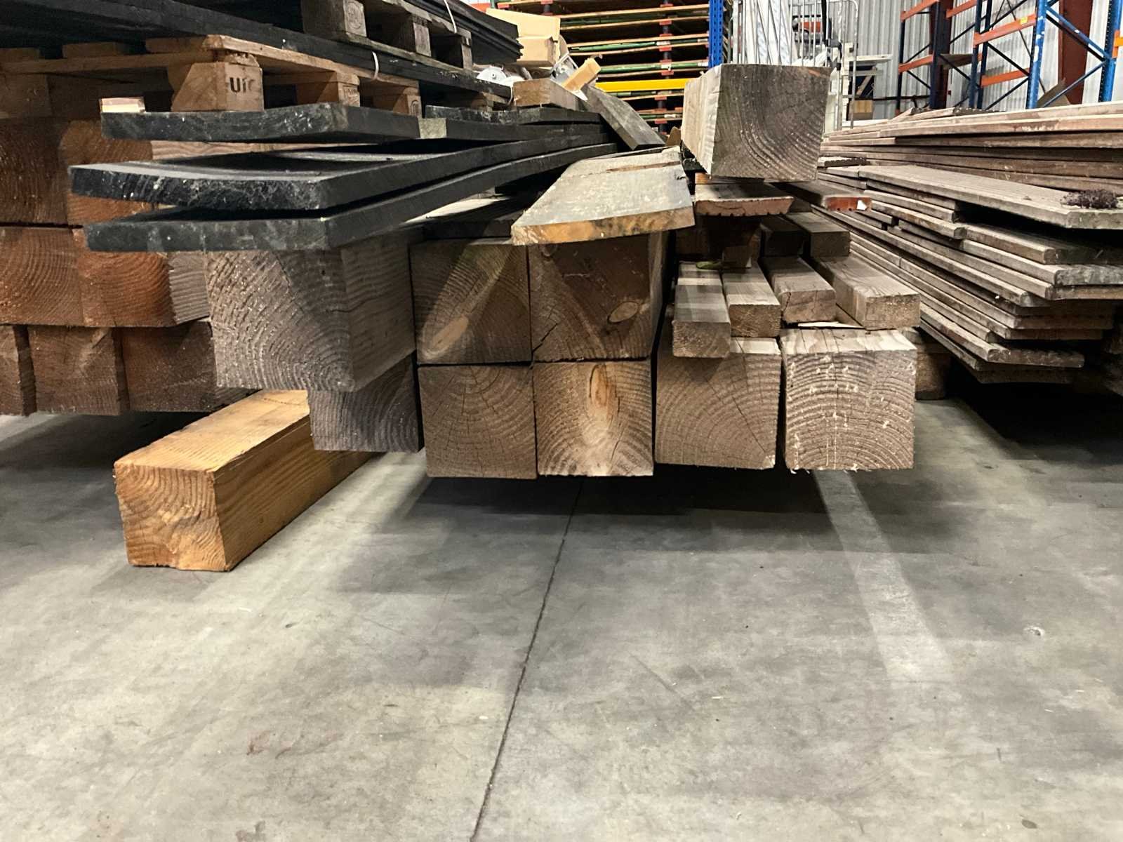 Waaronder 15 stuks balk Kopmaat 150x150 mm lengte 3000 mm, 8 stuks Kopmaat 150x150 mm lengte 4000 mm, 3 stuks Kopmaat 150x150 mm lengte 1500 mm, partij zwarte rabatdelen Kopmaat 195x20 mm in verschillende lengtes in totaal 3 pakketten.