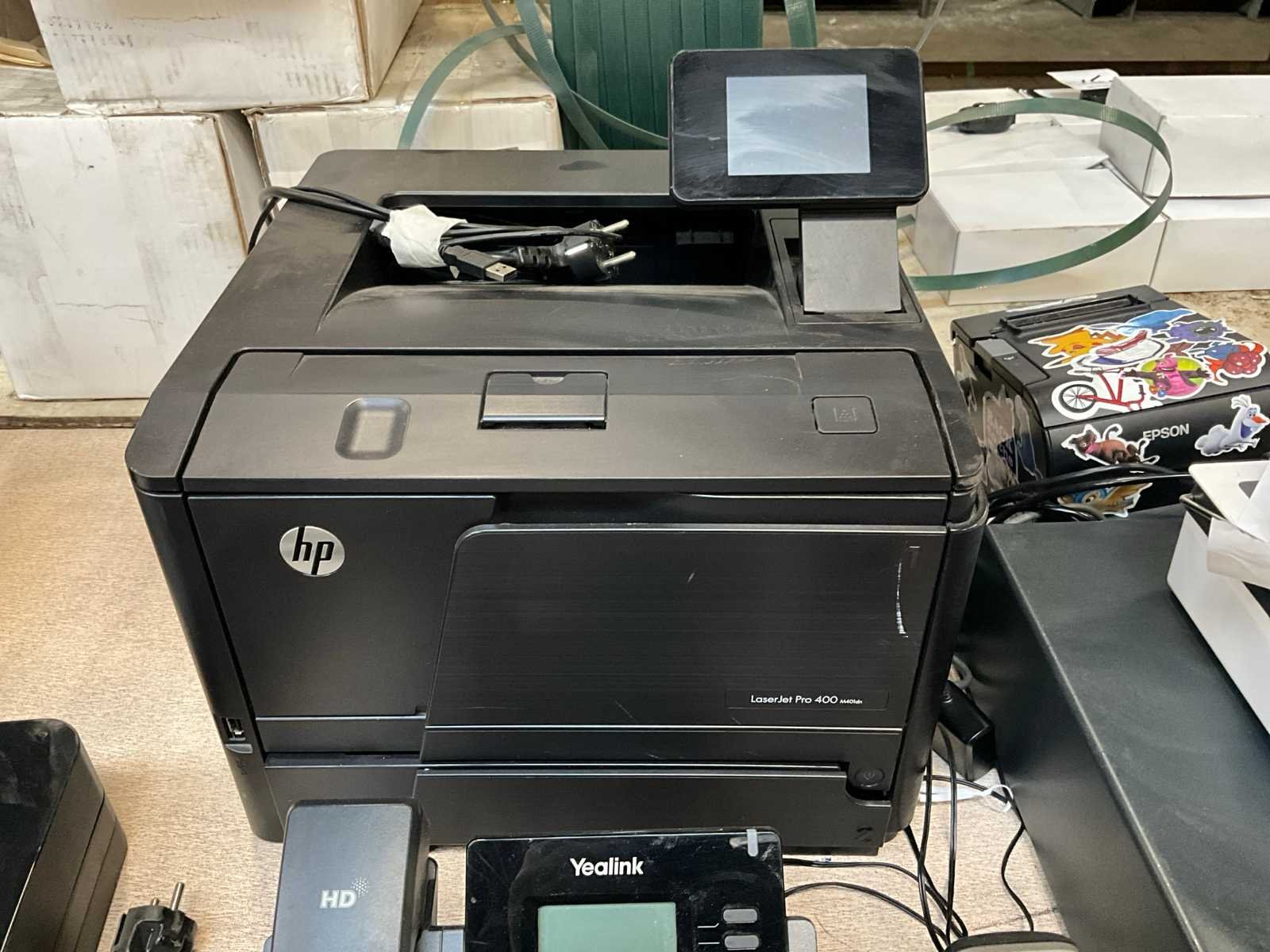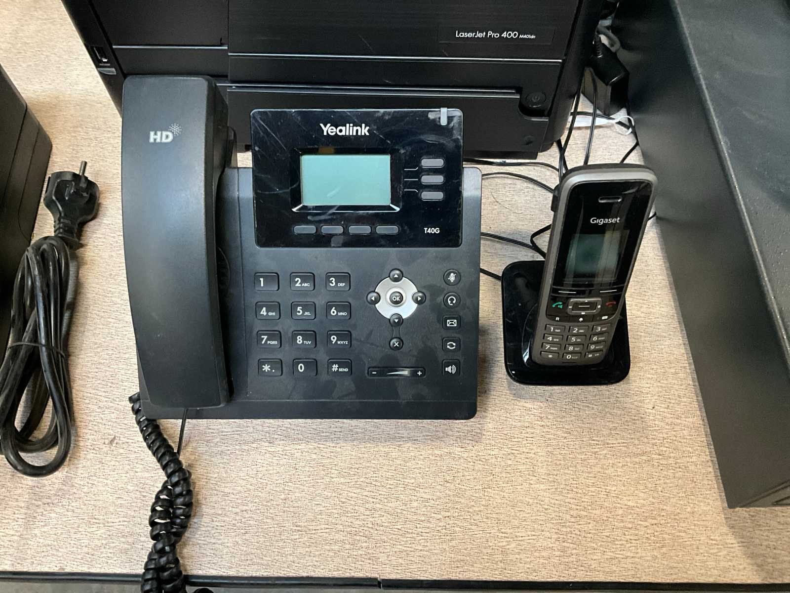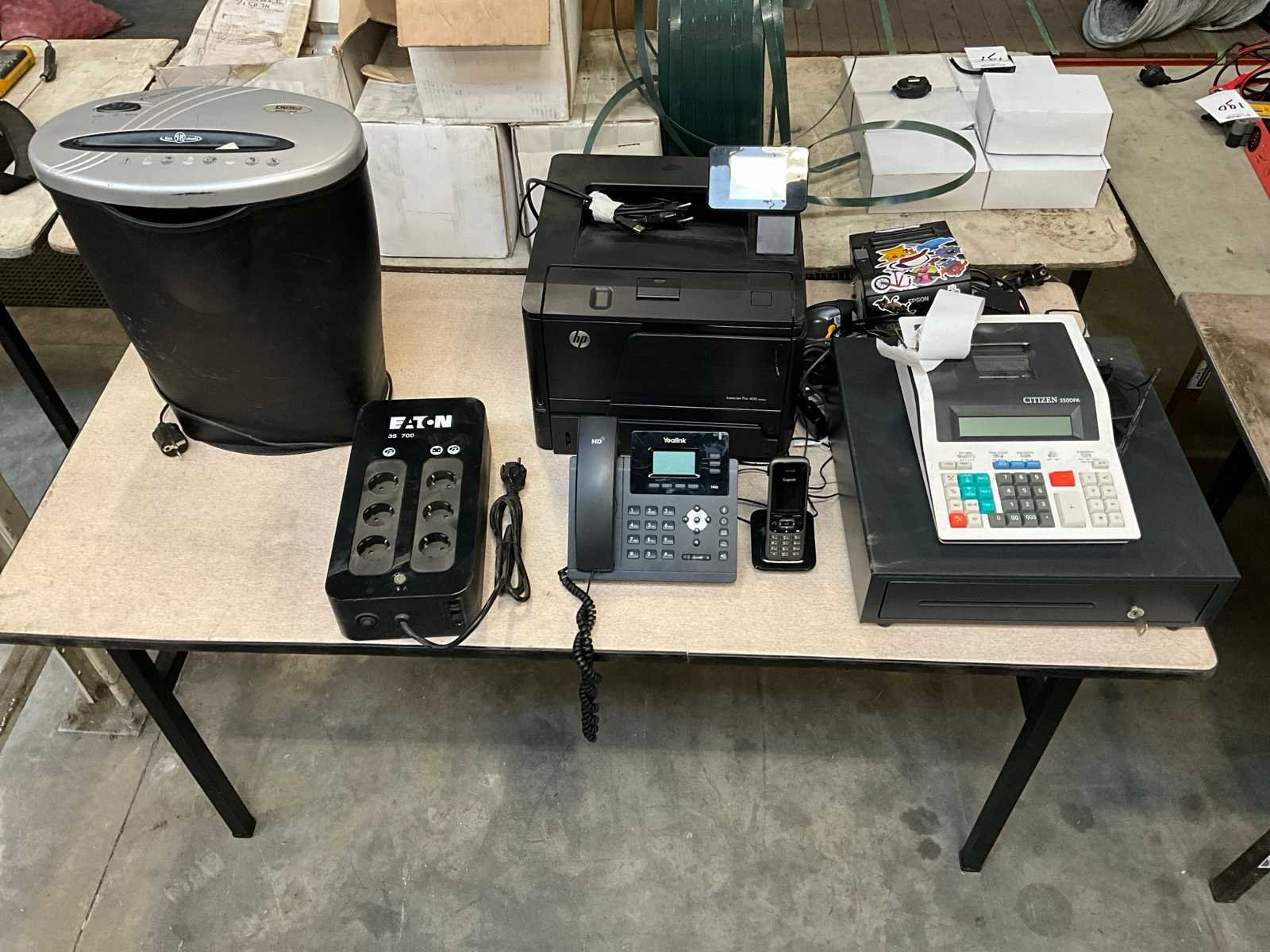 Waaronder HP Laserjet printer, kassalade, citizen rekenmachine, yealink telefoon, papierversnipperaar, en divers op 1 tafel