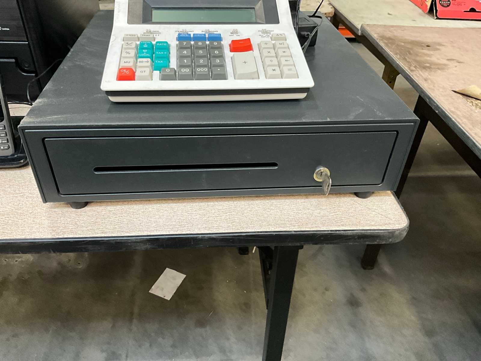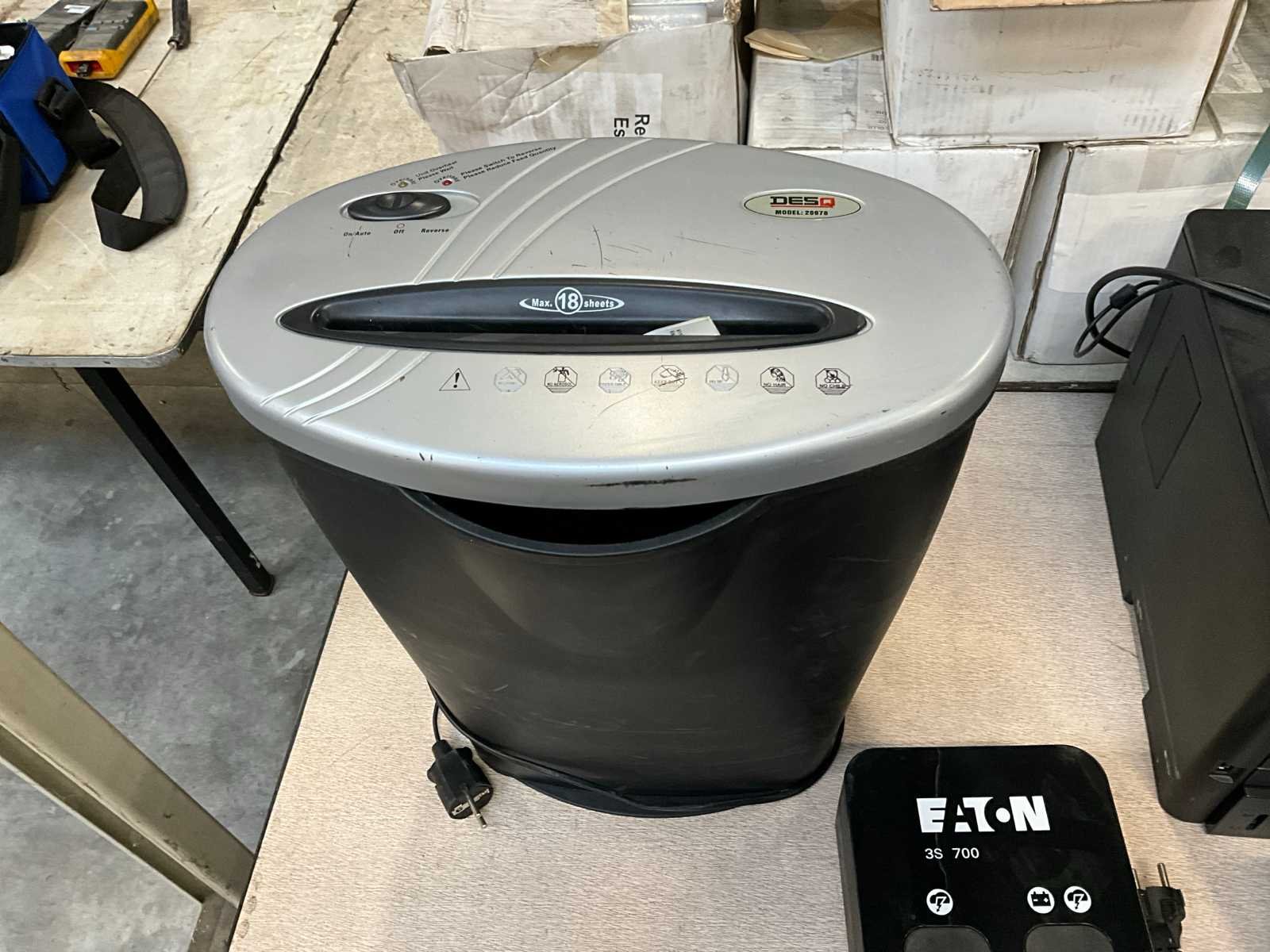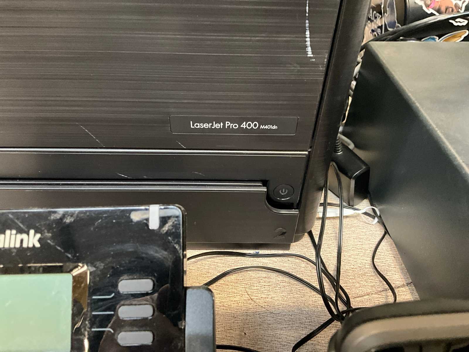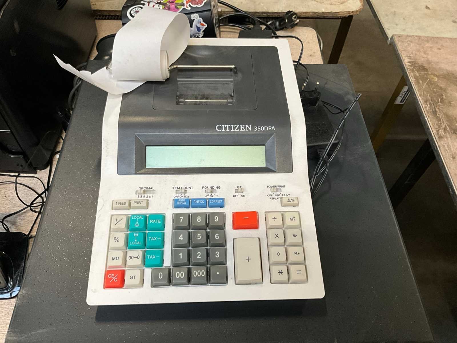 Waaronder HP Laserjet printer, kassalade, citizen rekenmachine, yealink telefoon, papierversnipperaar, en divers op 1 tafel