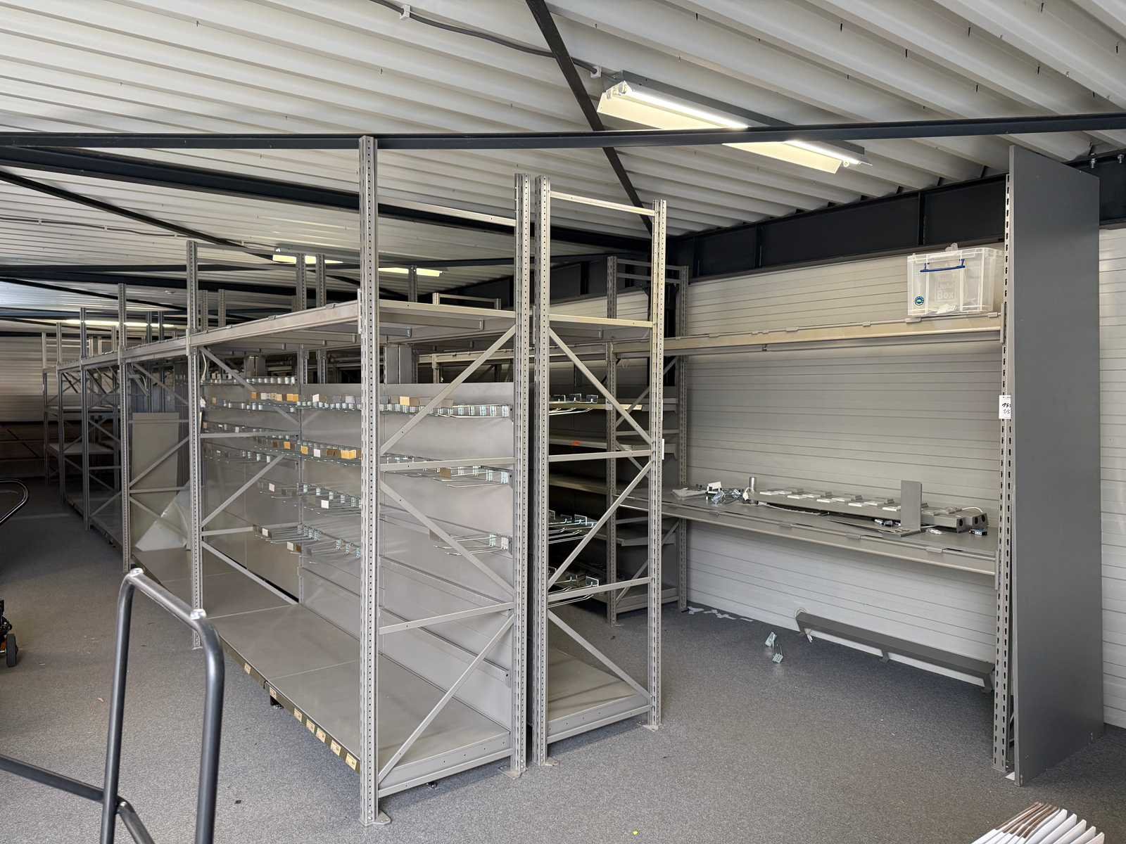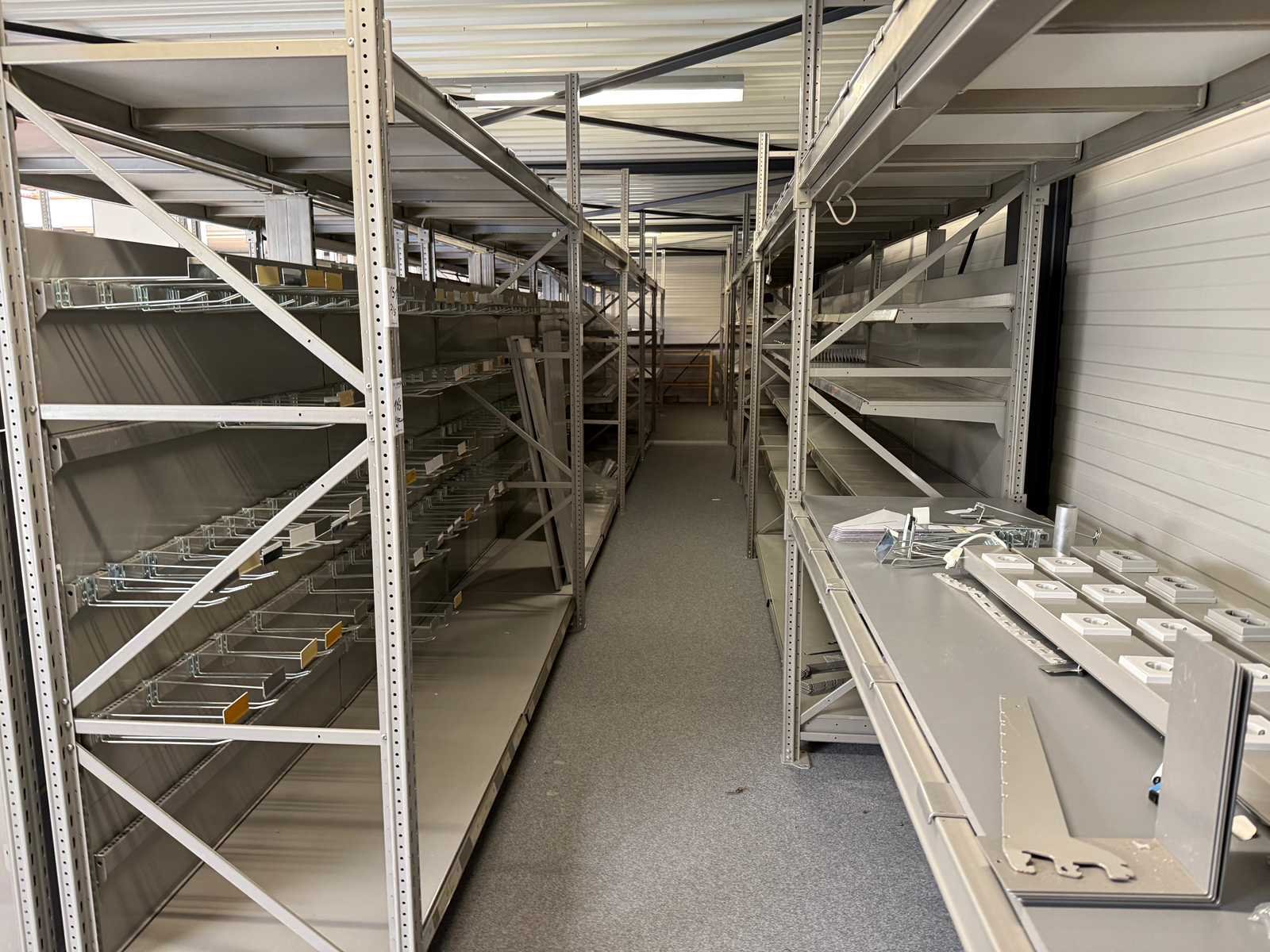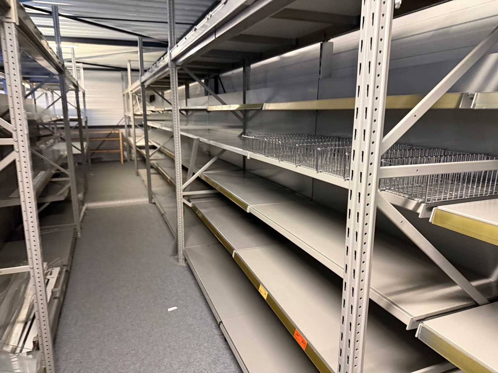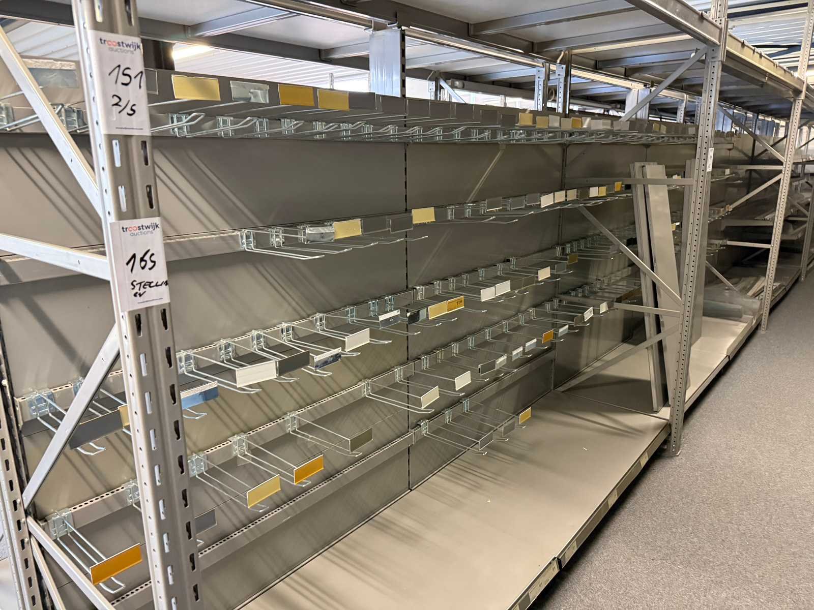 16 secties, 19 staanders ,46 liggers ,diverse haken en toebehoren, reeds gedemonteerd en ingepakt op pallets Merk: Tegometaal Afmeting l: 2700mm Afmeting b: 770mm Afmeting h: 2760mm Staal: true Aantal legborden: 41