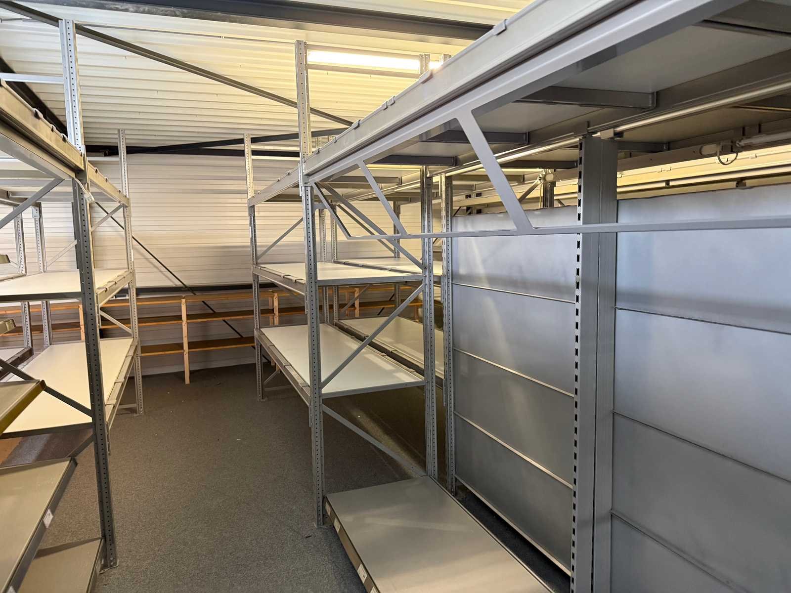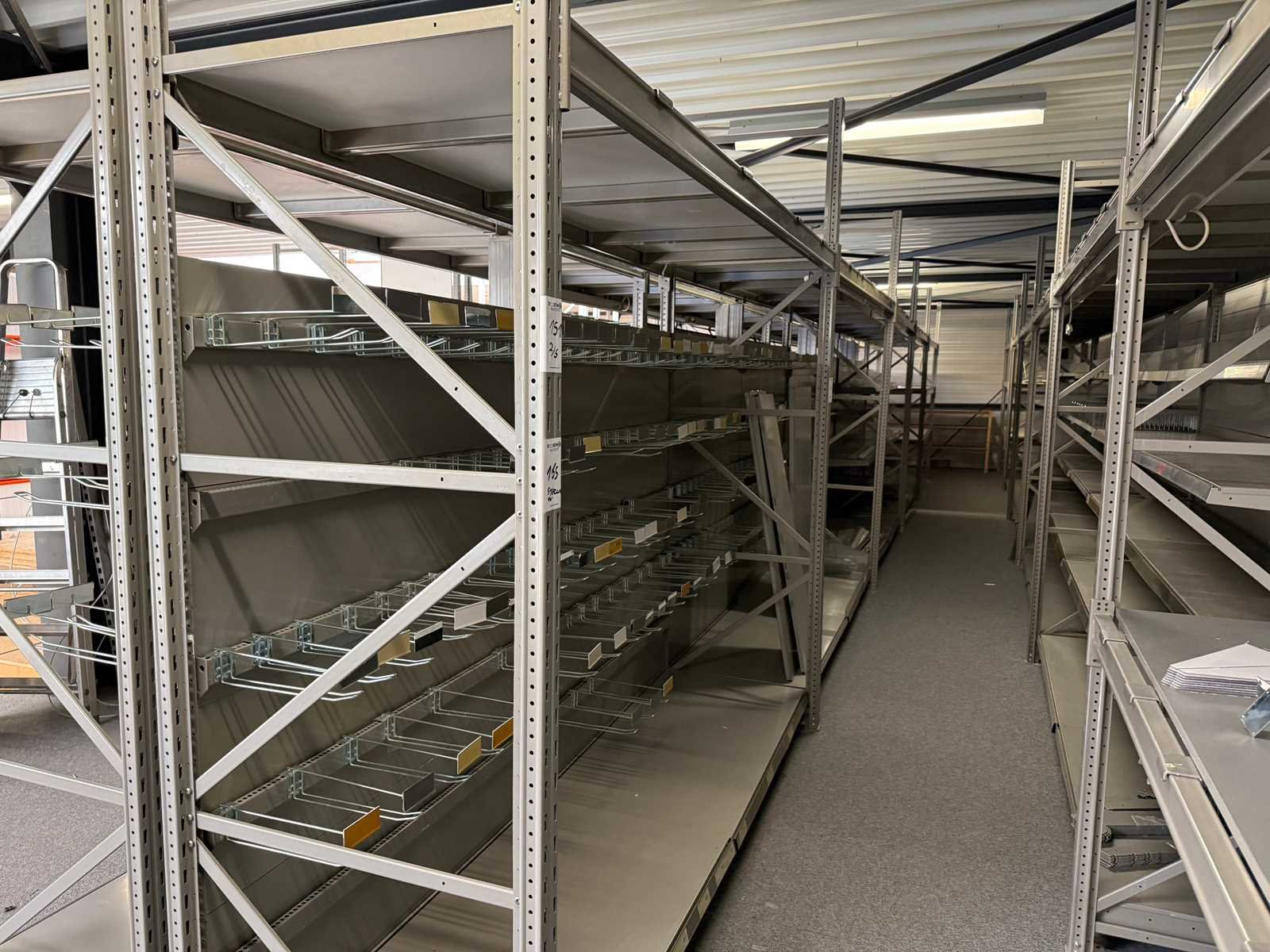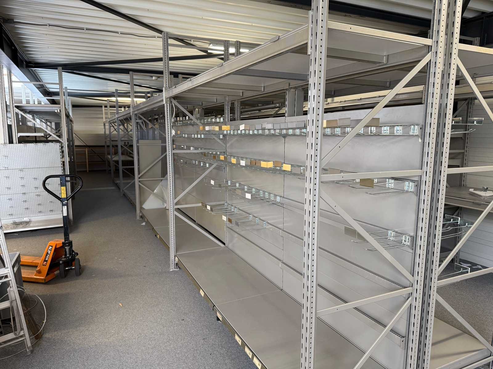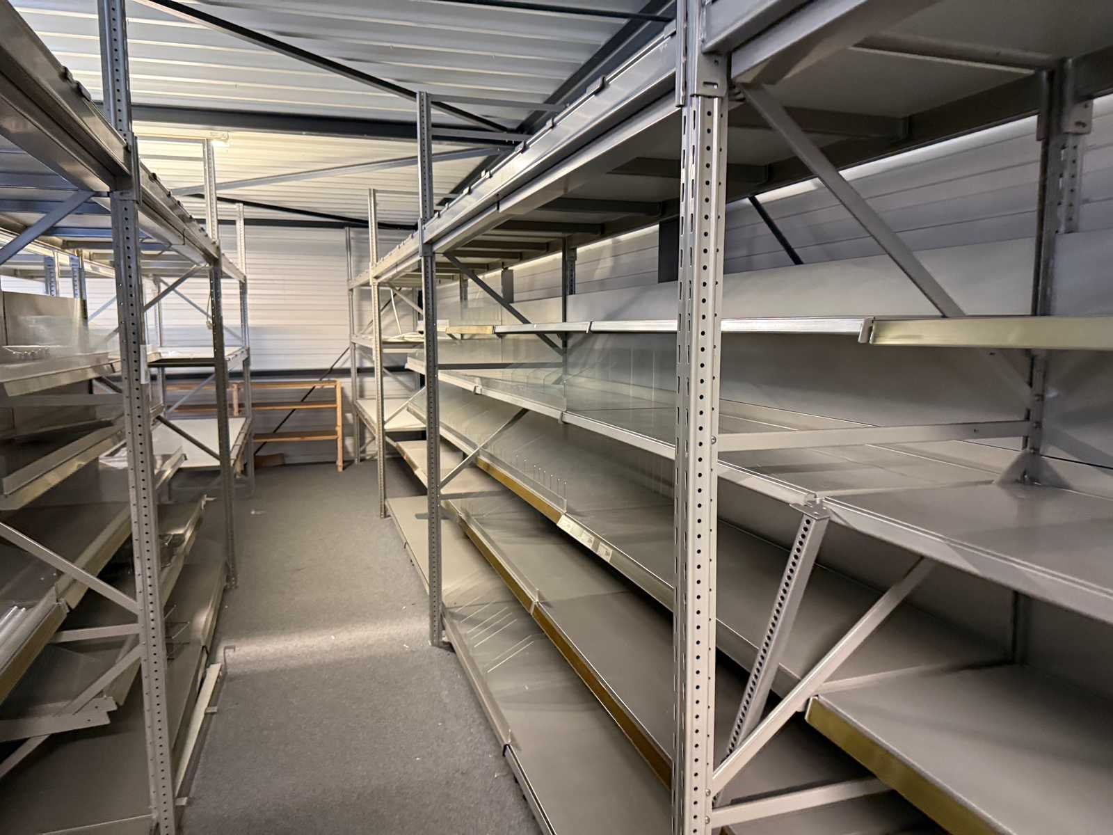 16 secties, 19 staanders ,46 liggers ,diverse haken en toebehoren, reeds gedemonteerd en ingepakt op pallets Merk: Tegometaal Afmeting l: 2700mm Afmeting b: 770mm Afmeting h: 2760mm Staal: true Aantal legborden: 41