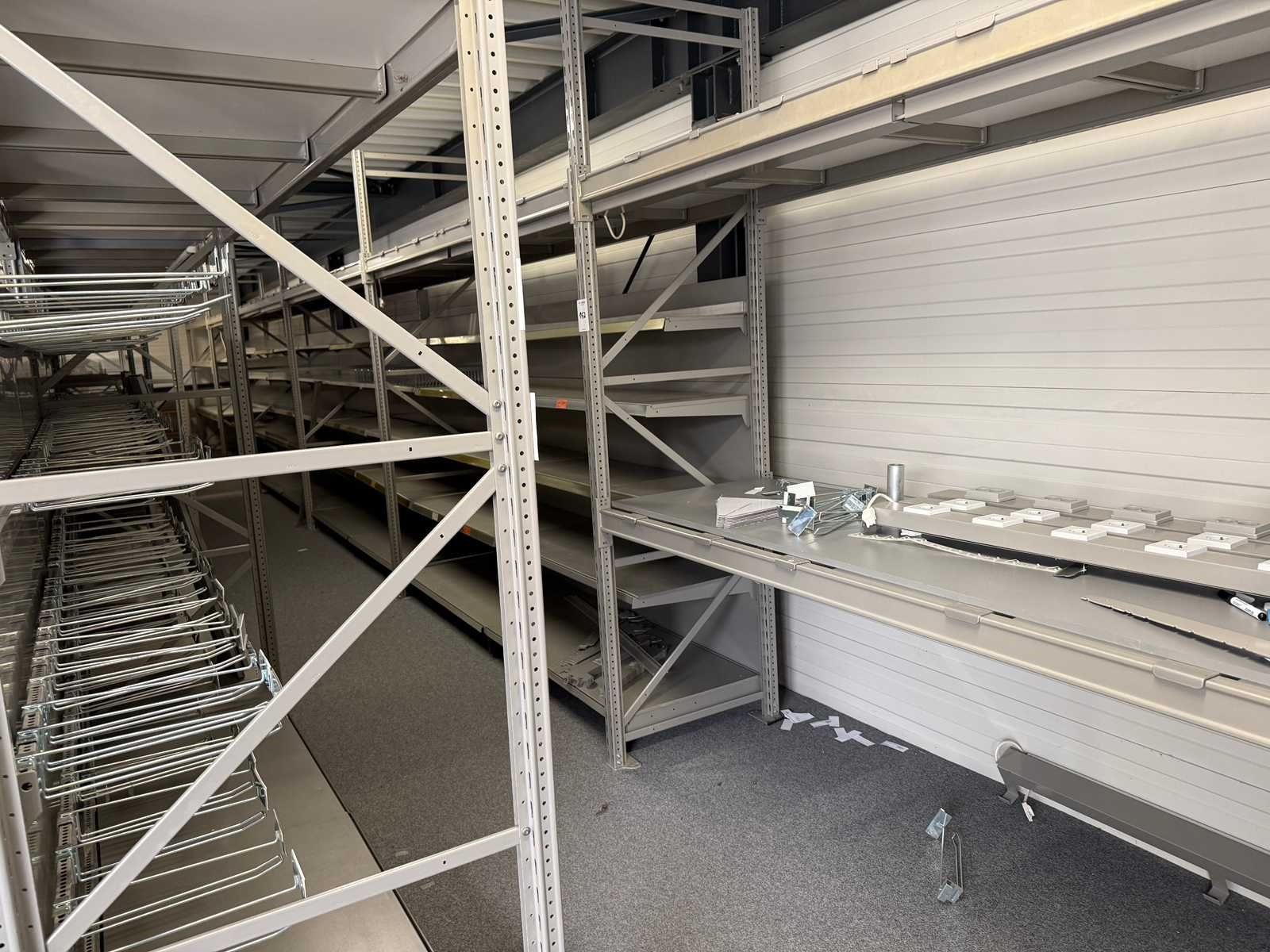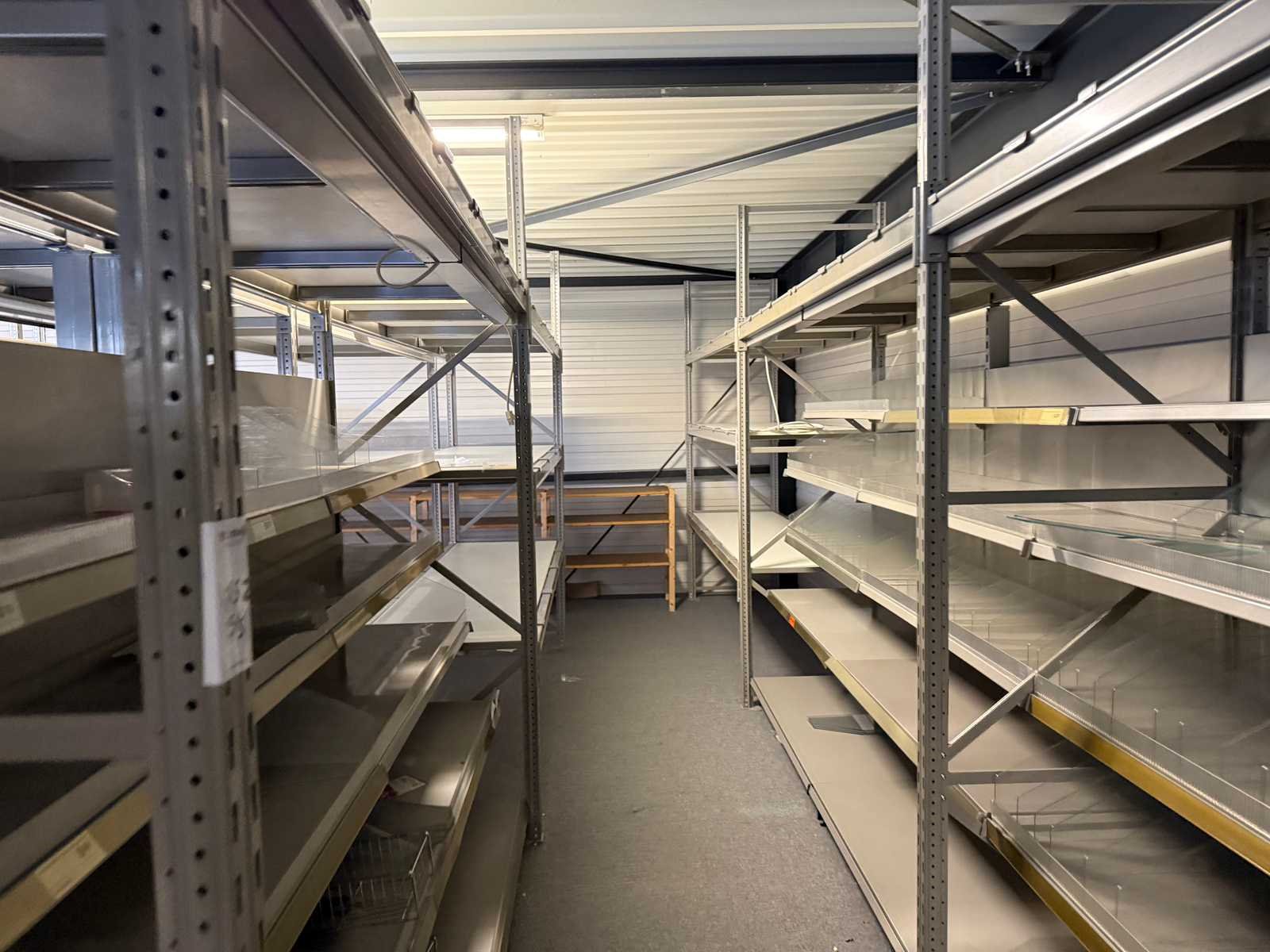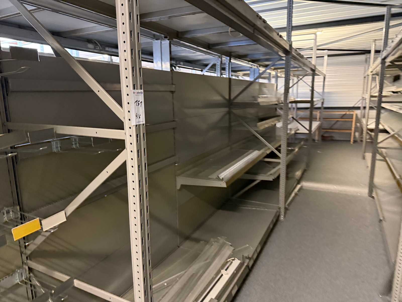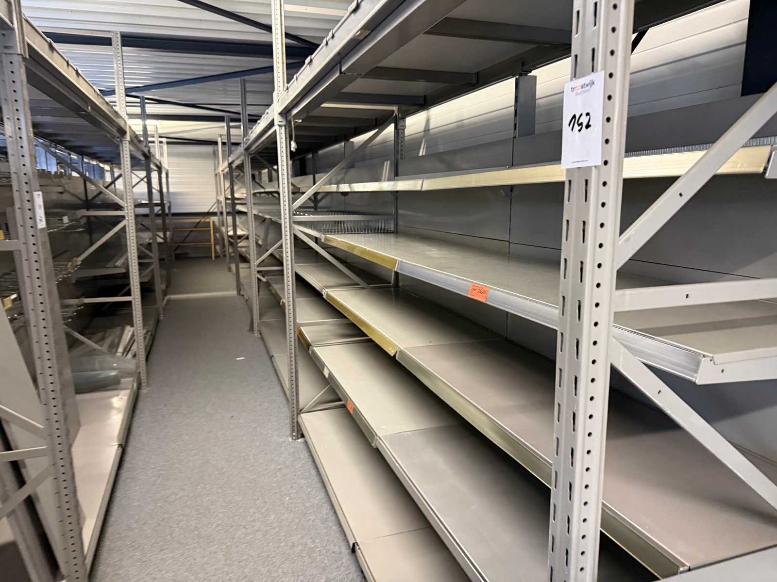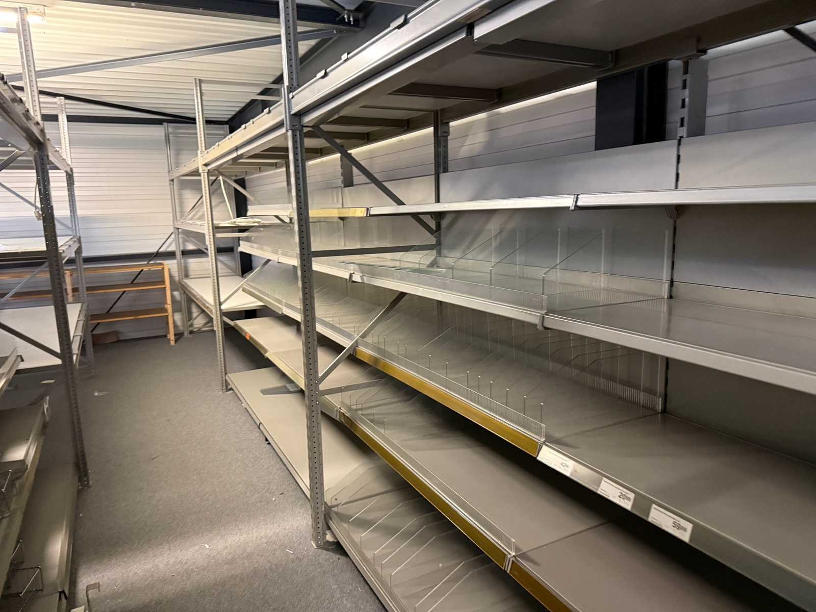 16 secties, 19 staanders ,46 liggers ,diverse haken en toebehoren, reeds gedemonteerd en ingepakt op pallets Merk: Tegometaal Afmeting l: 2700mm Afmeting b: 770mm Afmeting h: 2760mm Staal: true Aantal legborden: 41