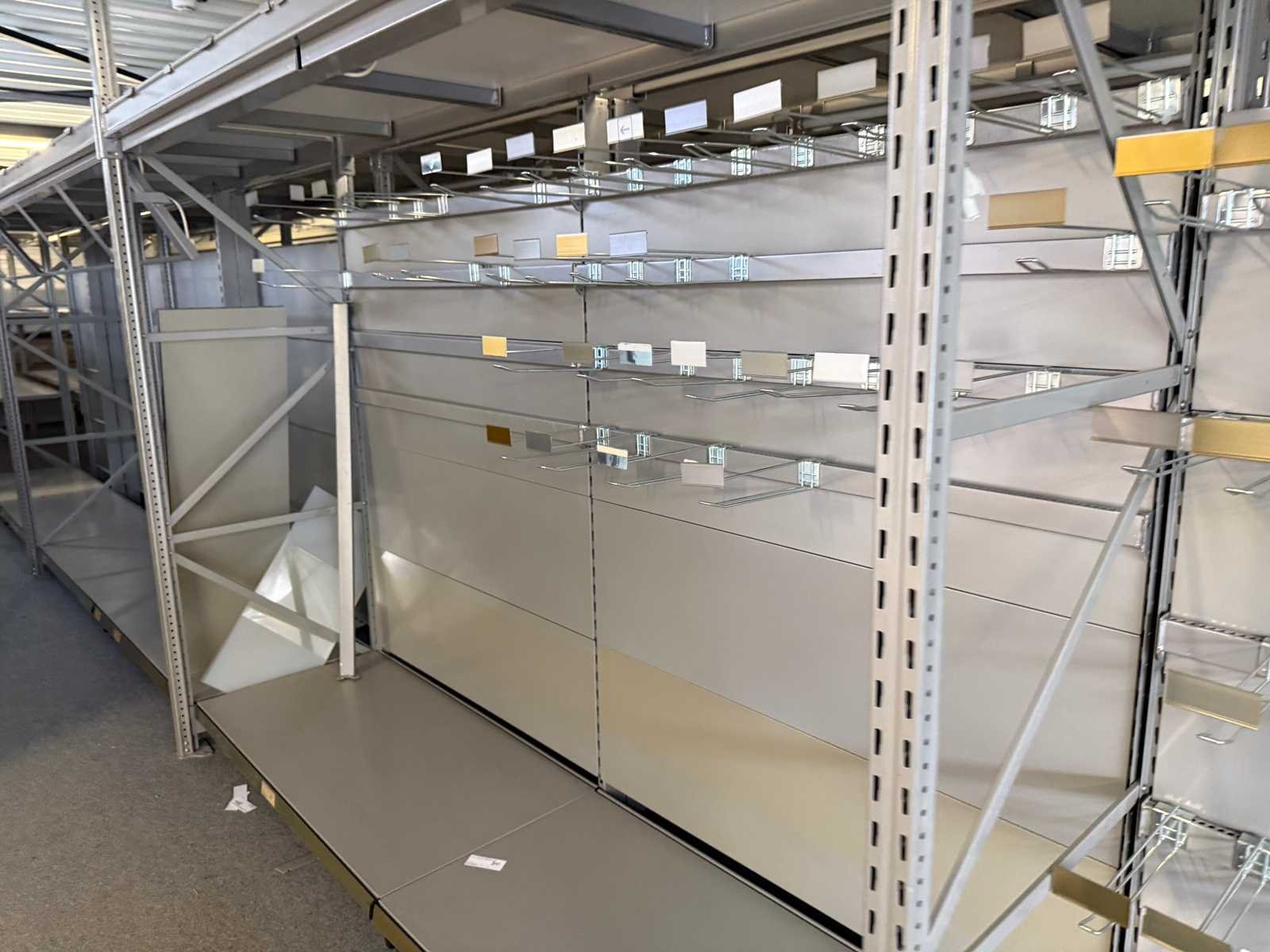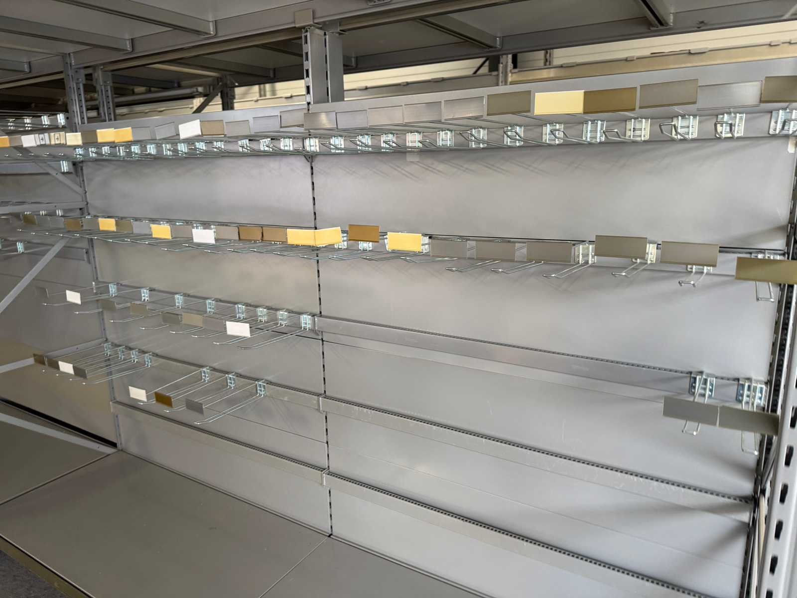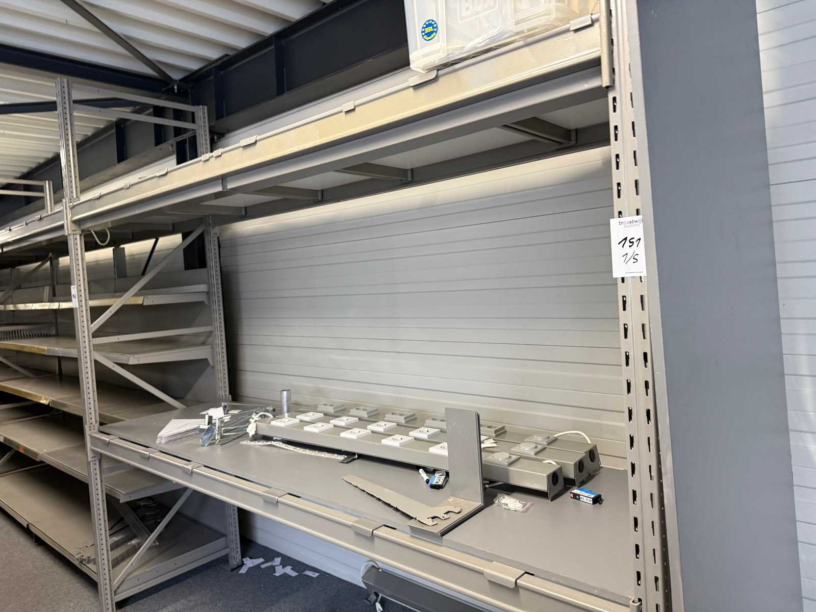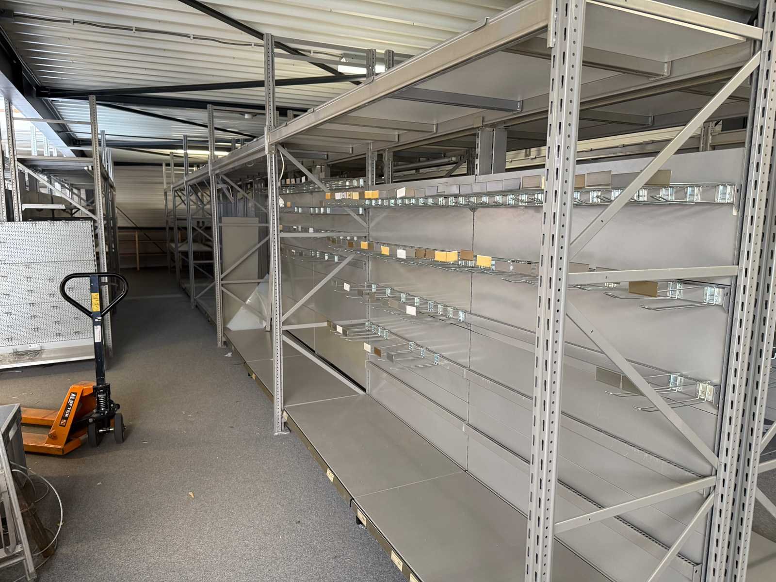 16 secties, 19 staanders ,46 liggers ,diverse haken en toebehoren, reeds gedemonteerd en ingepakt op pallets Merk: Tegometaal Afmeting l: 2700mm Afmeting b: 770mm Afmeting h: 2760mm Staal: true Aantal legborden: 41