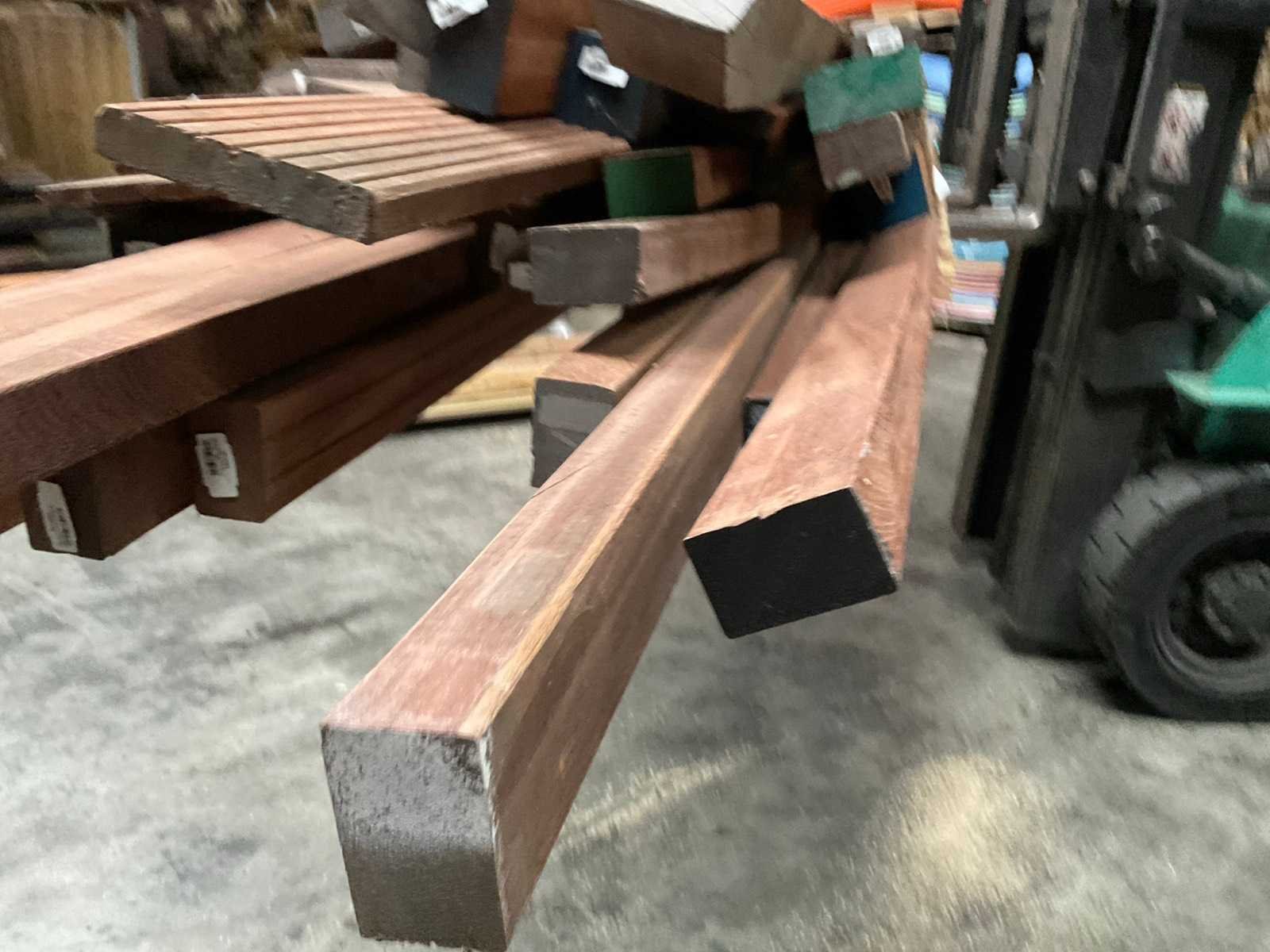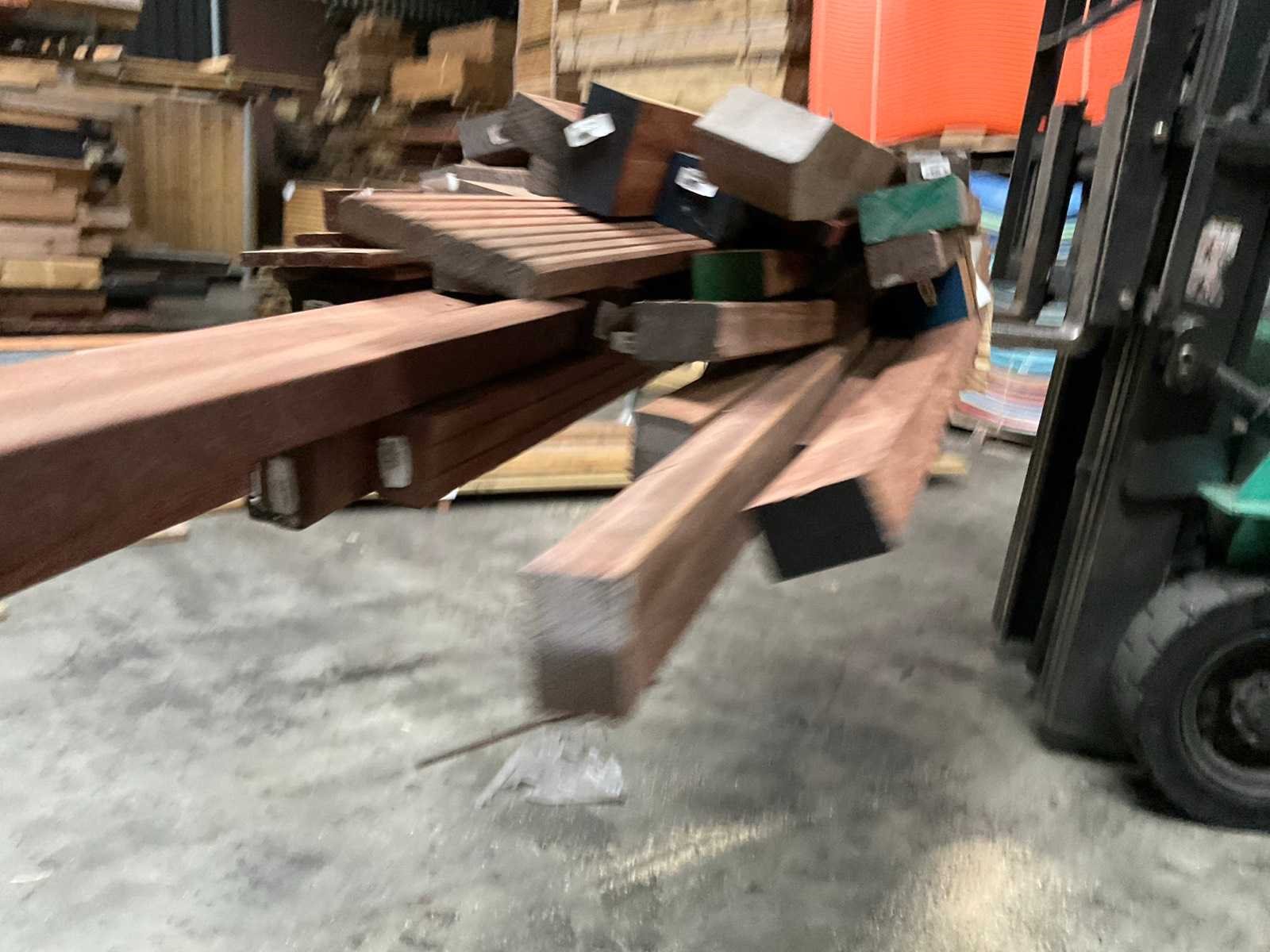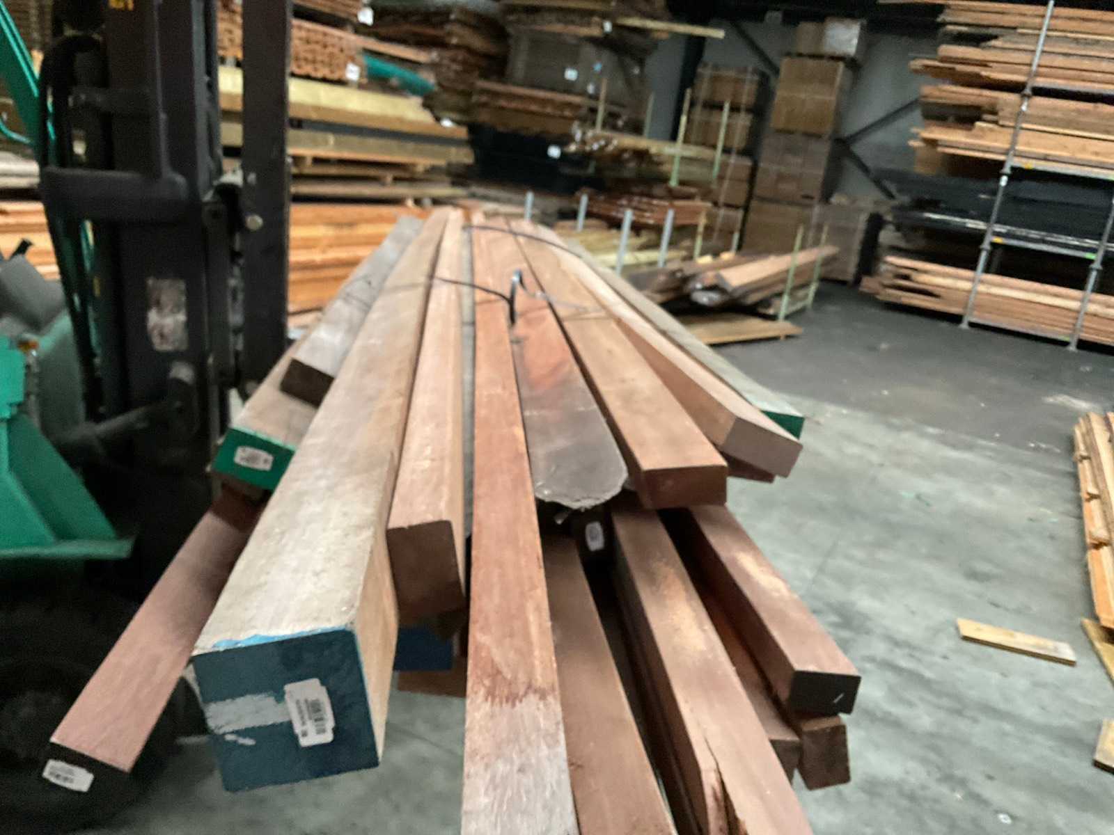 Partij Azobé hardhout met diverse beschadigingen en verkleuringen. Verschillende modellen en verschillende kopmaten aanwezig. Zie foto’s voor alle details en specificaties. Houtsoort: Azobé hardhout Lengte: 500cm Gewicht: 900kg
