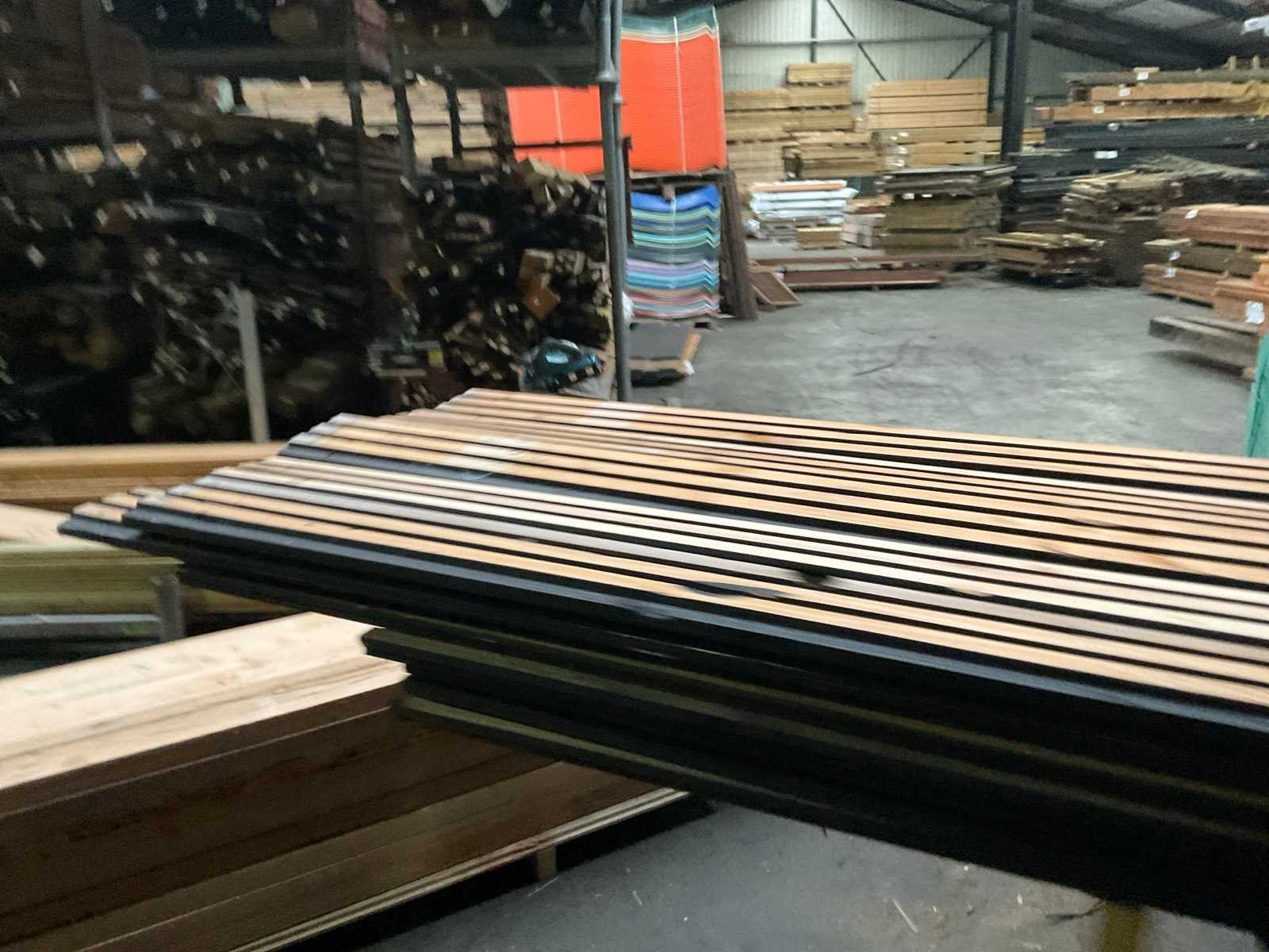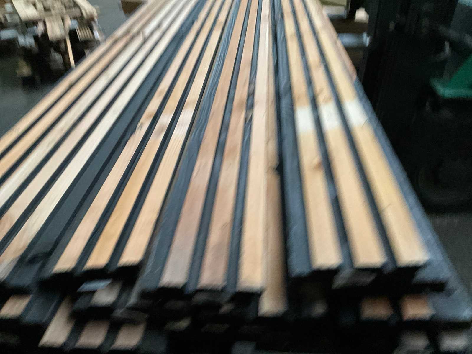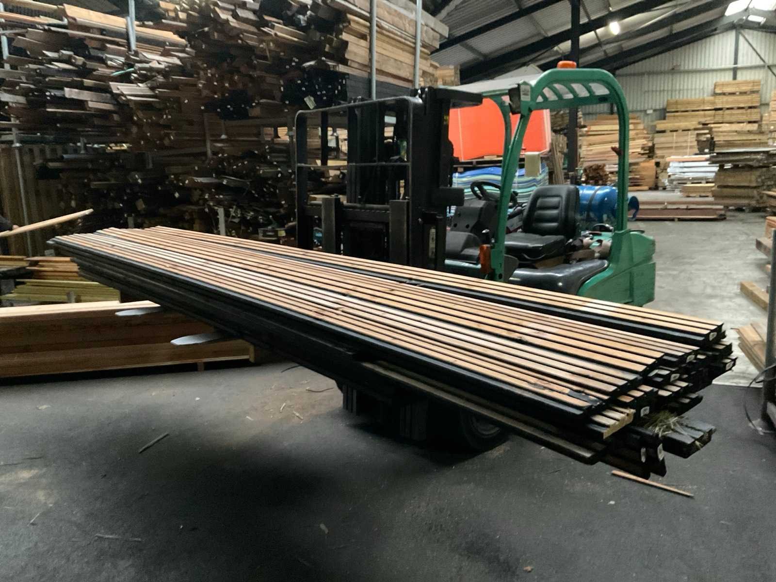 Douglas triple rhombusprofielplanken, 14,5×2,8 cm (totaal 50 stuks). 20 stuks van 300 cm en 30 stuks van 400 cm. Vergrijzing en lichte beschadigingen aanwezig. Houtsoort: Douglas Materiaal: Zwart gespoten Lengte: 400cm Kopmaat: 28x145 Gewicht: 875kg