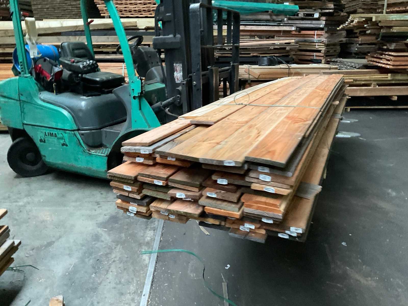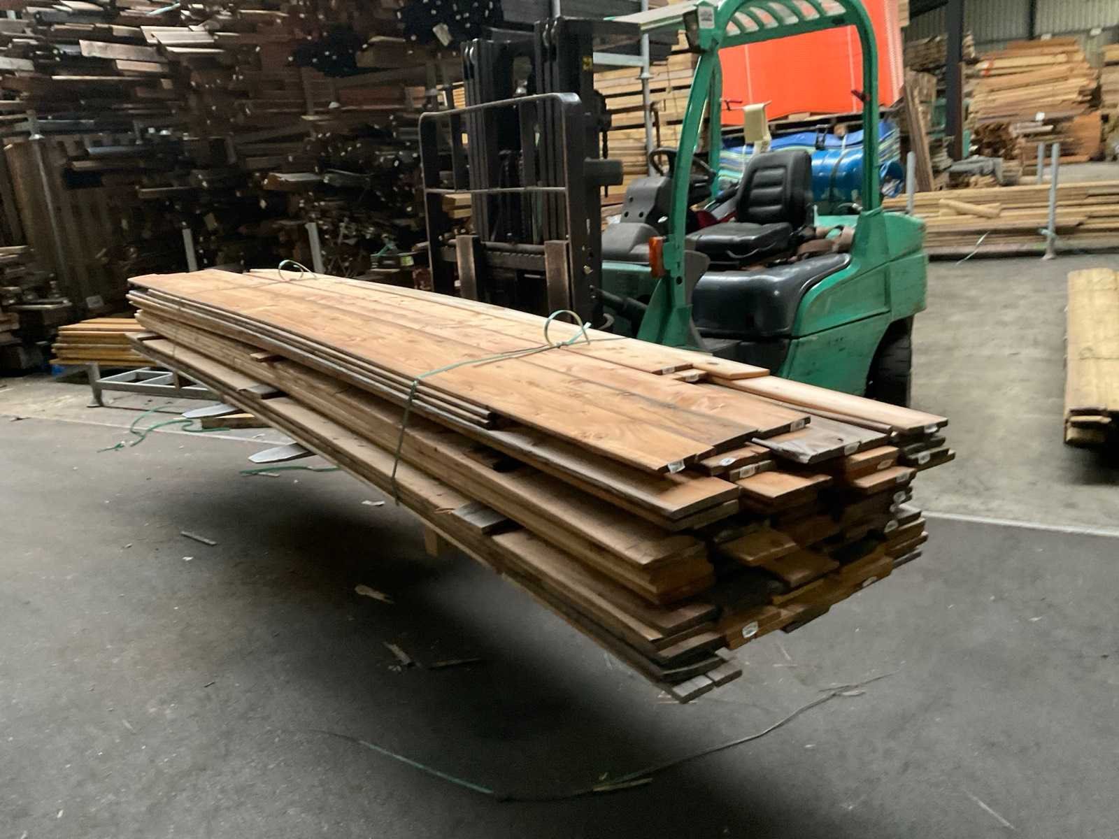 Lengte ca. 300 cm. Gemixt in kopmaten: 16×140 mm, 18×145 mm en 18×160 mm. Totaal ca. 80 stuks. Kleine beschadigingen en verkleuringen aanwezig, zie foto's. Houtsoort: Douglas Lengte: 300cm Kopmaat: 17x140 Gewicht: 875kg