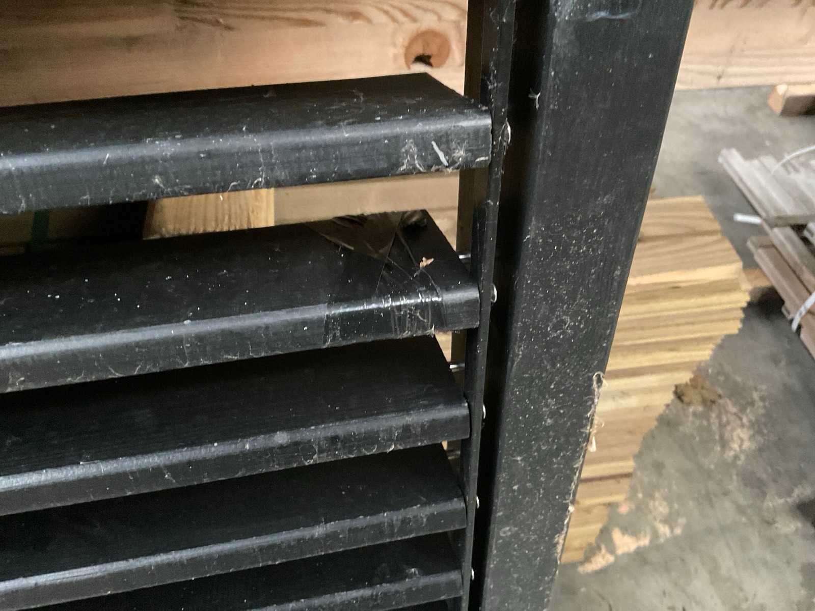 Douglas zwart gespoten Shutterscherm 120x225 cm. Merk: Hillhout Model: Verstelbare schutter lamelle Gewicht: 50kg Breedte: 120cm Hoogte: 225cm Materiaal: Douglas zwart gespoten