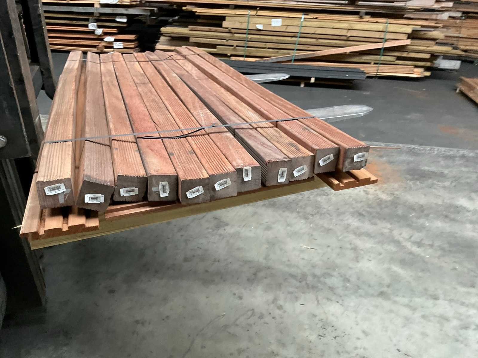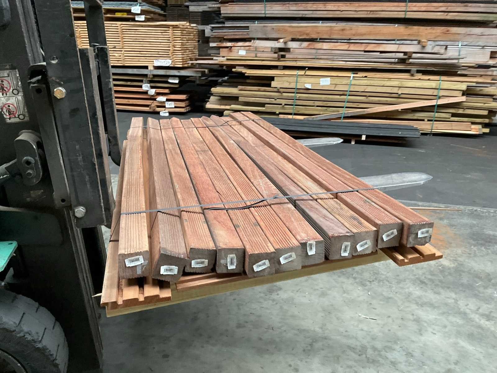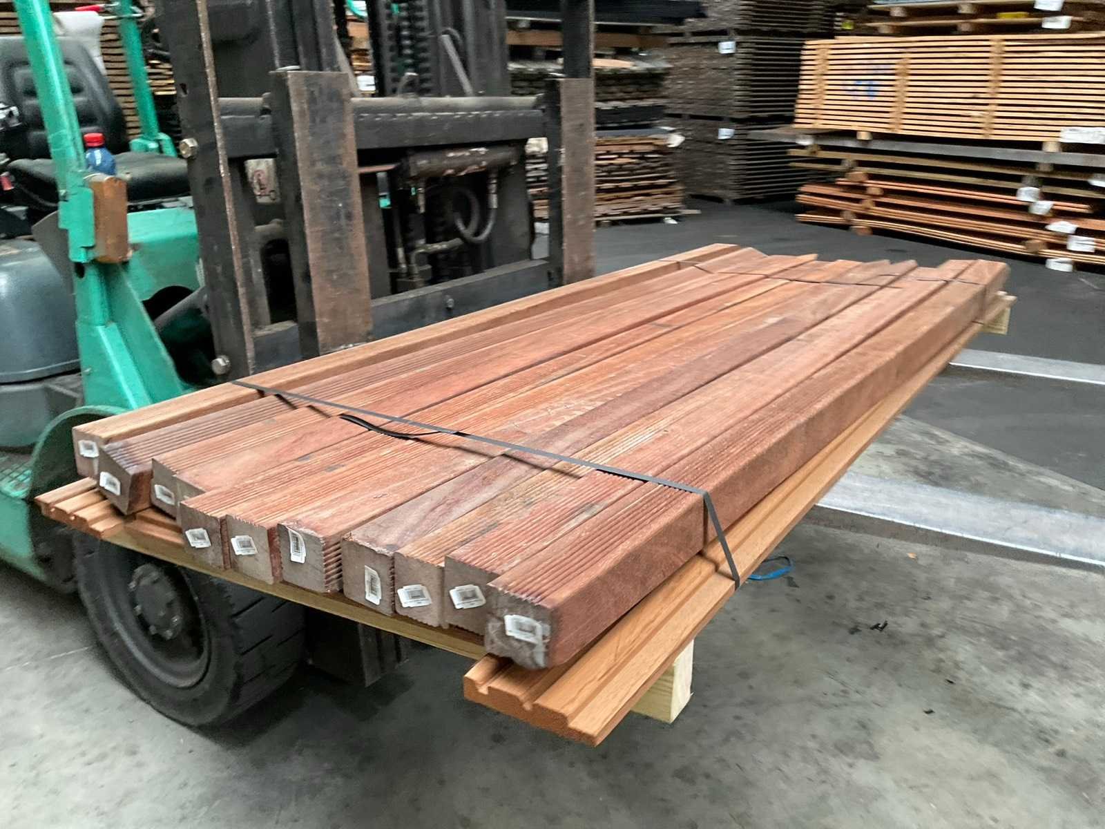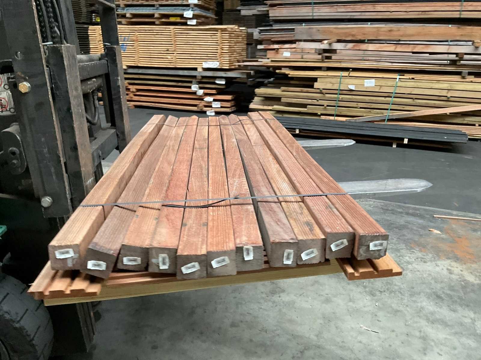 Let op: Retour goed, zie foto's voor details. Houtsoort: Azobé Materiaal: Hardhout Kopmaat: 65x65 Gewicht: 125kg Totale afmeting Breedte: 2000mm