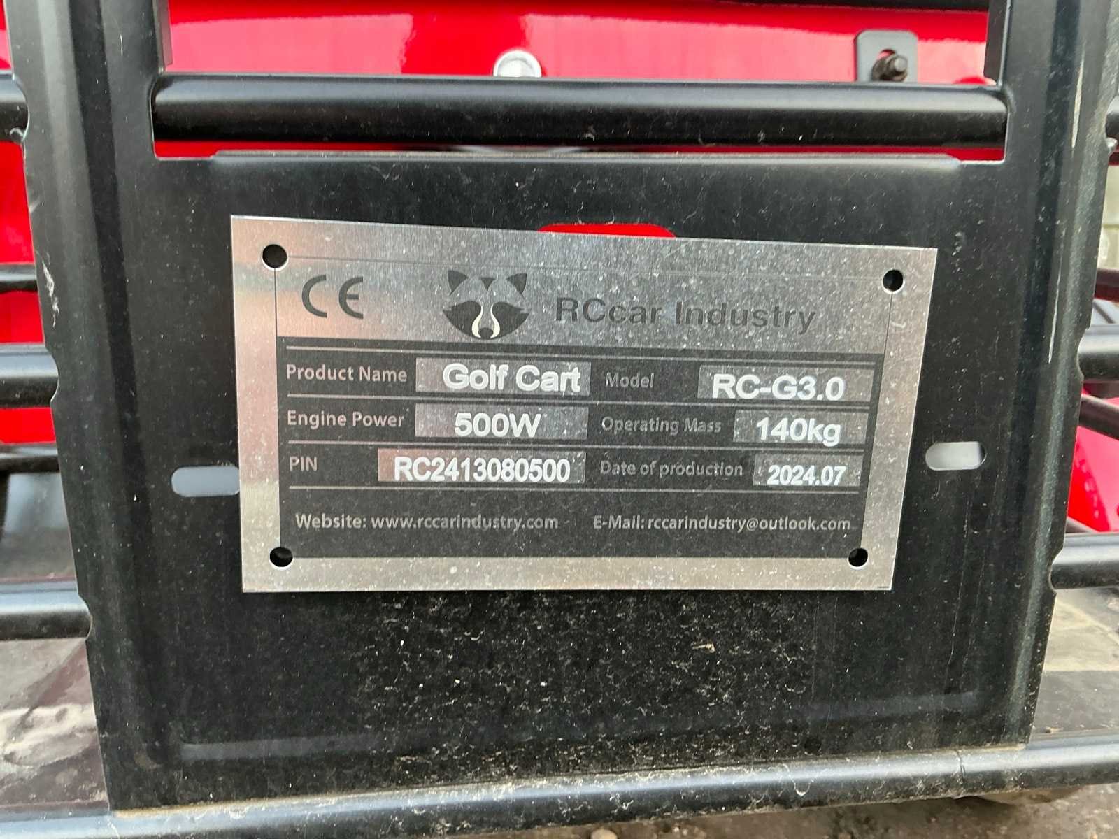 Inclusief lader 110V, 60V accupakket, bagage rekjes, 3 zitplaatsen, led verlichting Merk: RC-car Industry Model: RC-G3.0 Kleur: Rood Bouwjaar: 2024 Serienummer: RC2413080500 Gewicht: 140 Lengte: 2100 Breedte: 850 Hoogte: 1250