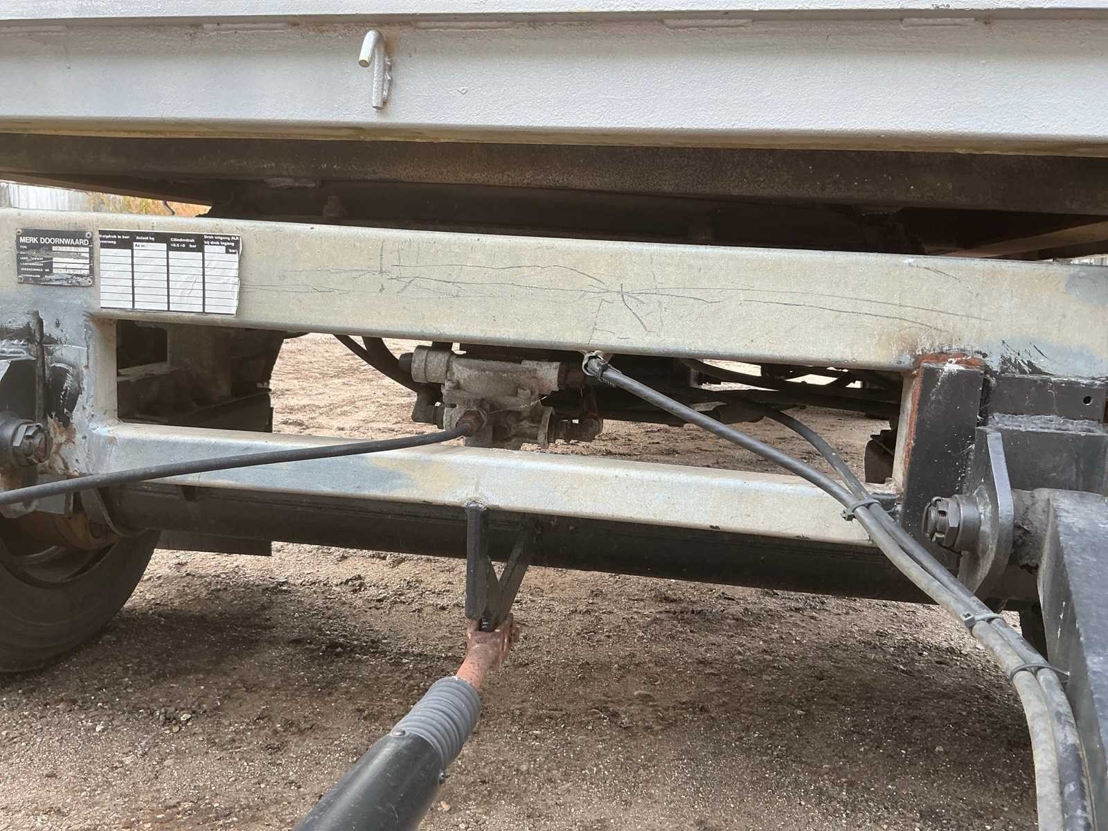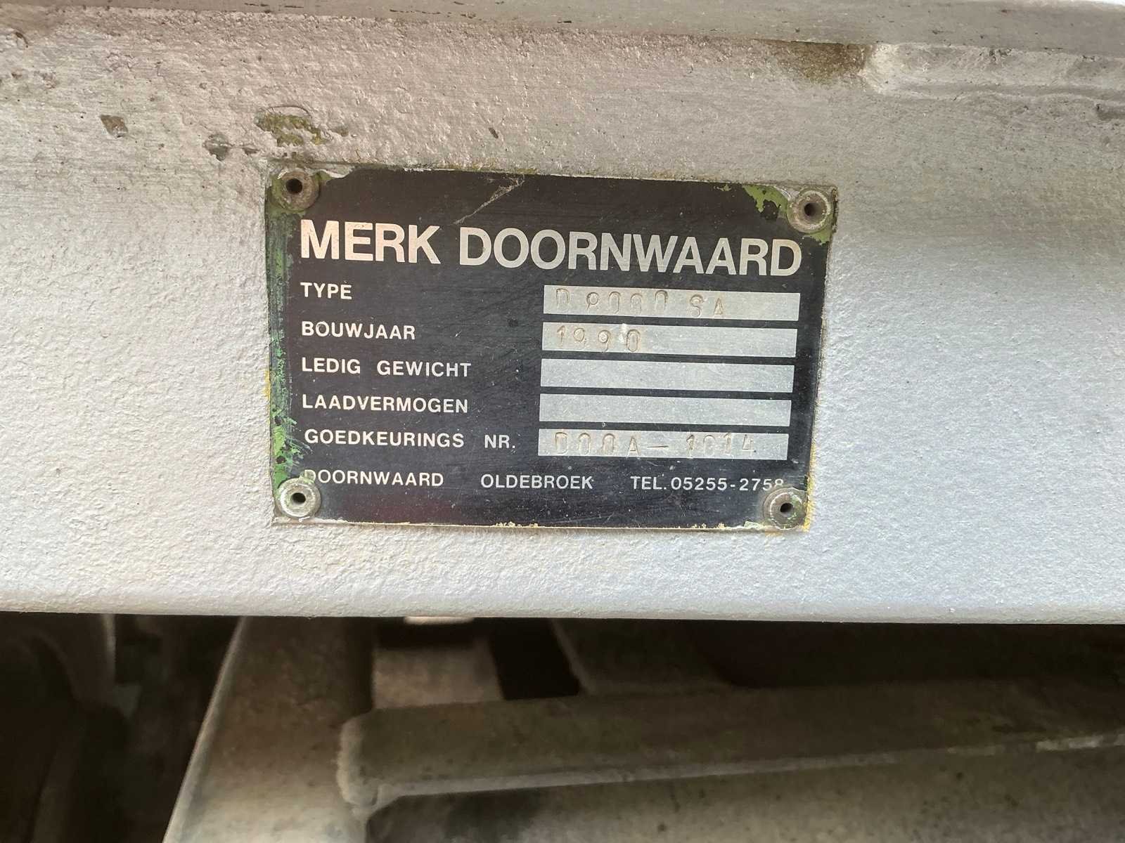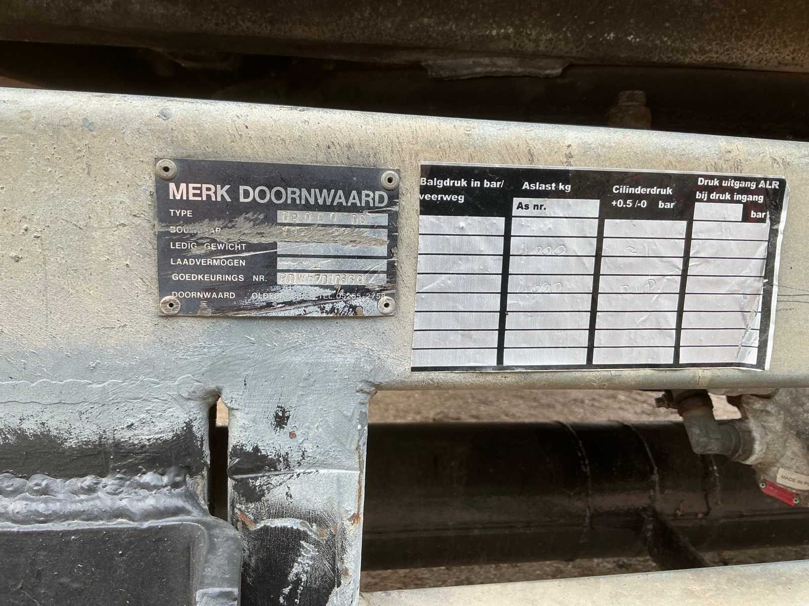 40mm sleepoog, duomatic, 7-polige stekker 24V, lucht remmen, vloerhoogte 970mm Merk: Doornwaard Type: D8000SA Bouwjaar: 1990 Chassisnummer: 705090 Aantal assen: 2 Laadbak afmeting l: 610cm Laadbak afmeting b: 220cm Ledig gewicht: 2220kg Laadvermogen: 5780kg Datum eerste toelating: 1990-11-14 Datum eerste toelating (NL): 1990-11-14 Kenteken: WF-52-VN Hoogte: 2cm Lengte: 805cm Breedte: 220cm Nationaliteit documenten: Nederlands