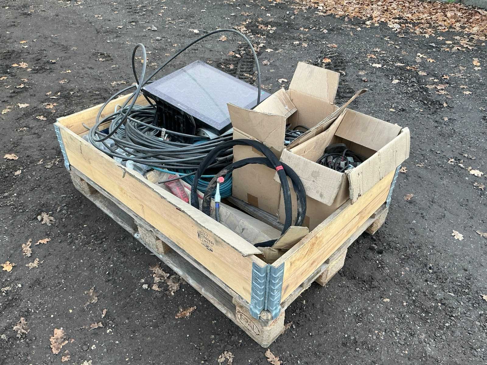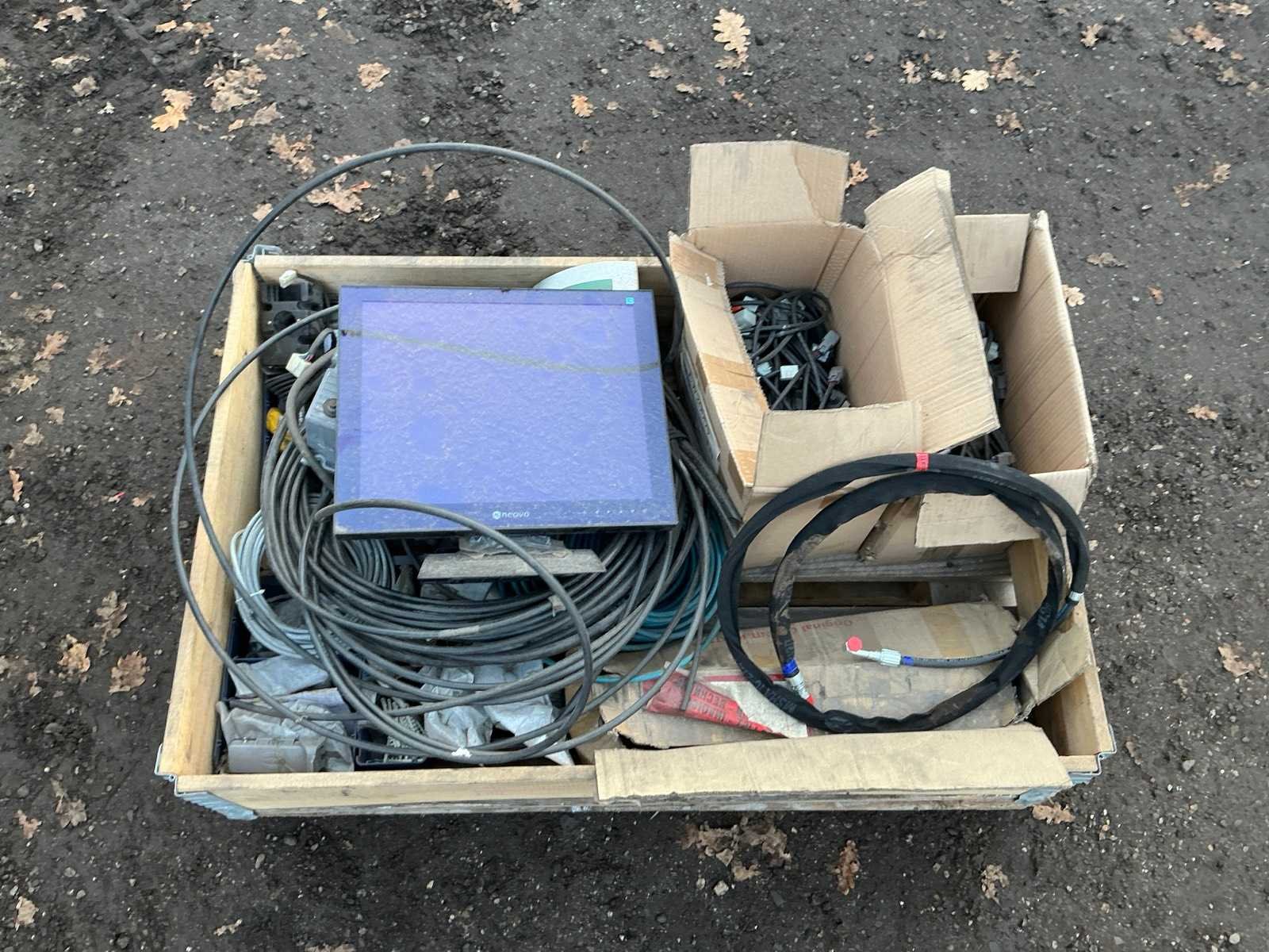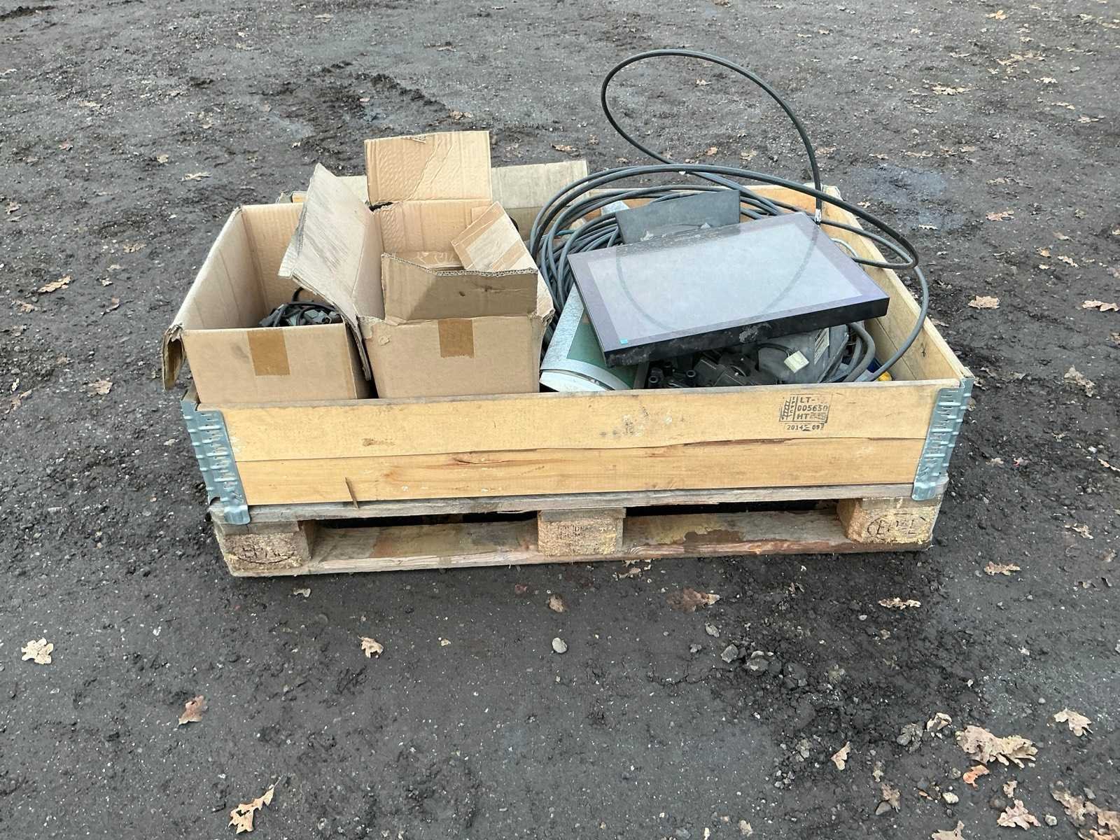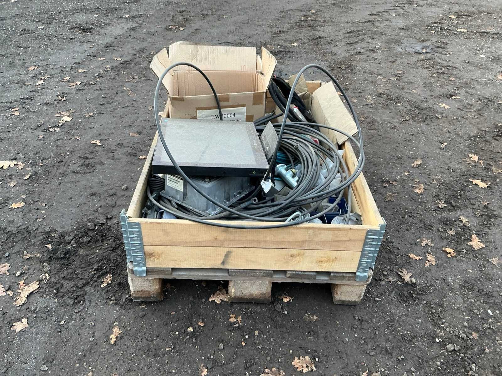 Krat met diverse leidingen, stekkers , computer scherm, regelkast, Merk: Krat met diverse leidingen en stekkers Totale afmeting L: 1200mm Totale afmeting Breedte: 800mm Totale afmeting Hoogte: 500mm