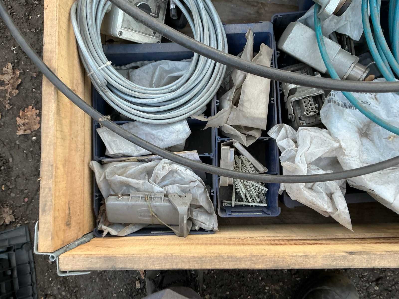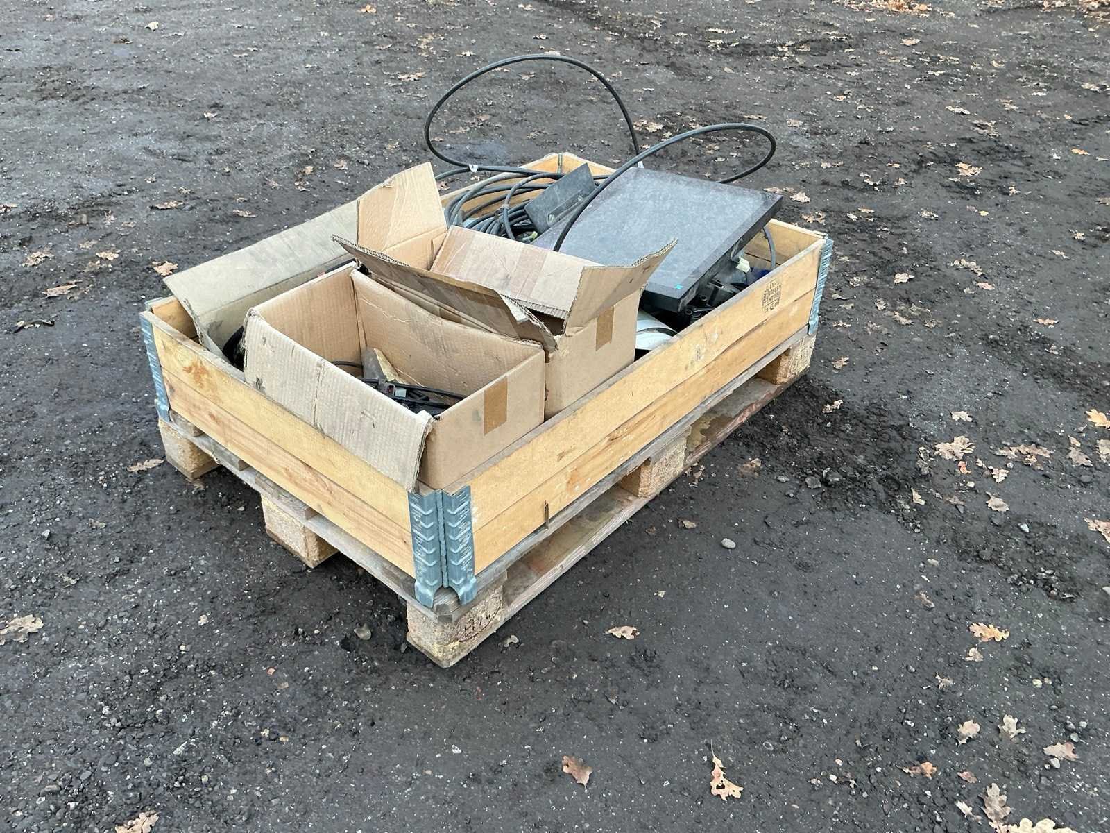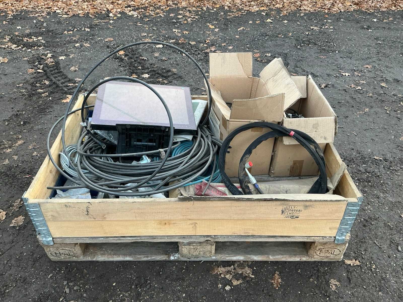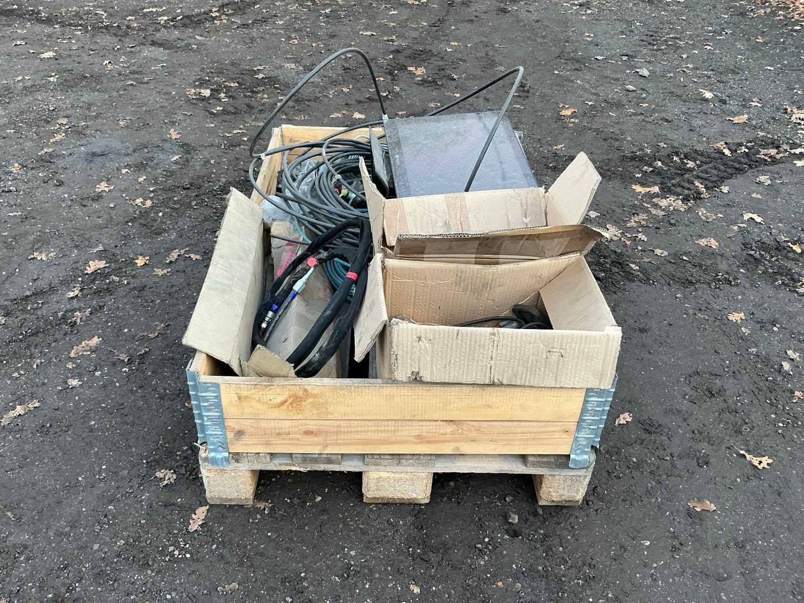 Krat met diverse leidingen, stekkers , computer scherm, regelkast, Merk: Krat met diverse leidingen en stekkers Totale afmeting L: 1200mm Totale afmeting Breedte: 800mm Totale afmeting Hoogte: 500mm