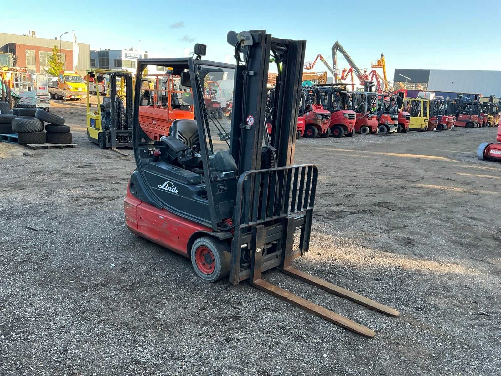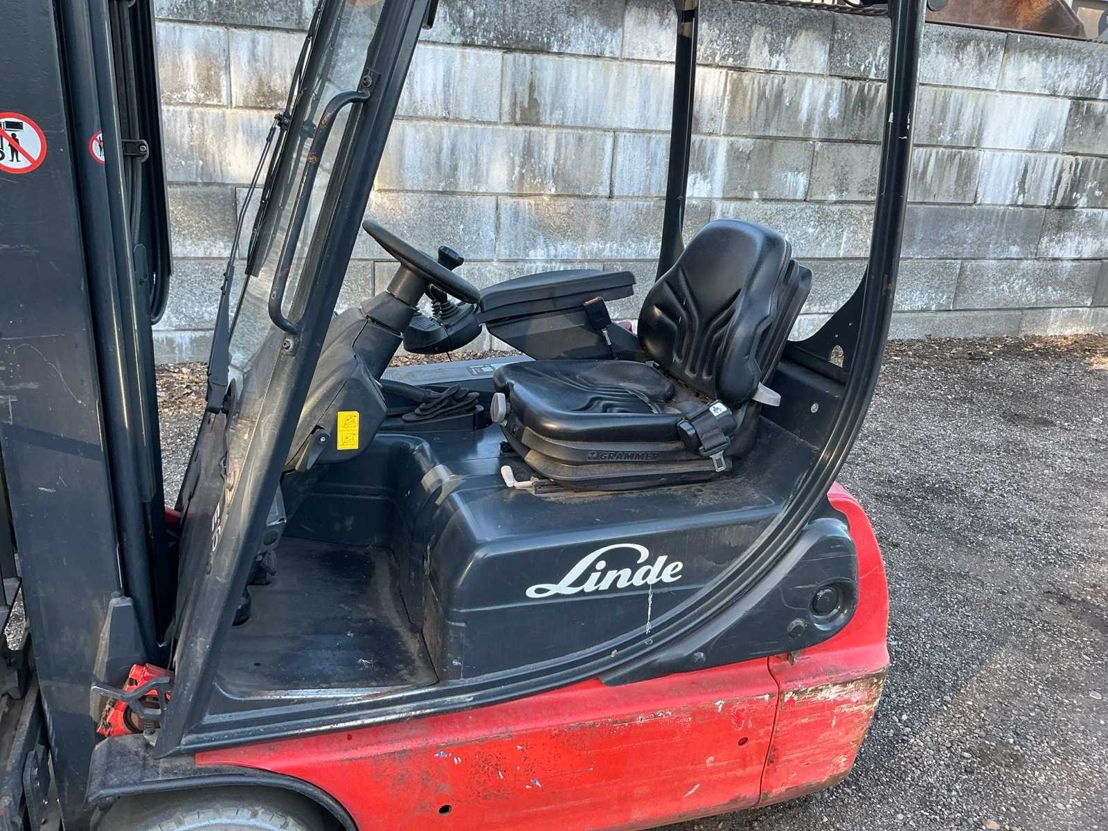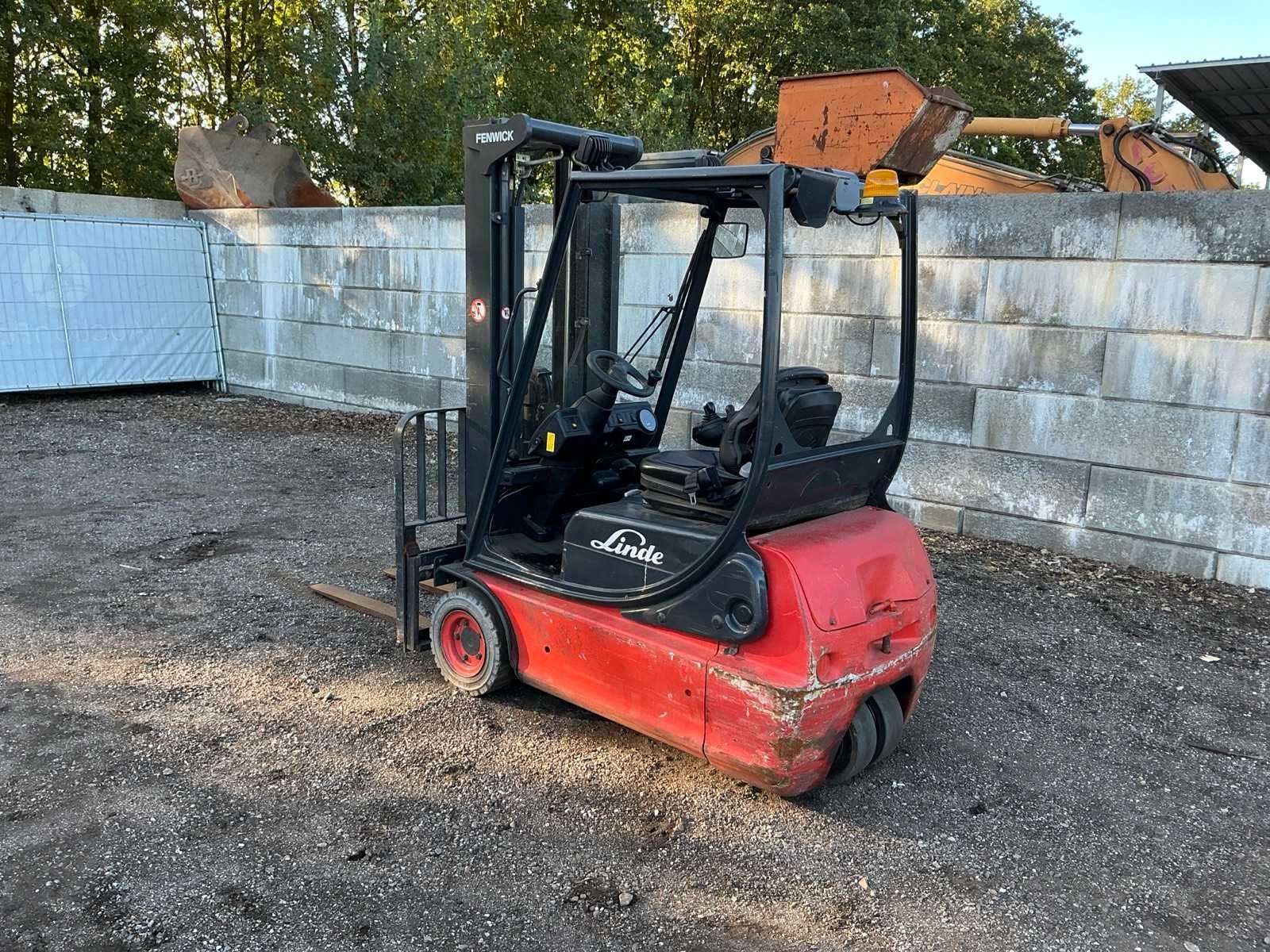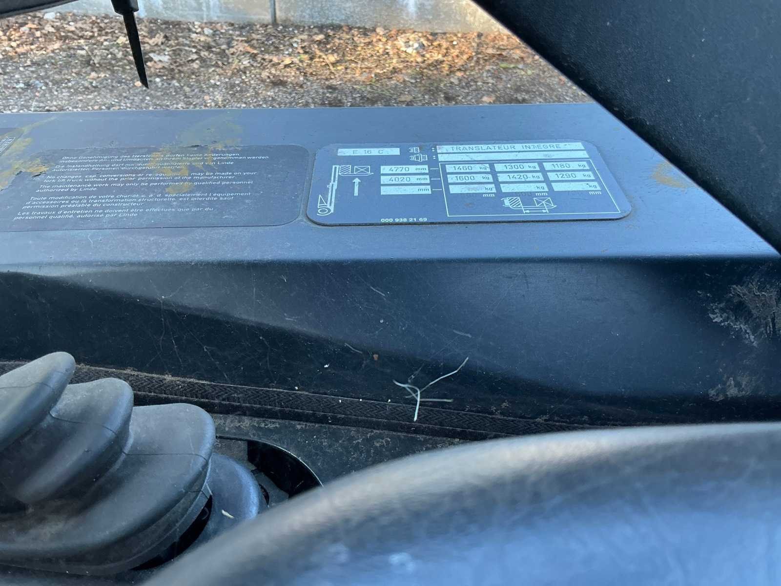 Lastrek,led werkverlichting, trekpin, geen lader, accu leeg, 48 volt accupakket, cabine zit vast in de vergrendeling Merk: Linde Type: E16 C02 Bouwjaar: 2003 Serienummer: H2X335P01229 Brandstof: Elektrisch Mast: Triple Soort band: Volrubber banden Aantal wielen: 4 Free-lift: true Side-shift: true Triple mast: true Eigen gewicht: 2350kg Hefvermogen: 1600kg Lepellengte: 1100mm Hefhoogte: 4770mm Vol rubber banden: true Totale afmeting L: 3000mm Totale afmeting Breedte: 1080mm Totale afmeting Hoogte: 2200mm