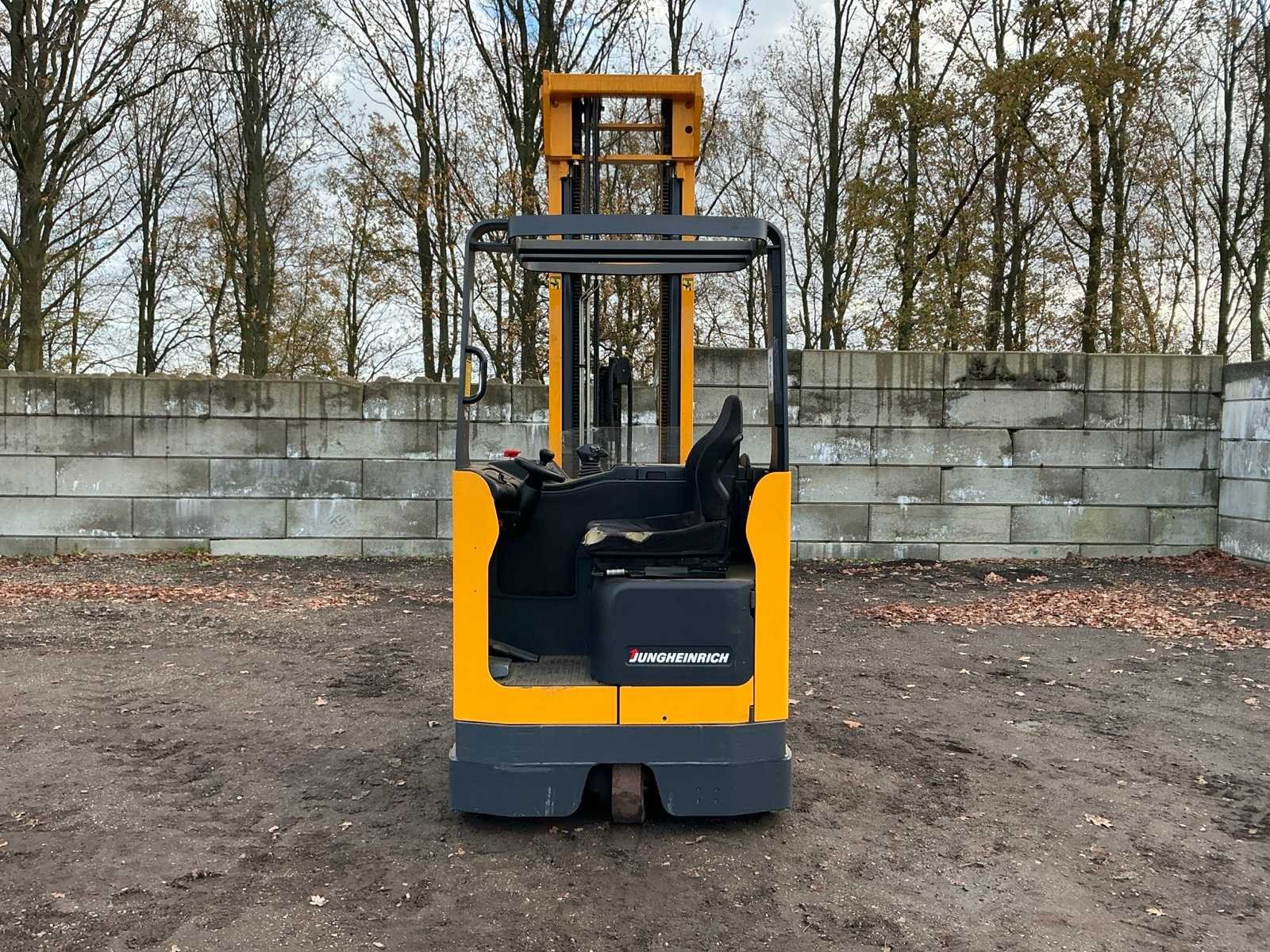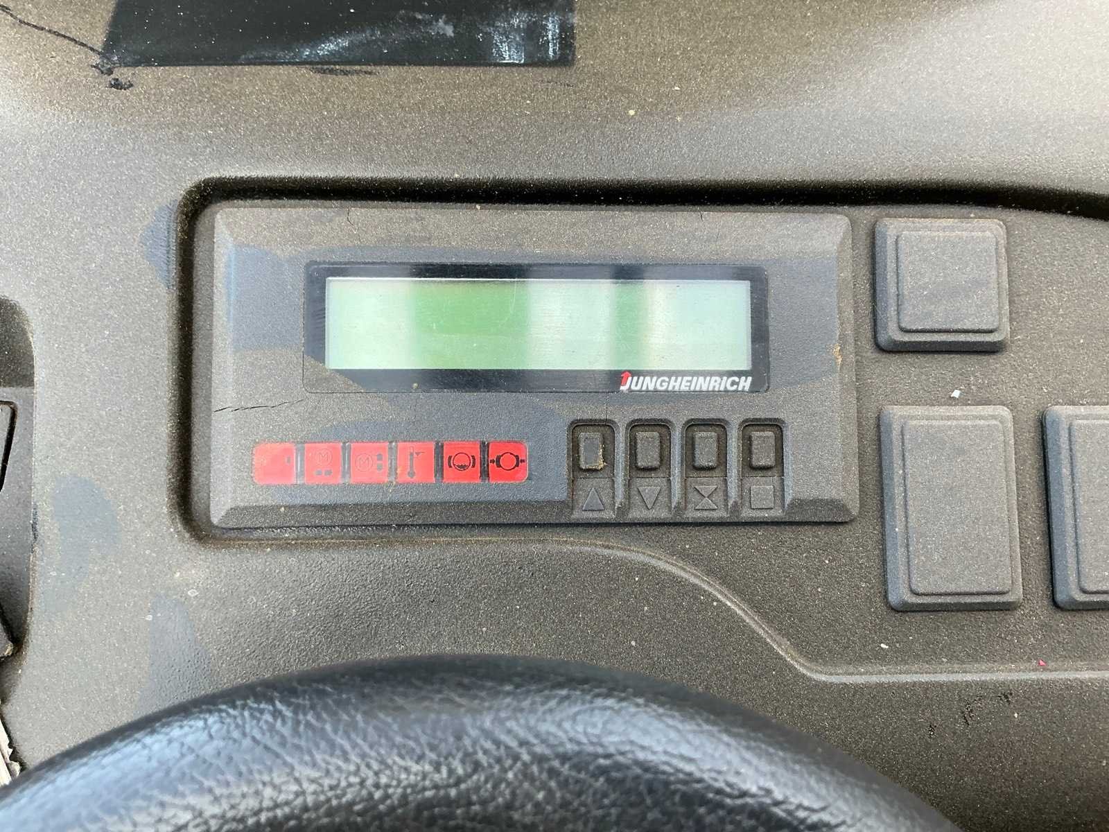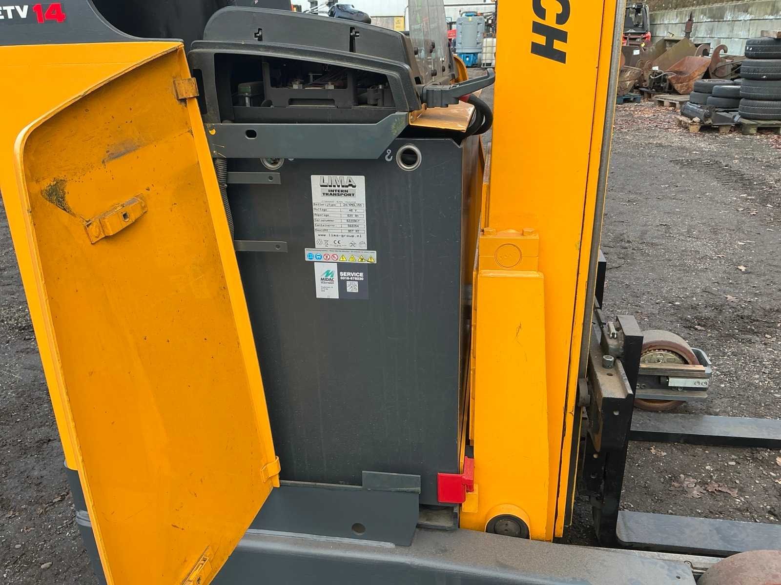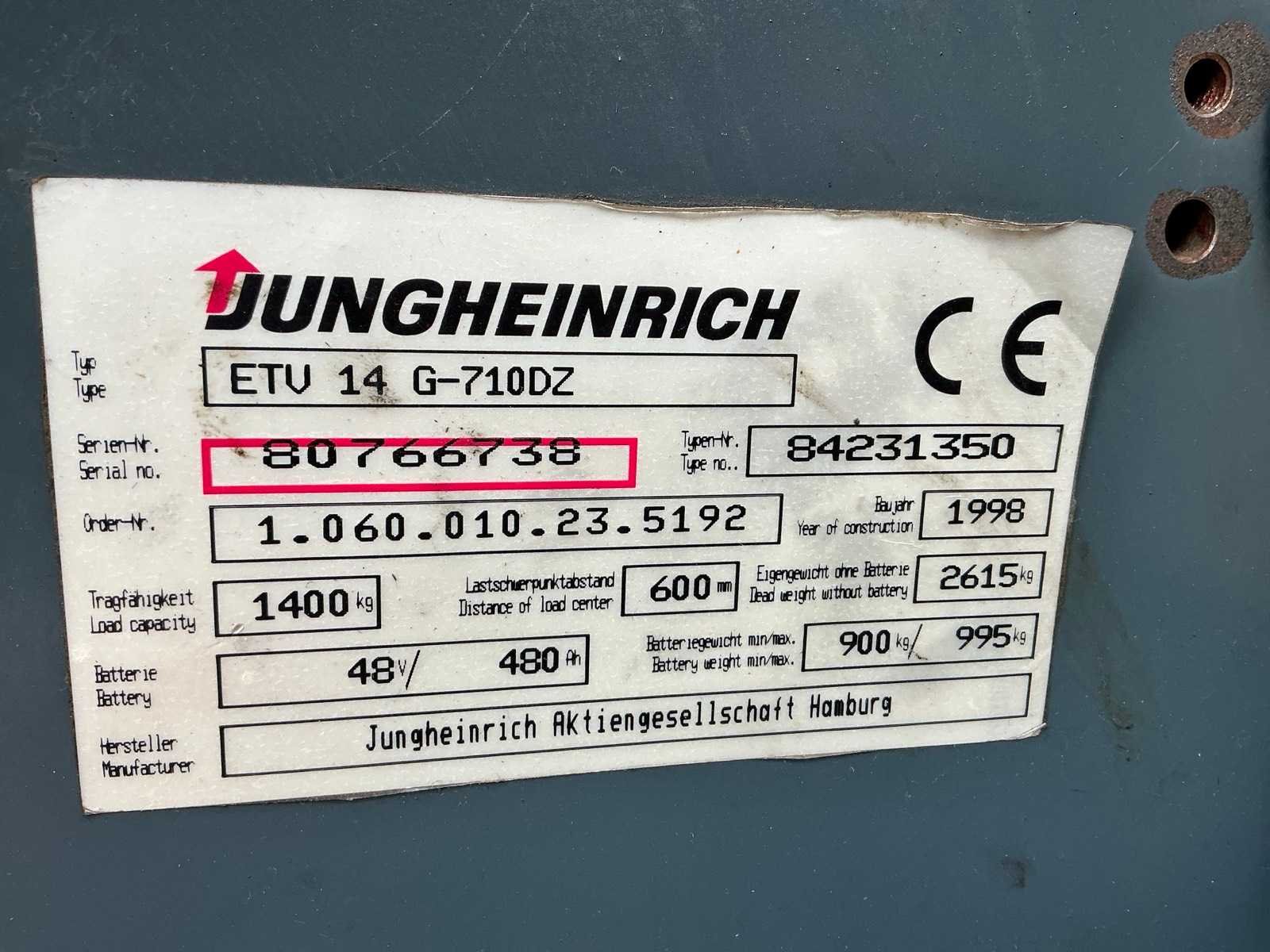 Lepels 1150mm, lepelbord 940mm, free lift, ergo joystick, 48V accupakket, Merk: Jungheinrich Type: ETV14 G-710DZ Bouwjaar: 1998 Serienummer: 80766738 Brandstof: Elektrisch Mast: Triplex Soort band: Vol rubber Aantal wielen: 3 Afgelezen urenstand: 8922 Free-lift: true Triple mast: true Eigen gewicht: 3610kg Hefvermogen: 1400kg Lepellengte: 1150mm Hefhoogte: 7100mm Minimale doorrijhoogte: 3000mm Totale afmeting L: 2500mm Totale afmeting Breedte: 1240mm Totale afmeting Hoogte: 2950mm Elektrisch: true Vol rubber banden: true