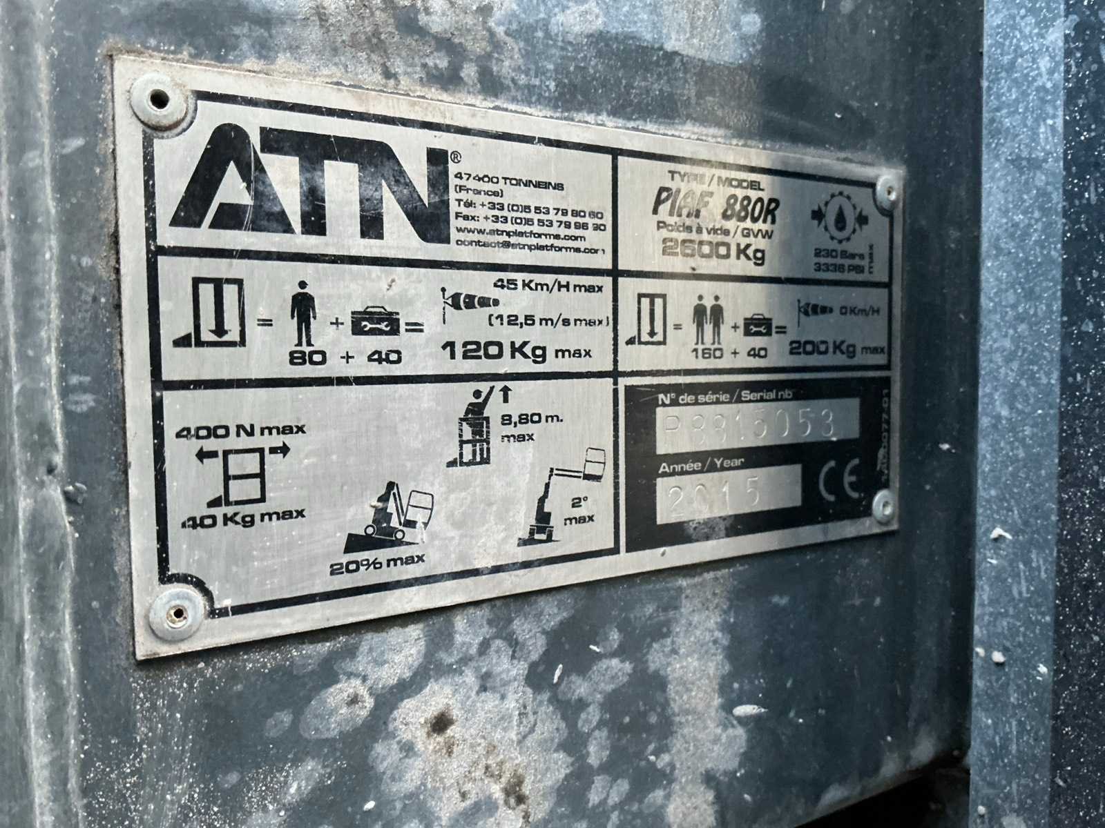 Ingebouwde lader, roterende opbouw, max hefhoogte 8800mm, max hefvermogen 200kg Merk: ATN Type: PIAF 880R Bouwjaar: 2015 Serienummer: P8815053 Elektrisch: true Masthoogwerker: true Werkhoogte: 8800mm Plateau afm. l: 800mm Plateau afm. b: 1000mm Platform capaciteit: 200kg Eigen gewicht: 2600kg Totale afmeting L: 2800mm Totale afmeting Breedte: 1020mm Totale afmeting Hoogte: 2000mm