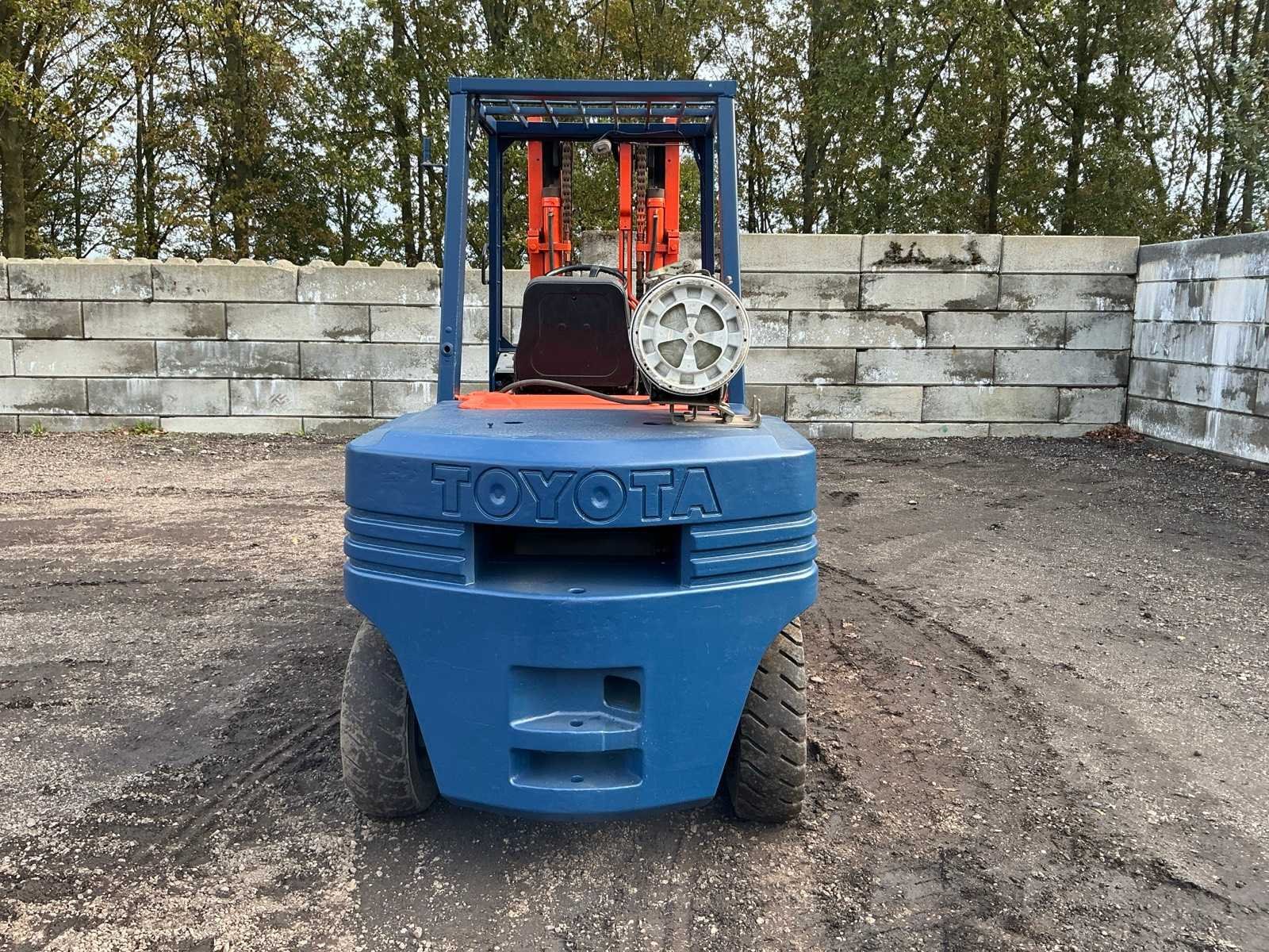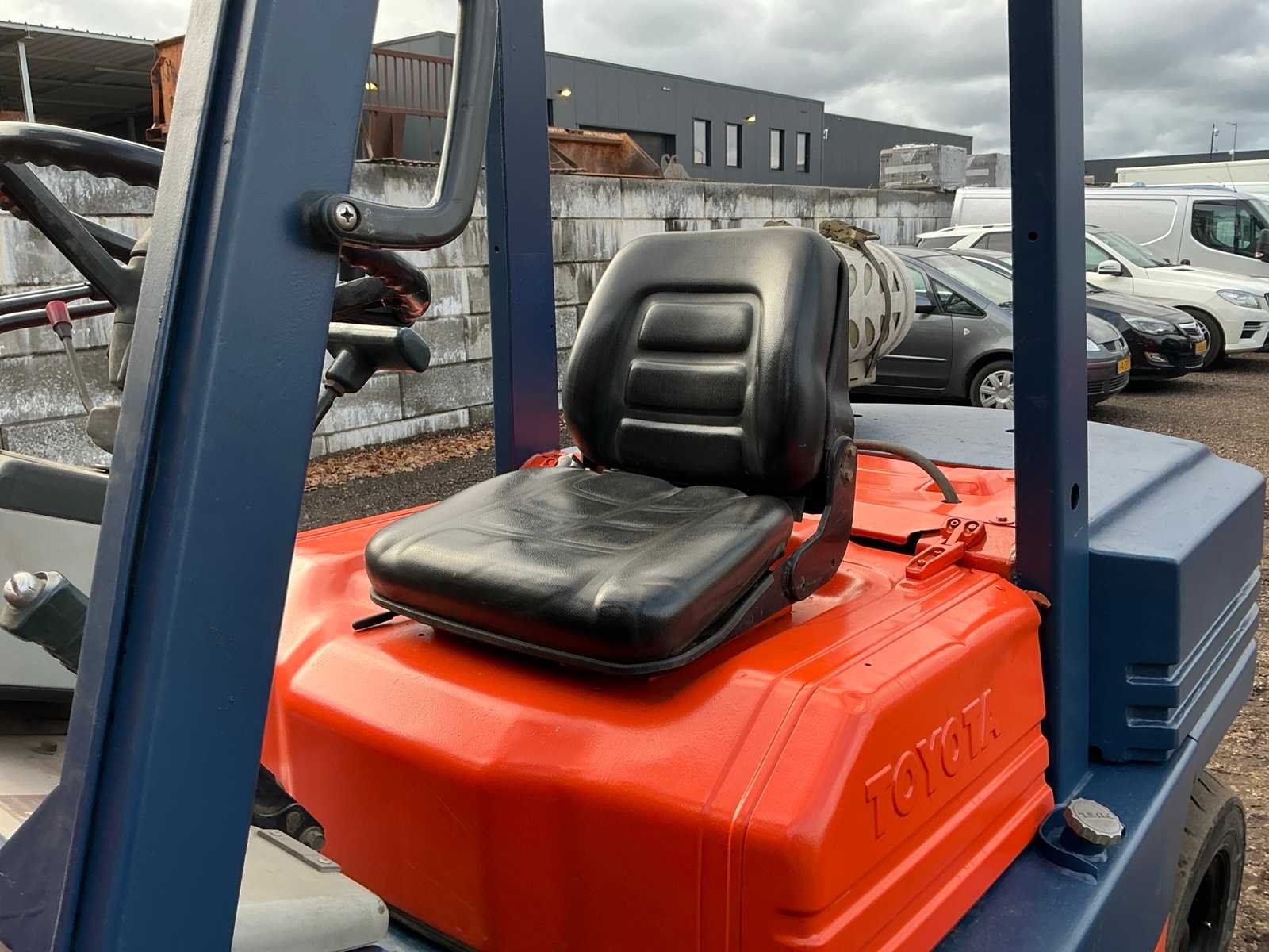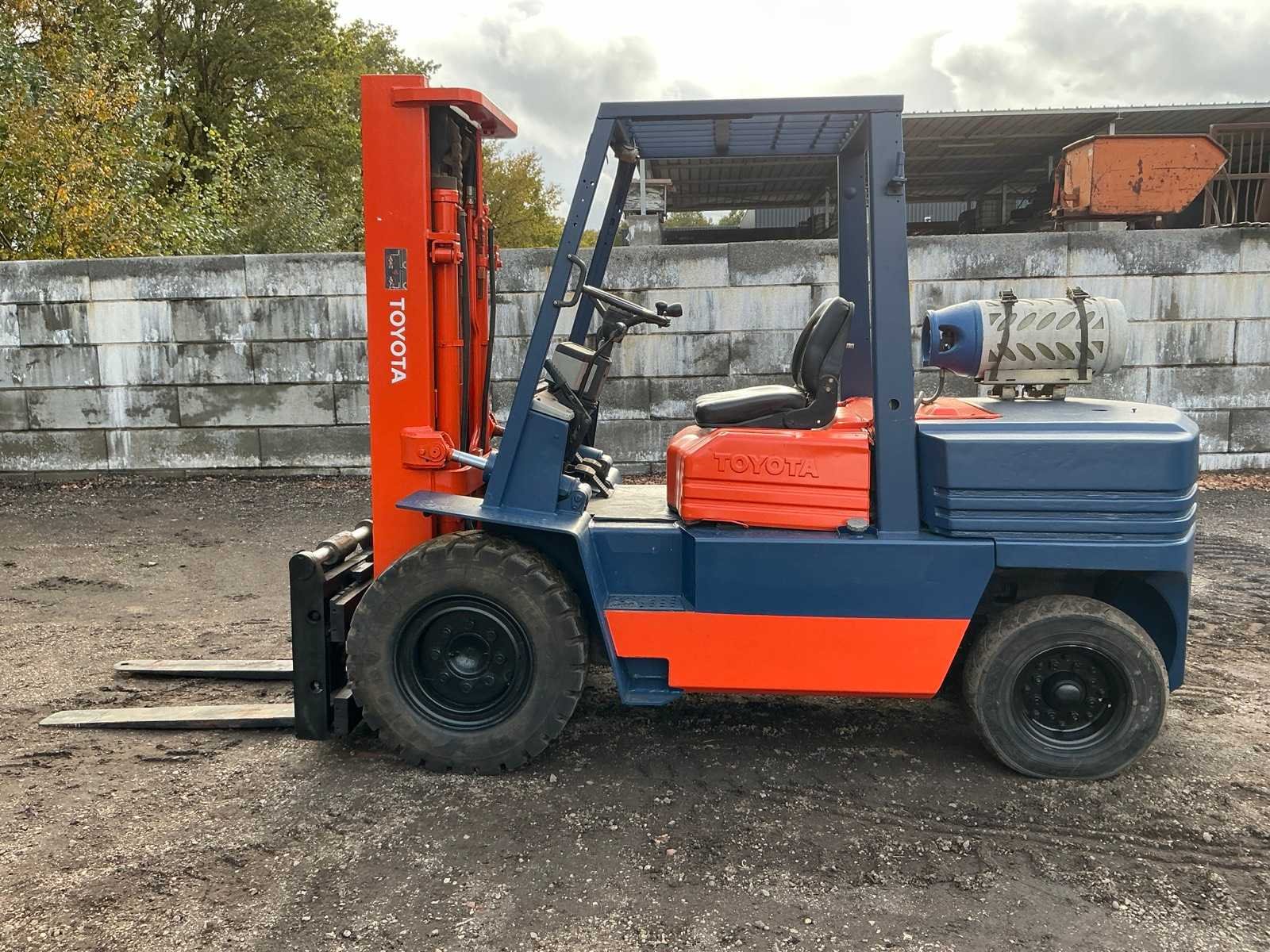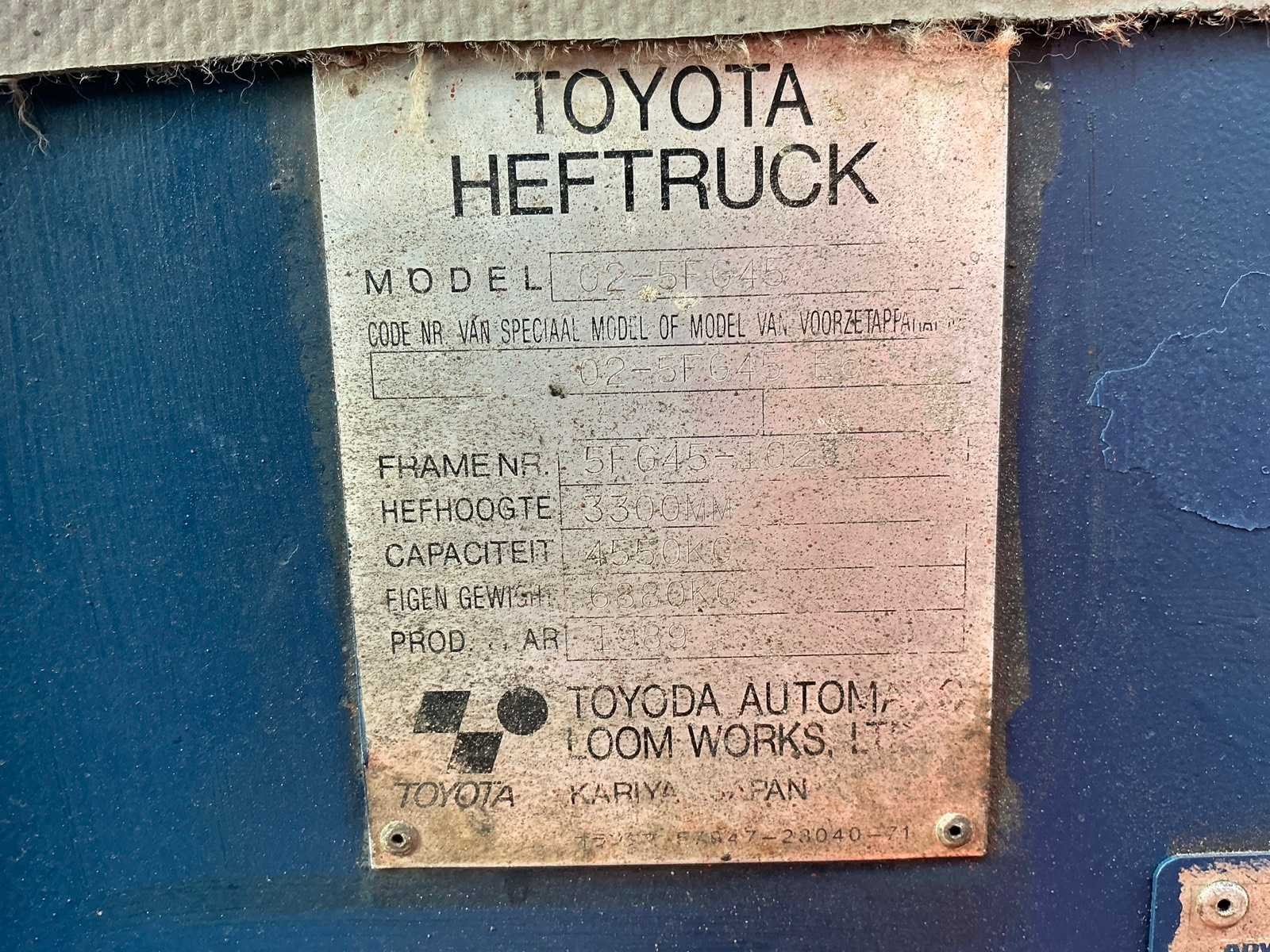2 Rijsnelheden vooruit, Lepels 1200mm, lepelbord 1300mm, lepel spreider, duplex mast, trekoog achter, max hefhoogte 3700mm, max hefvermogen 4500kg Merk: Toyota Type: 02-5FG045 Bouwjaar: 1989 Serienummer: 5FG451023 Brandstof: LPG Mast: Duplex Soort band: Luchtbanden Aantal wielen: 4 Afgelezen urenstand: 15404 Eigen gewicht: 6880kg Hefvermogen: 4500kg Lepellengte: 1200mm Max. hefhoogte: 3700mm Luchtbanden: true Minimale doorrijhoogte: 2500mm Totale afmeting L: 4400mm Totale afmeting Breedte: 1430mm Totale afmeting Hoogte: 2450mm