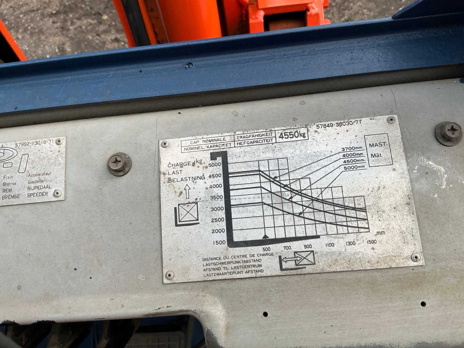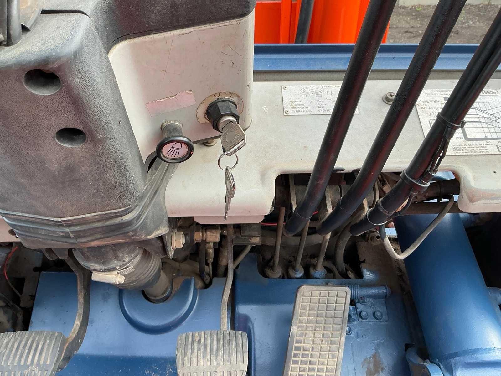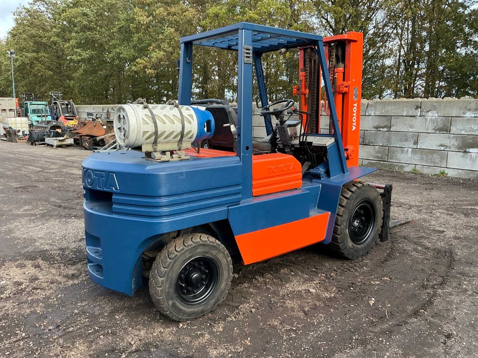 2 Rijsnelheden vooruit, Lepels 1200mm, lepelbord 1300mm, lepel spreider, duplex mast, trekoog achter, max hefhoogte 3700mm, max hefvermogen 4500kg Merk: Toyota Type: 02-5FG045 Bouwjaar: 1989 Serienummer: 5FG451023 Brandstof: LPG Mast: Duplex Soort band: Luchtbanden Aantal wielen: 4 Afgelezen urenstand: 15404 Eigen gewicht: 6880kg Hefvermogen: 4500kg Lepellengte: 1200mm Max. hefhoogte: 3700mm Luchtbanden: true Minimale doorrijhoogte: 2500mm Totale afmeting L: 4400mm Totale afmeting Breedte: 1430mm Totale afmeting Hoogte: 2450mm