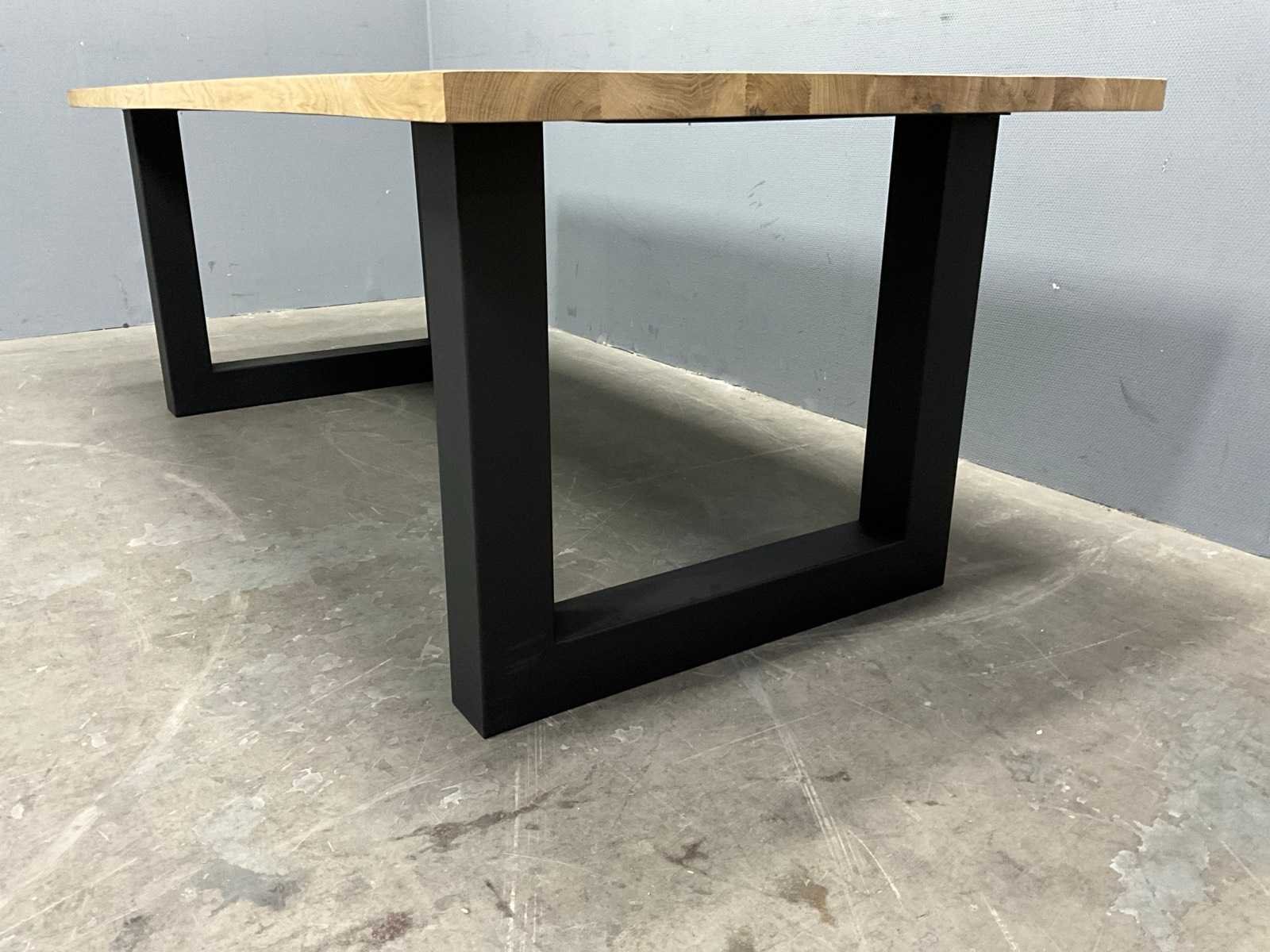 Met zwart metalen vierkante poten. Model: Rechthoek Product type: Eiken Lengte: 220cm Breedte: 100cm Hoogte: 75cm