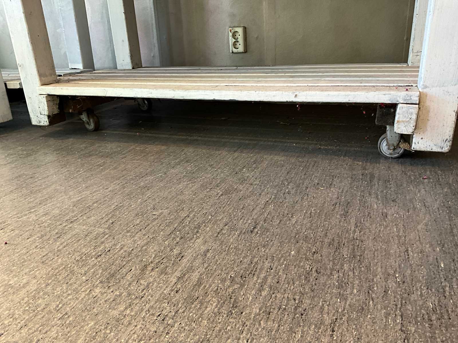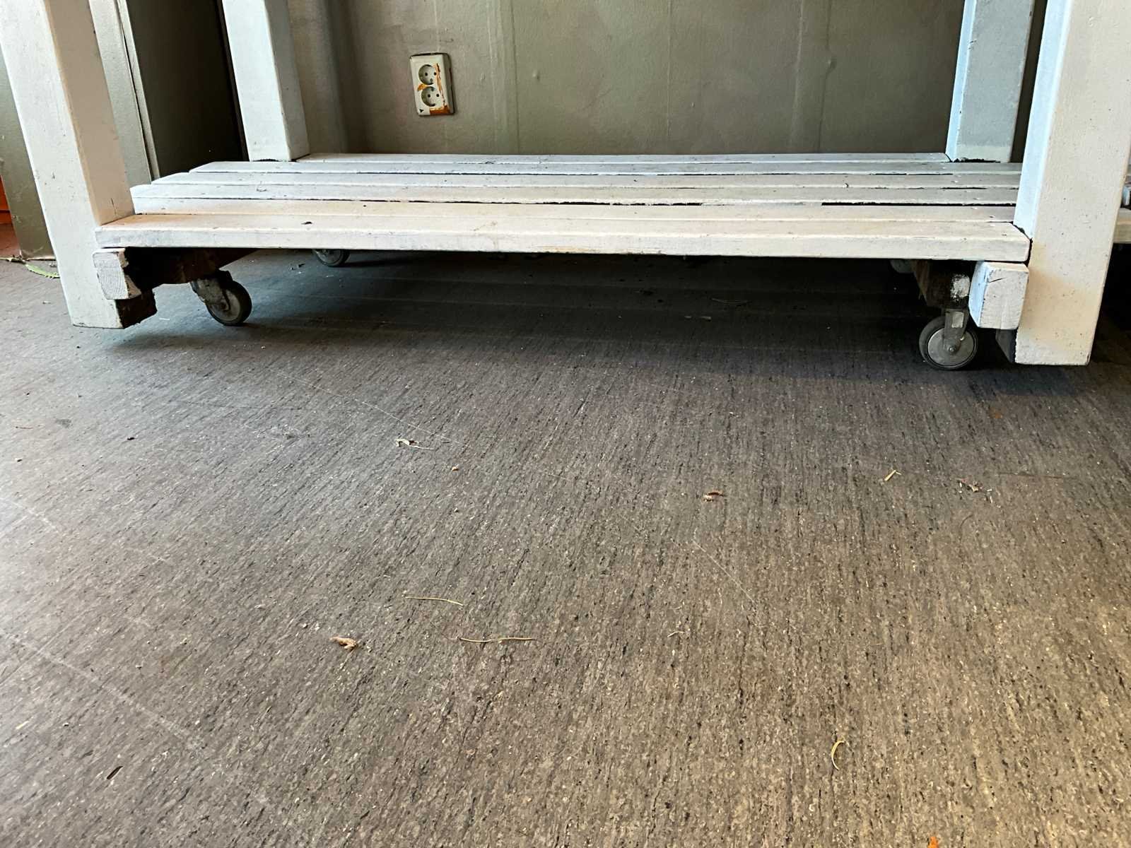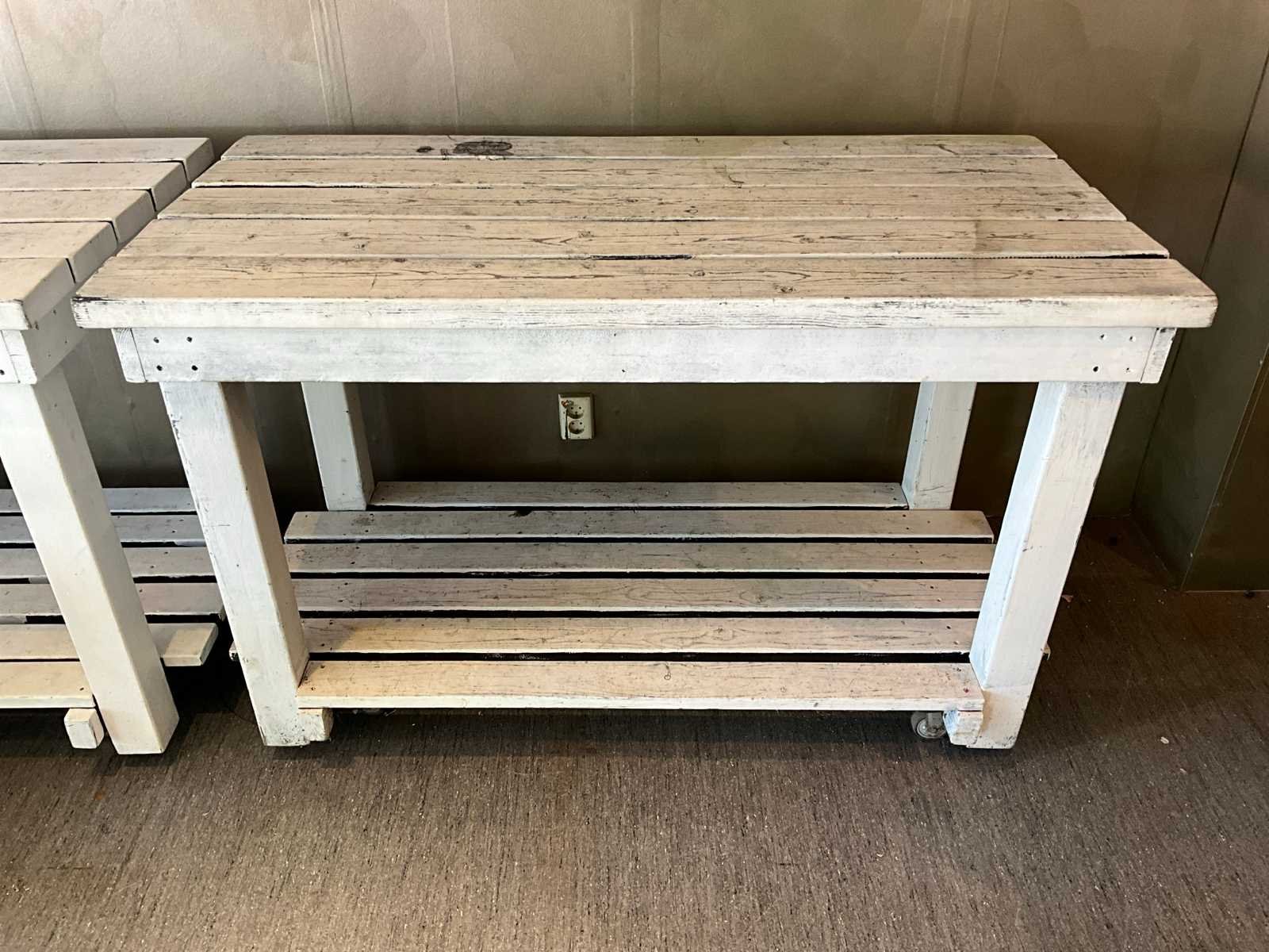 Twee hoge mobiele tafels van 150x76x96 cm ; één toonbank 120x40x64 cm; één tafel 110x48x74 cm