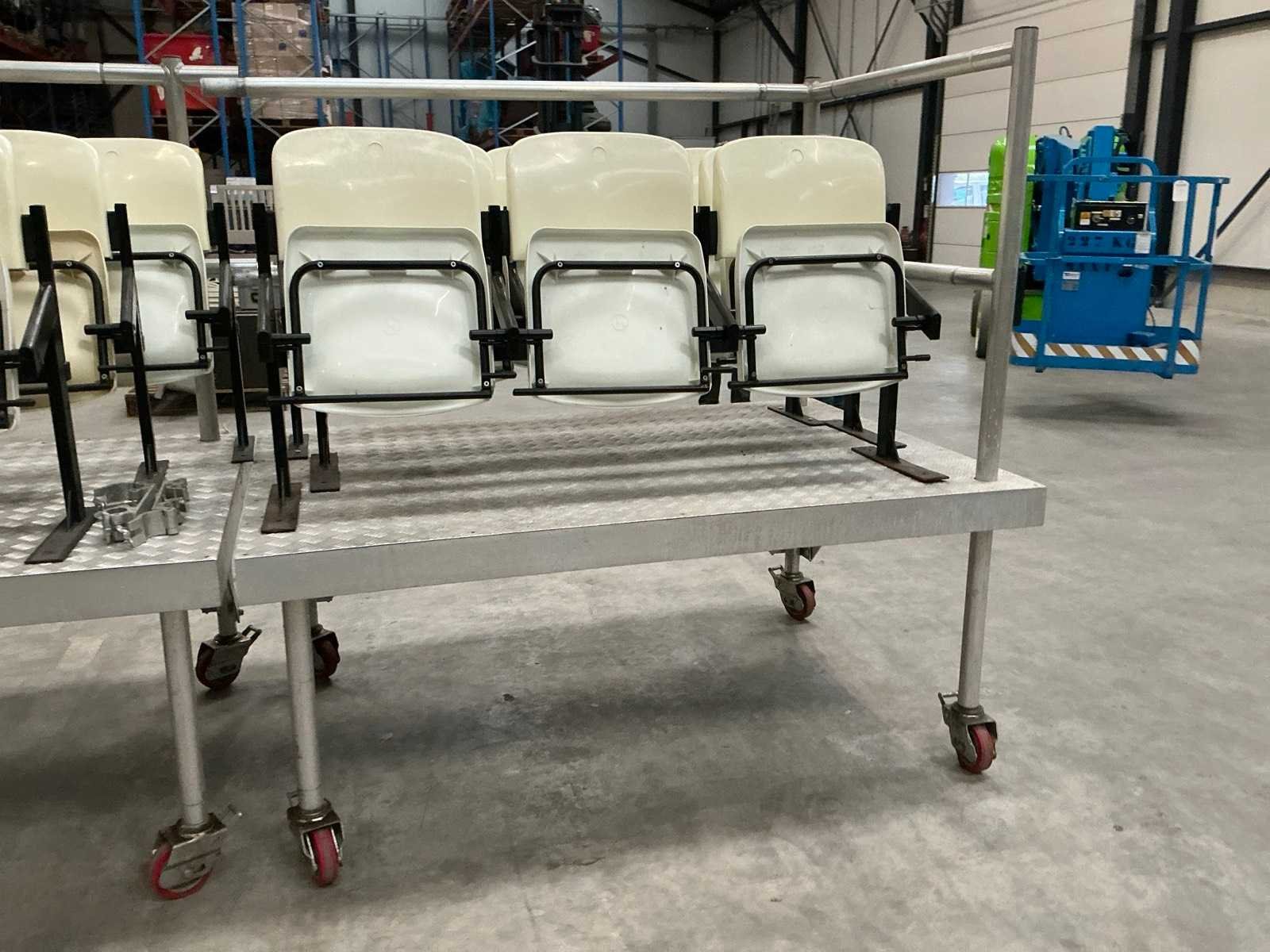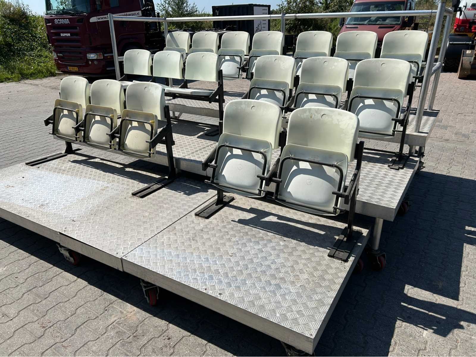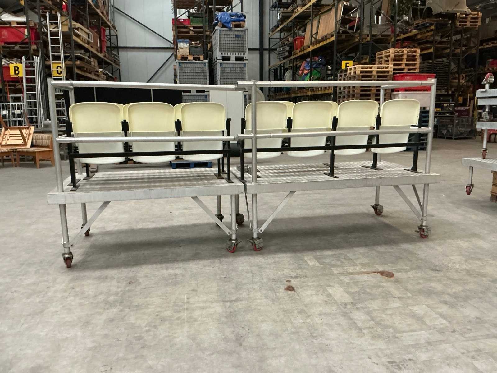1x mobiele tribune 215x122x177 cm; 1x mobiele tribune 180x122x177 cm; 1x mobiele tribune 185x115x54 cm; 1x mobiele tribune 150x115x54 cm; 1x mobiele tribune 150x115x34 cm; 1x mobiele tribune 120x115x34 cm; stoelmodule 3 zitplaatsen; 1x stoelmodule 2 zitplaatsen; 1x stoelmodule 4 zitplaatsen; Aantal zitplaatsen: 18 Modulair: true Opklapbaar: true