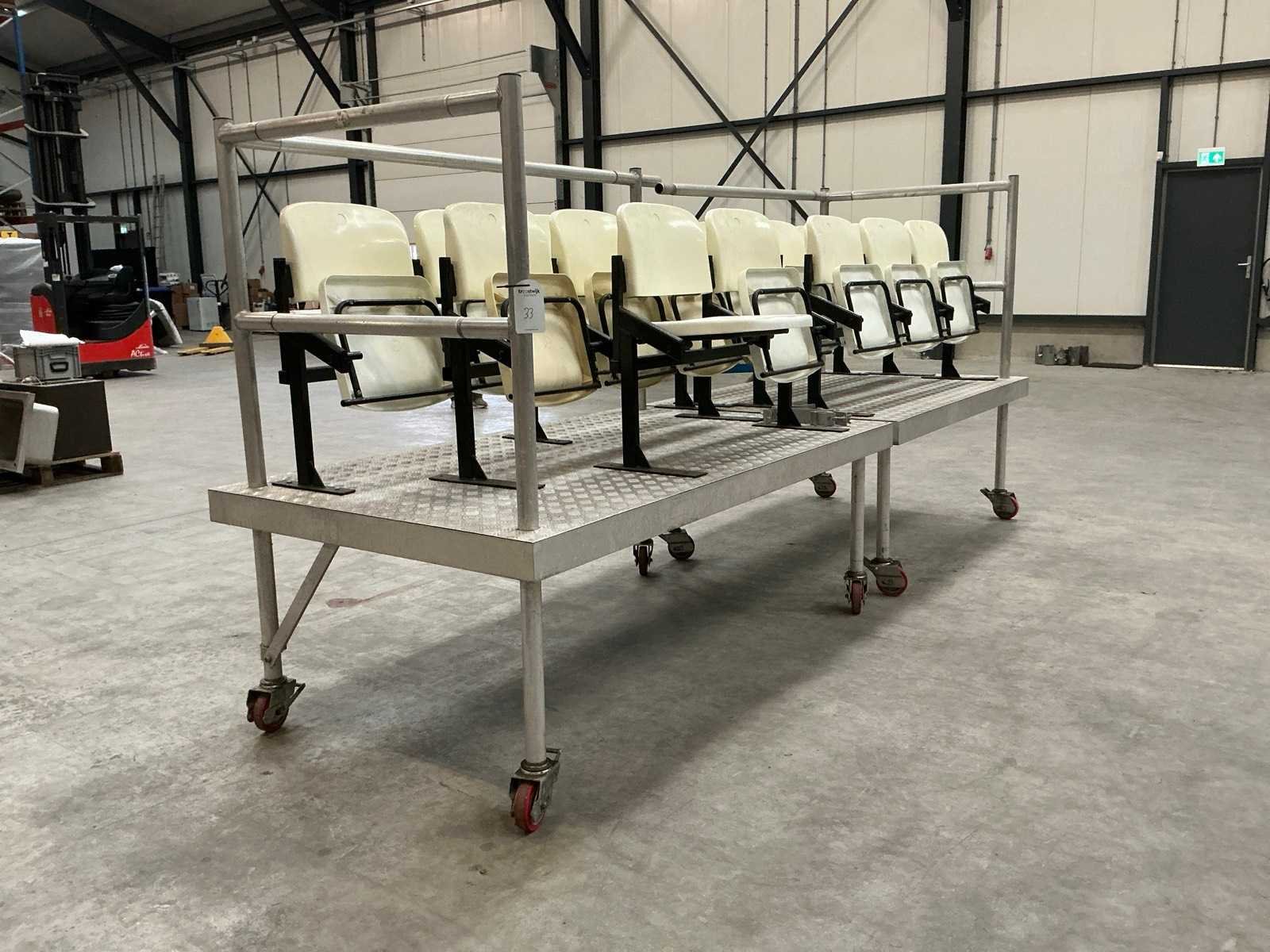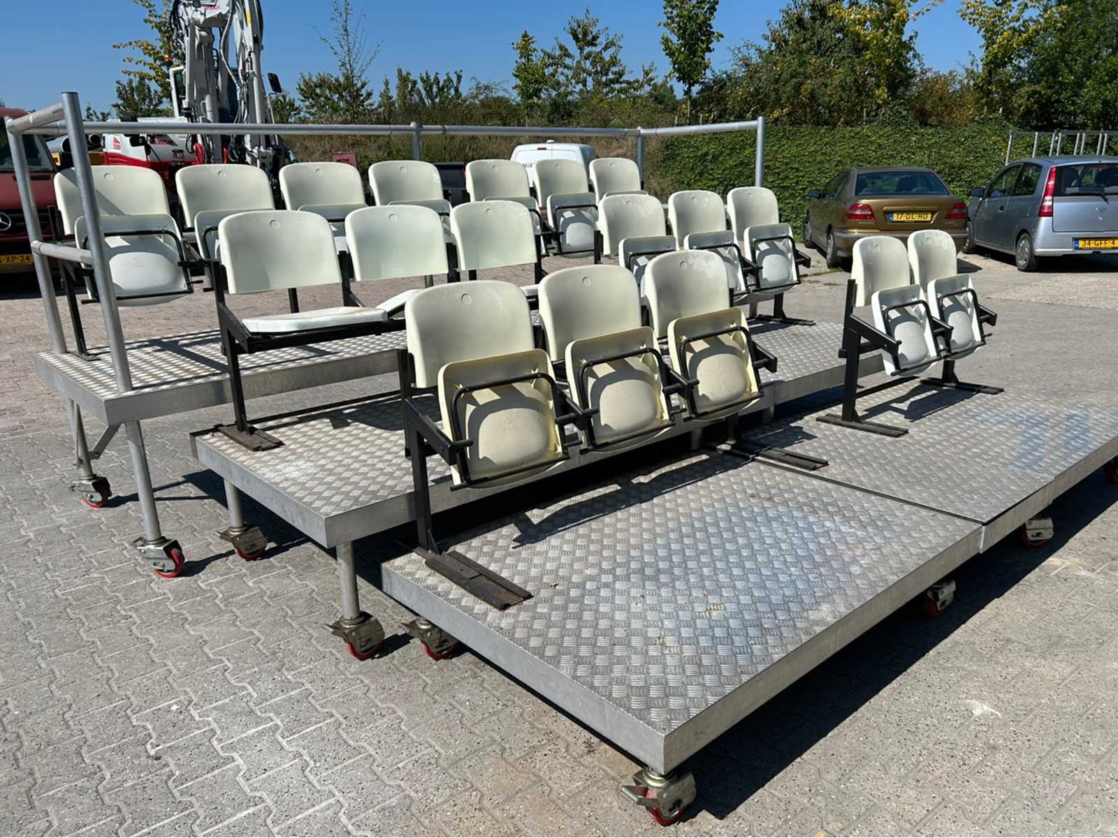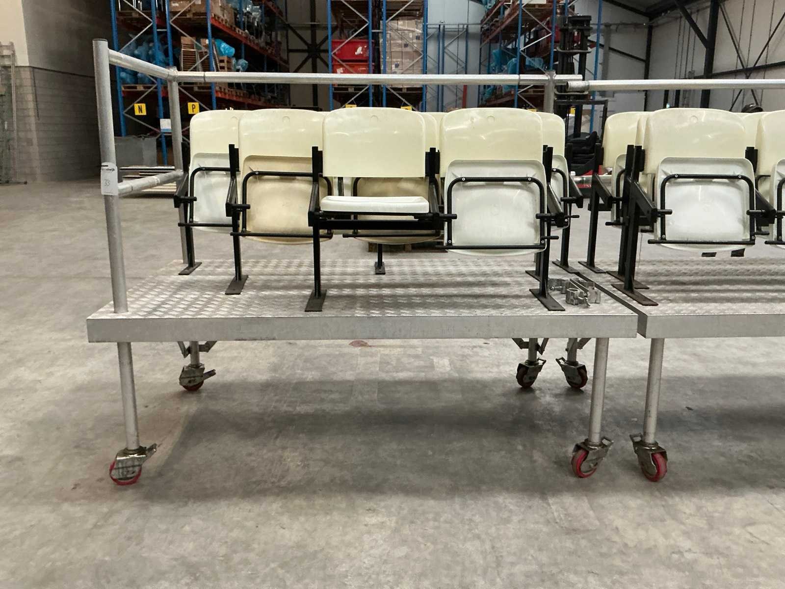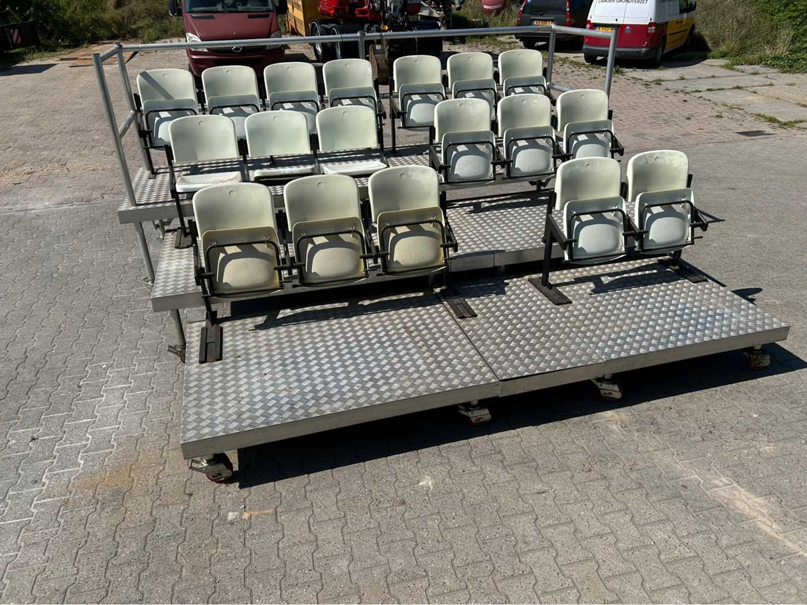 1x mobiele tribune 215x122x177 cm; 1x mobiele tribune 180x122x177 cm; 1x mobiele tribune 185x115x54 cm; 1x mobiele tribune 150x115x54 cm; 1x mobiele tribune 150x115x34 cm; 1x mobiele tribune 120x115x34 cm; stoelmodule 3 zitplaatsen; 1x stoelmodule 2 zitplaatsen; 1x stoelmodule 4 zitplaatsen; Aantal zitplaatsen: 18 Modulair: true Opklapbaar: true