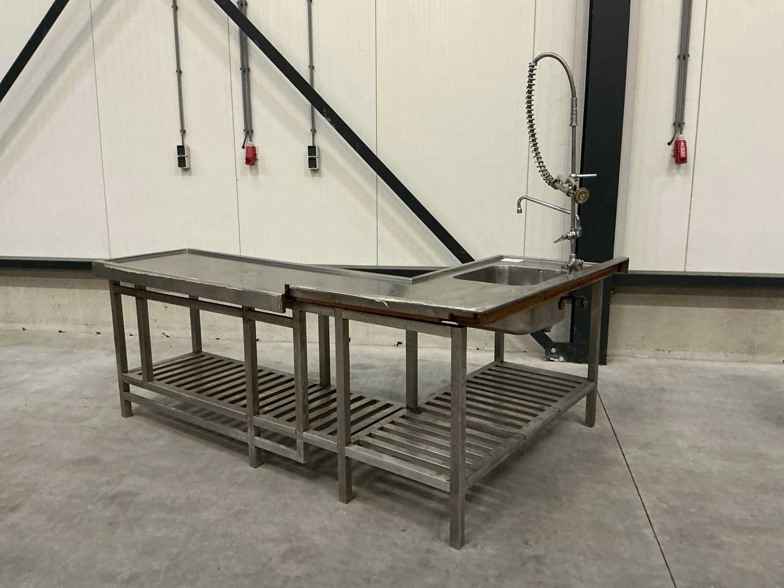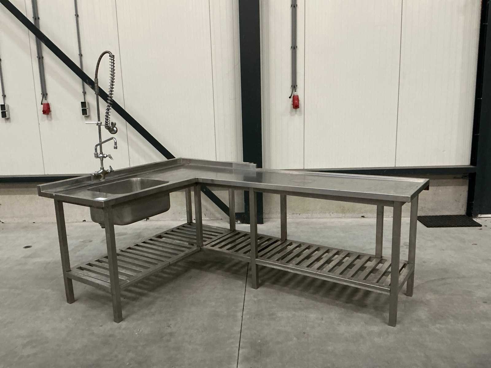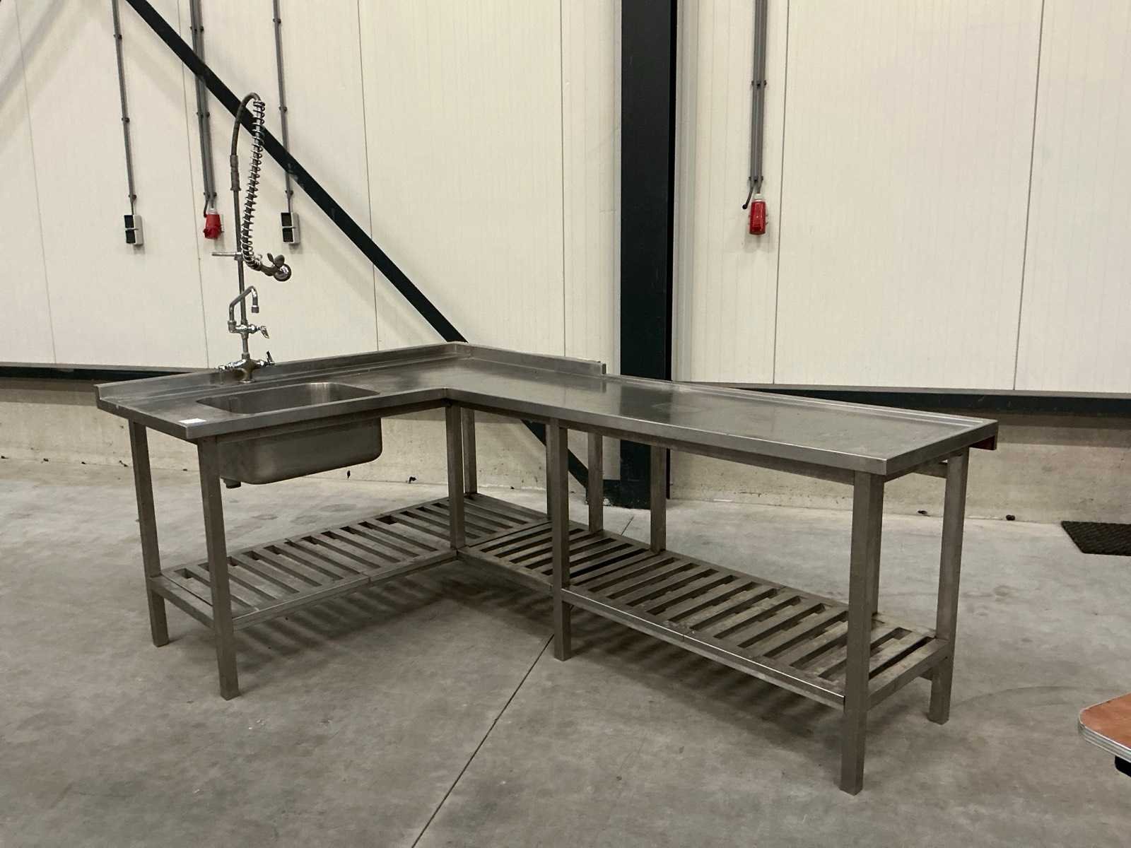 Hoekopstelling; spoelbak 50x40x25 cm; breedte spoeltafel 60 cm Aantal spoelbakken: 1pcs Rvs: true Lengte: 230cm Breedte: 148cm Hoogte: 86cm