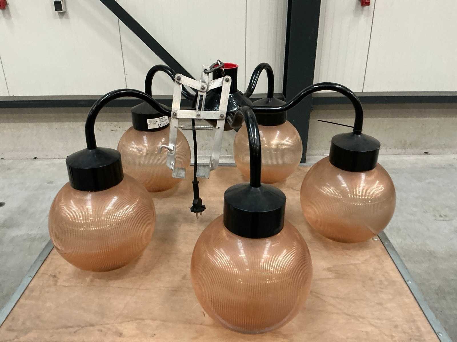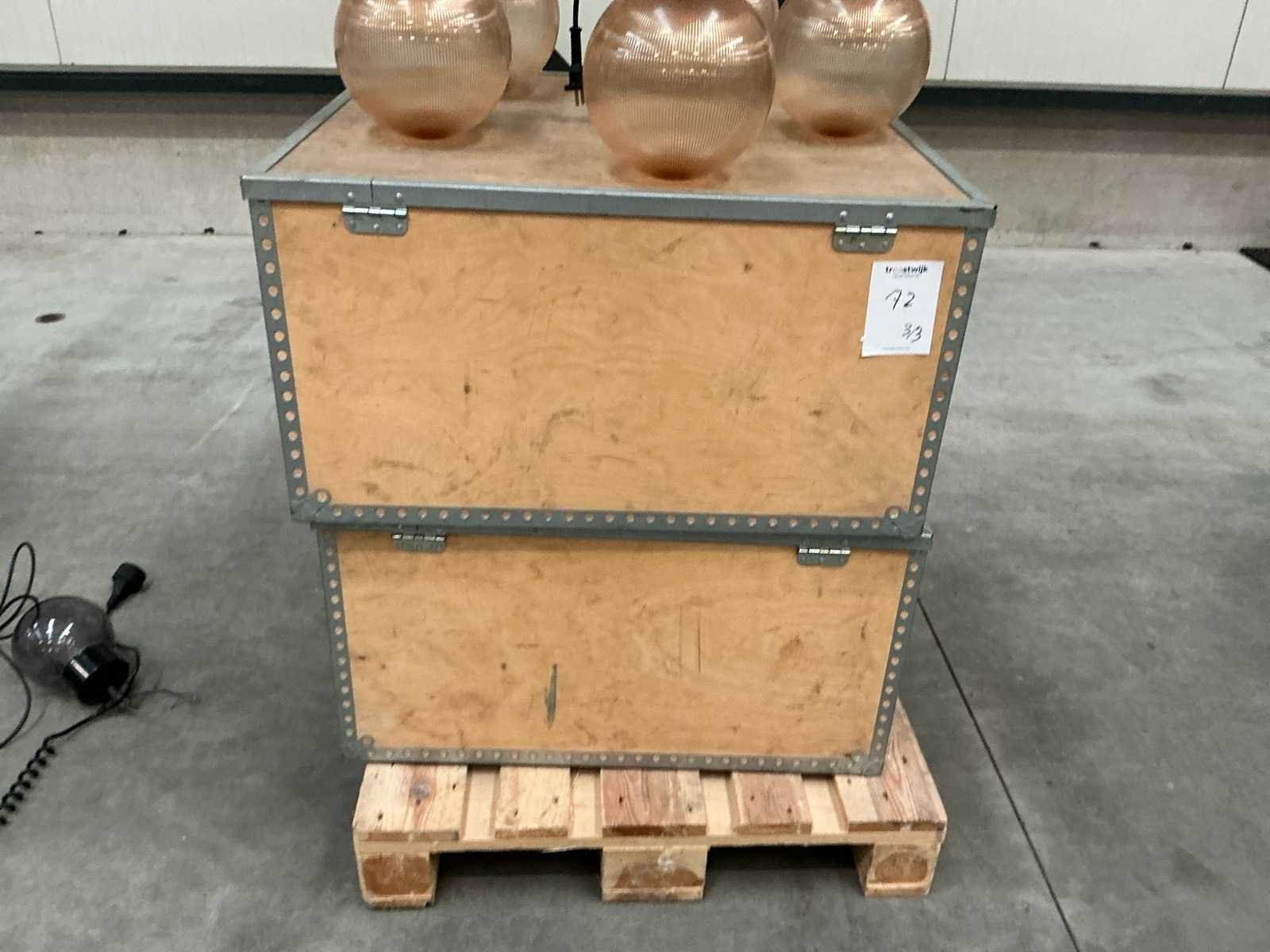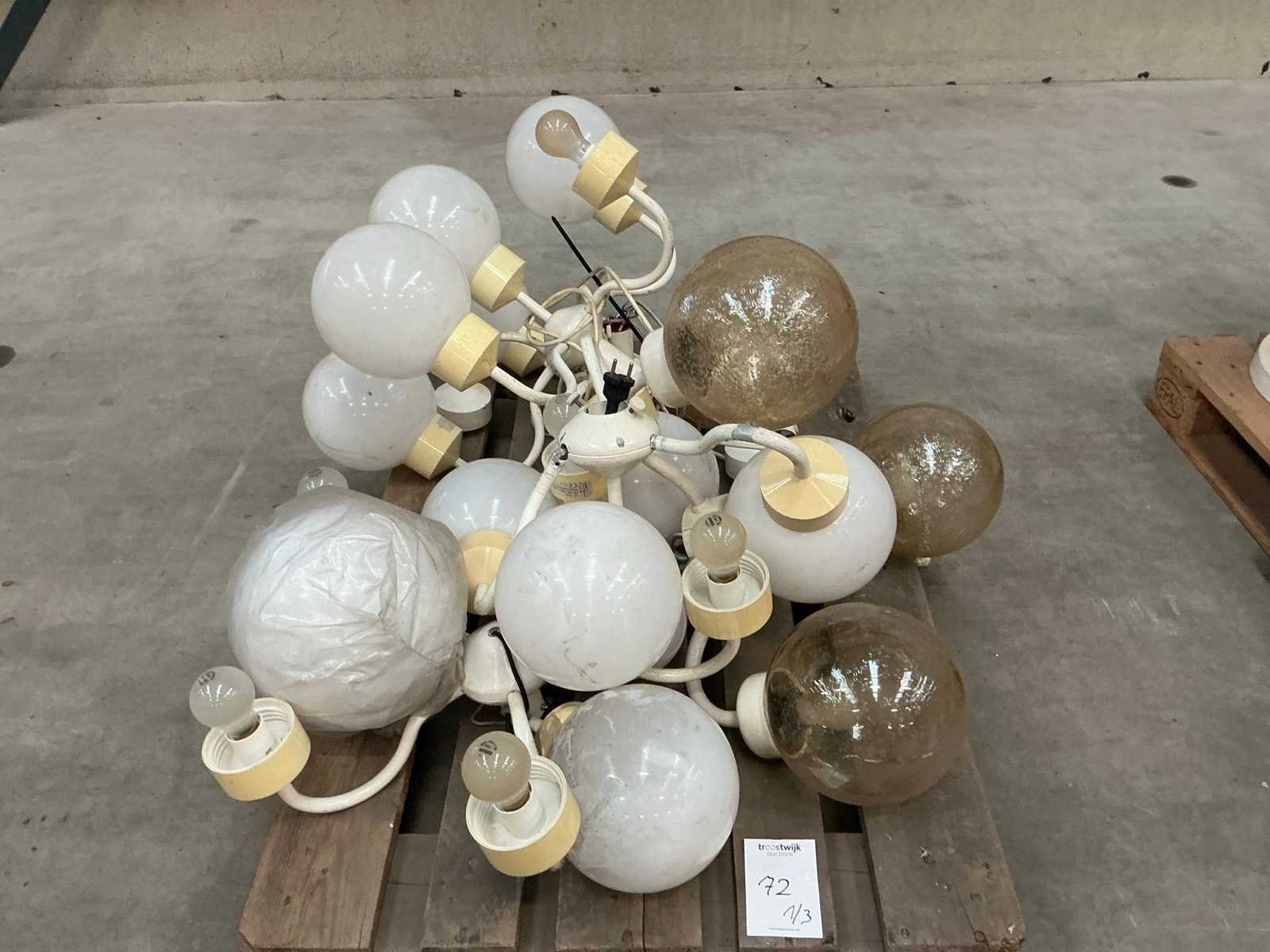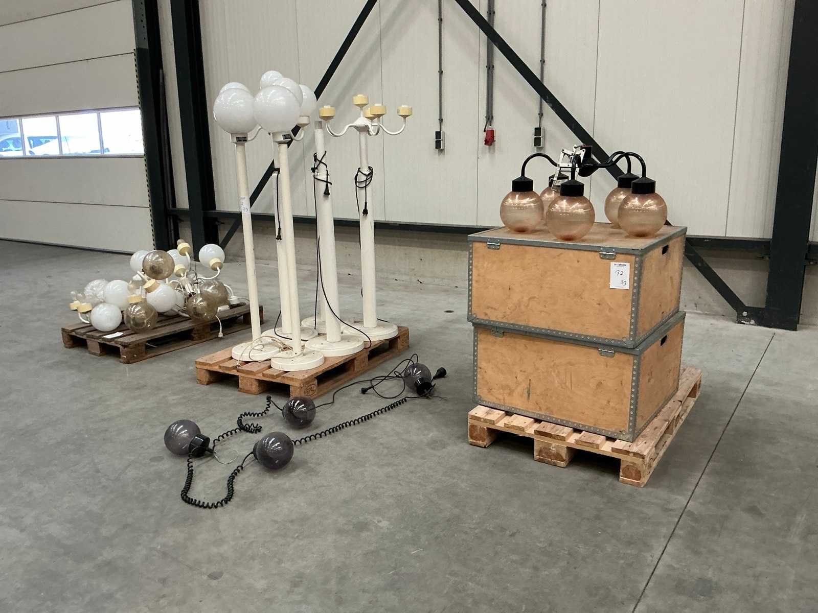 Waaronder 5x luchter wit; 6x staand model incompleet; 2x luchter goudkleurig in houten kist; 8x lampenketting koppelbaar (niet allemaal op foto).
